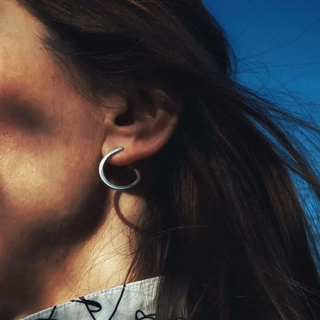 MNMLZM uz naušnice BENT. U tipu hoopsica, elegantno vas vode kroz dan. Jedan kraj nosi se naprijed, a drugi se skriva iza uha, pa ih taj suptilni detalj čini posebnima. Nosive na dva načina, tj. dvije strane.