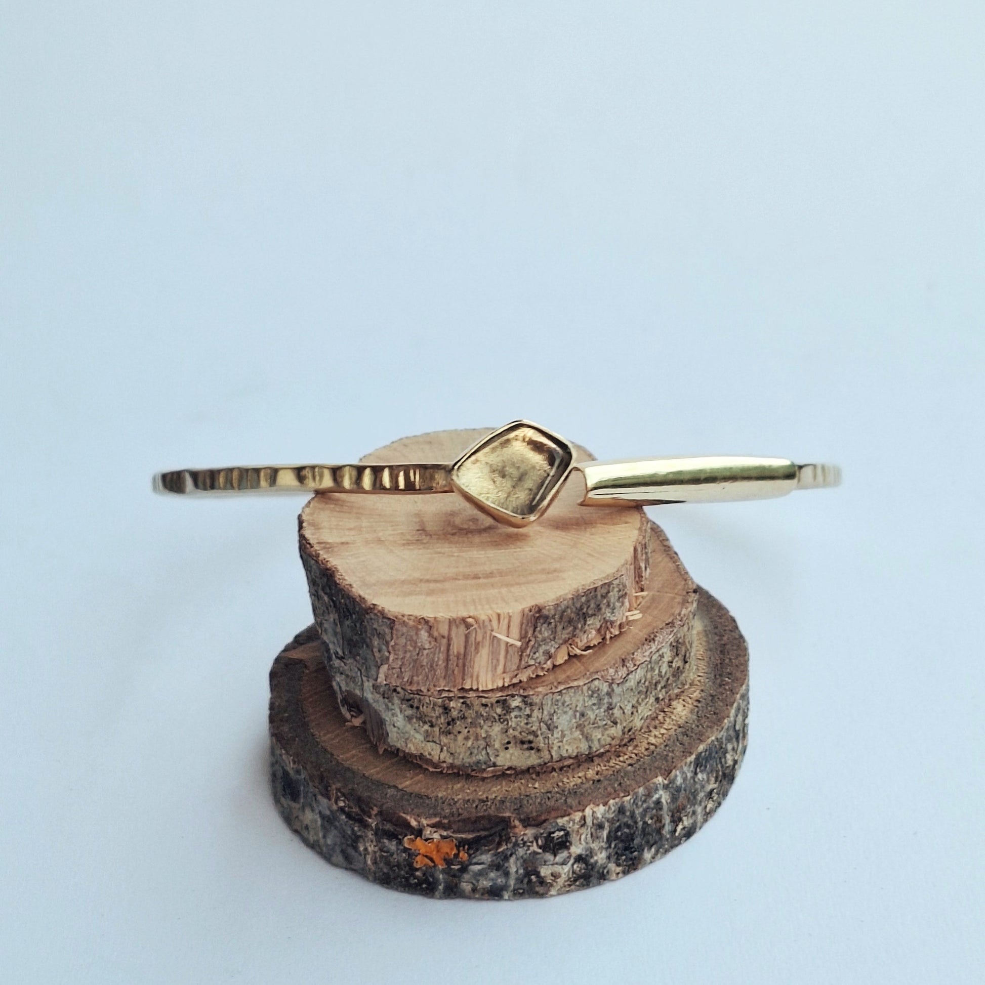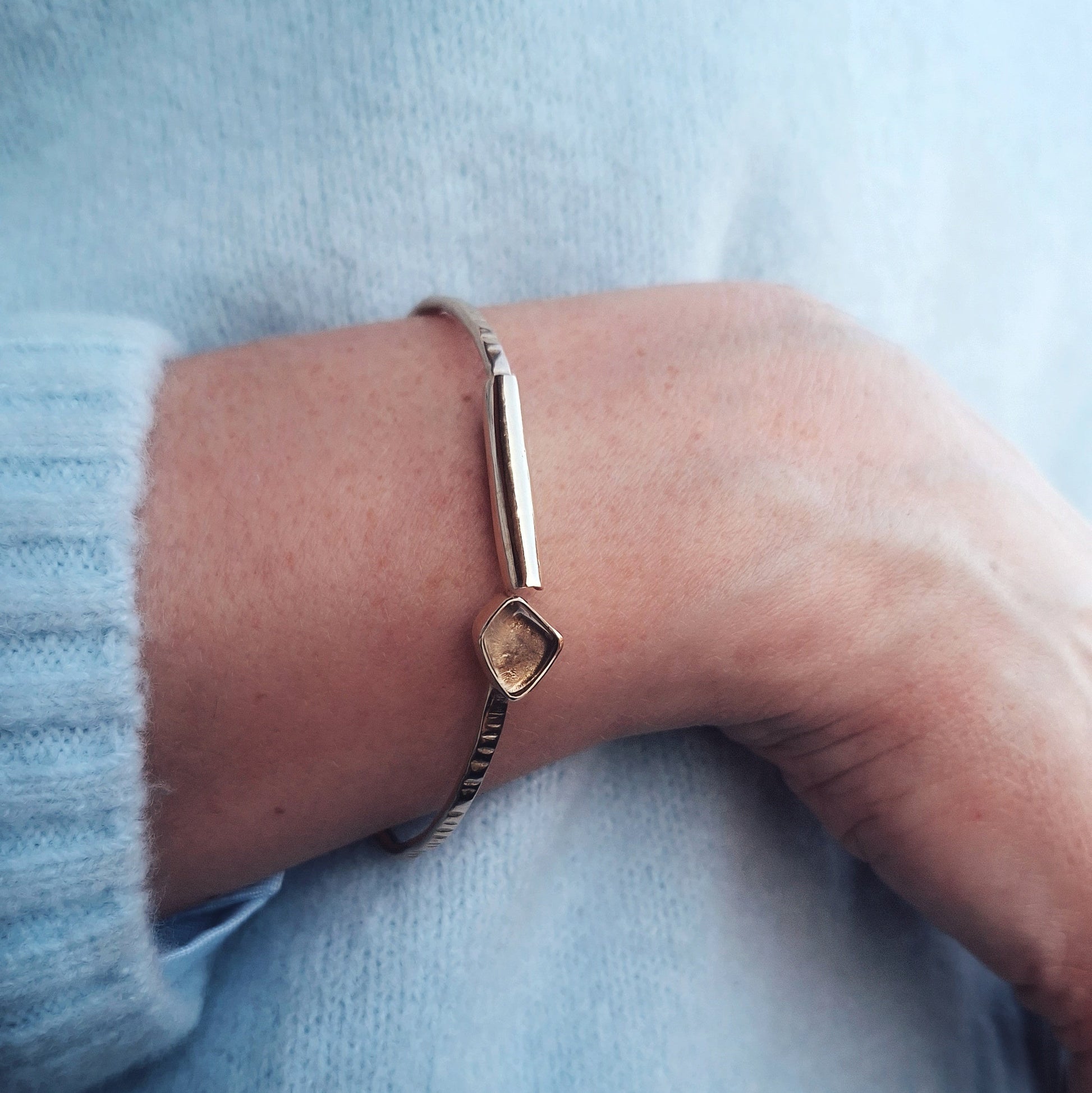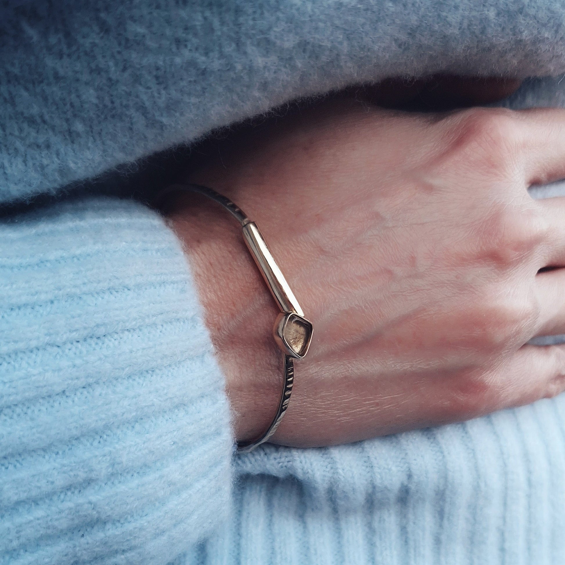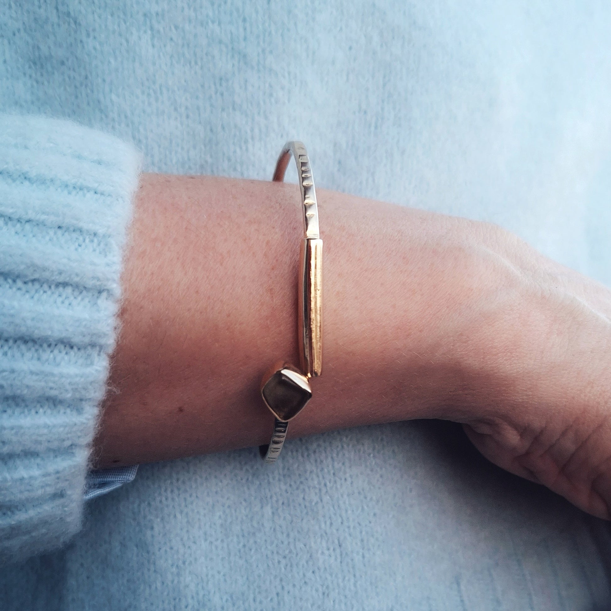 Narukvica krašena geometrijom, teksturama i sjajem gorskog kristala organskog oblika.
