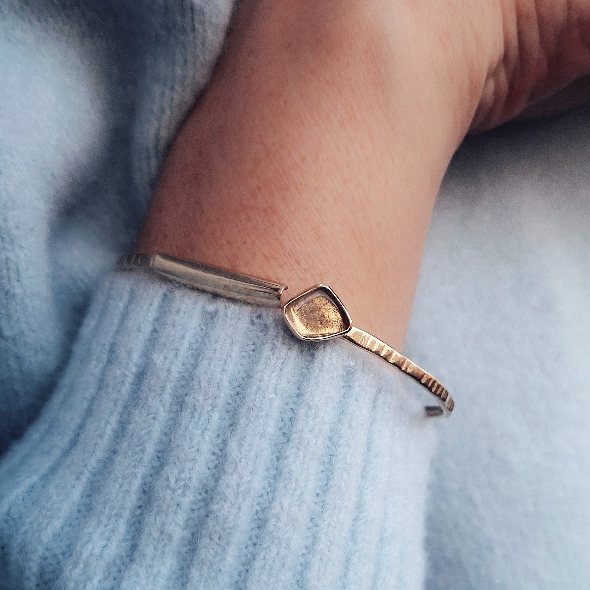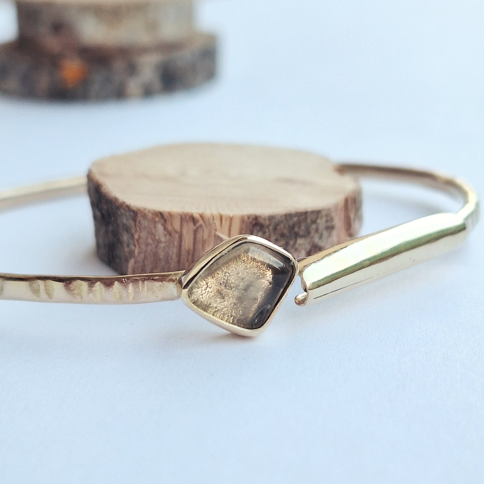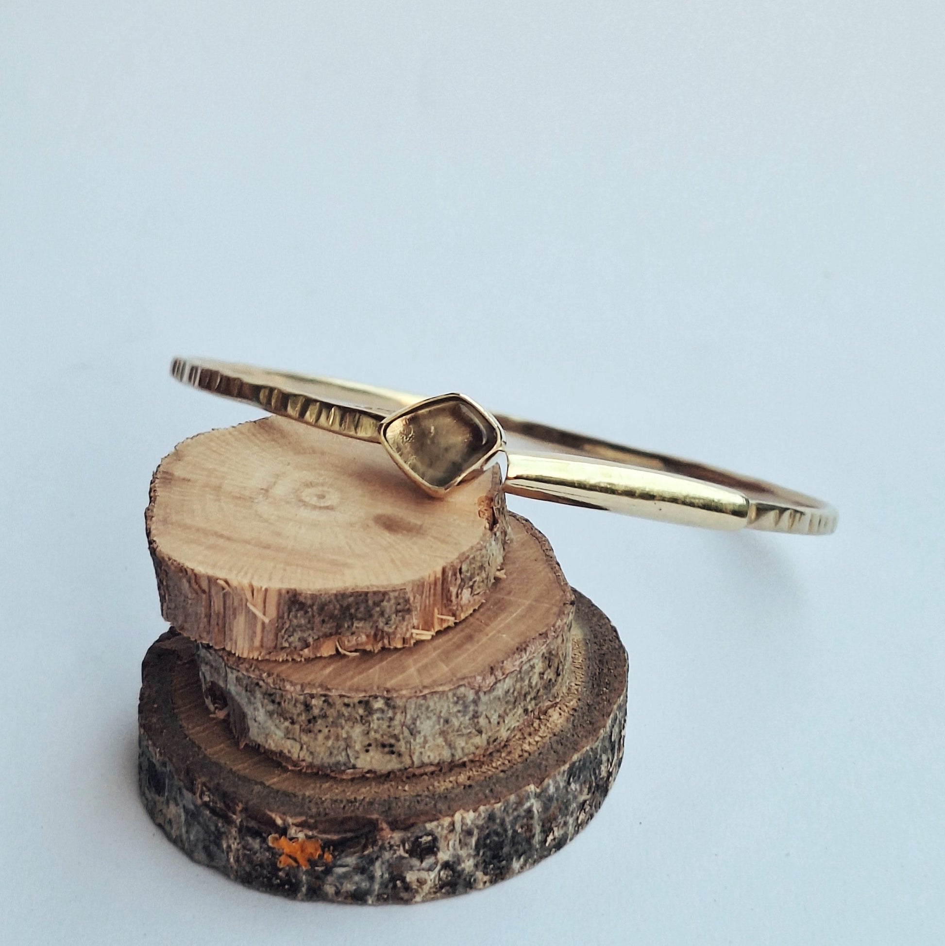 Narukvica krašena geometrijom, teksturama i sjajem gorskog kristala organskog oblika.