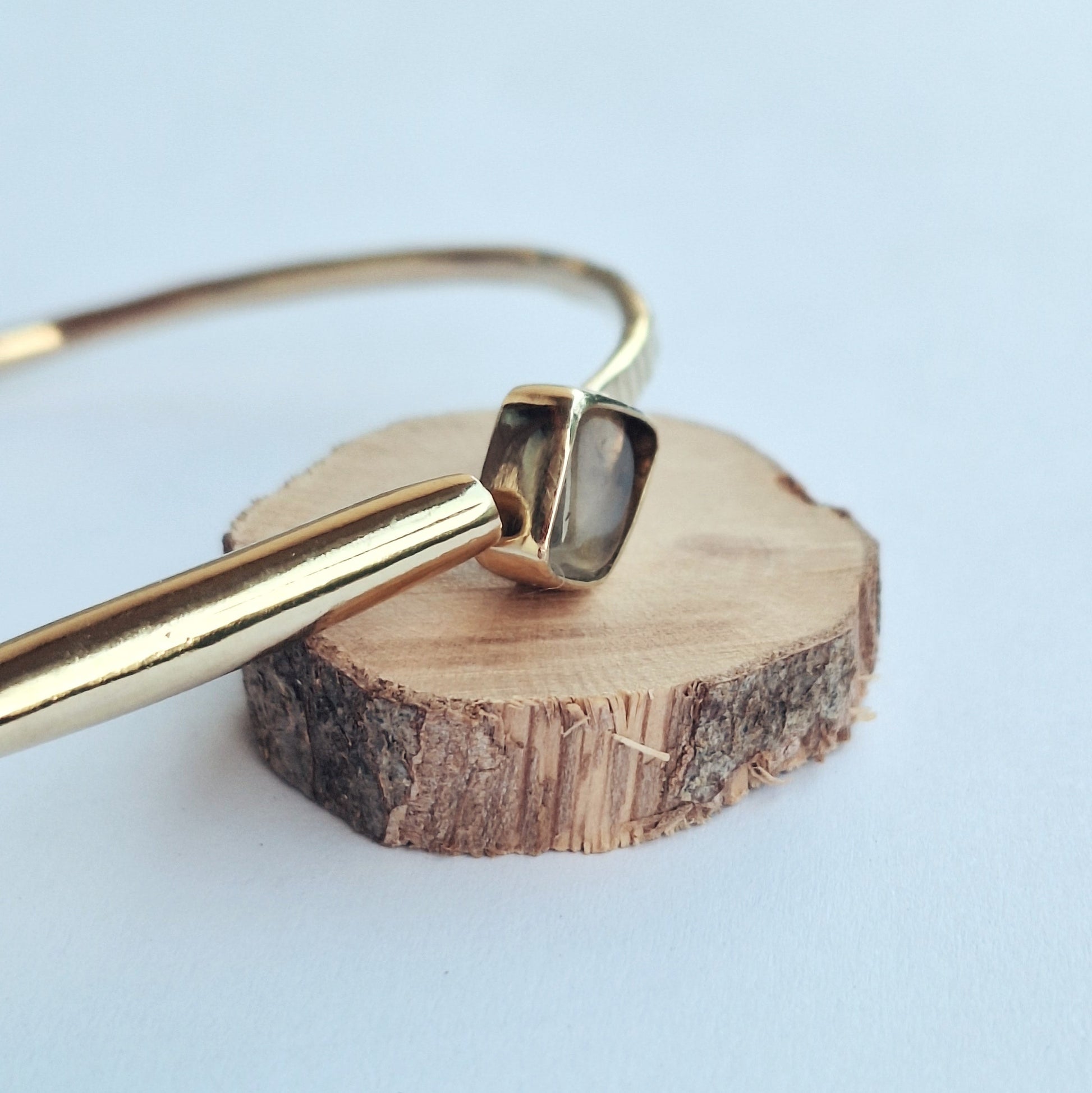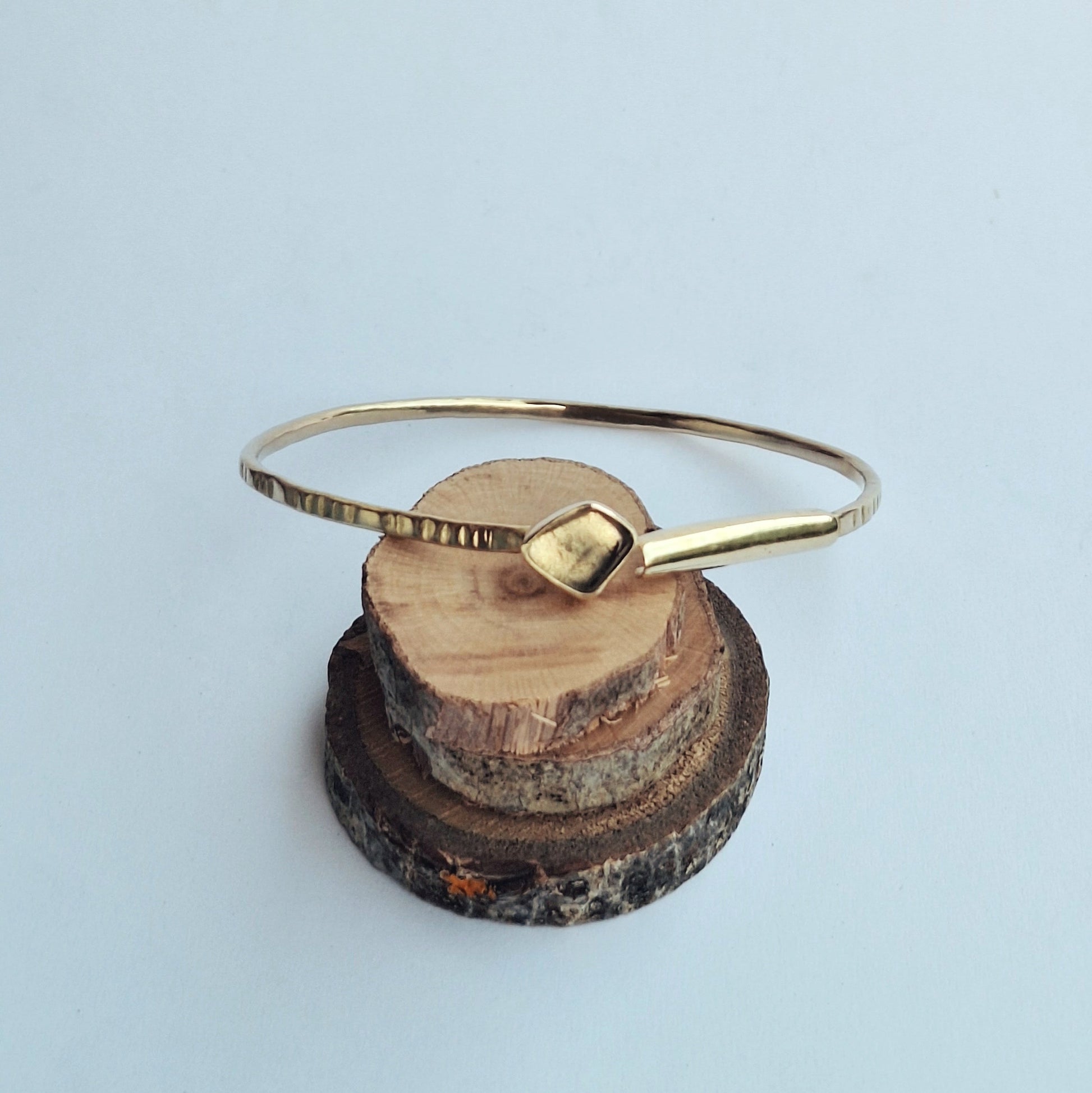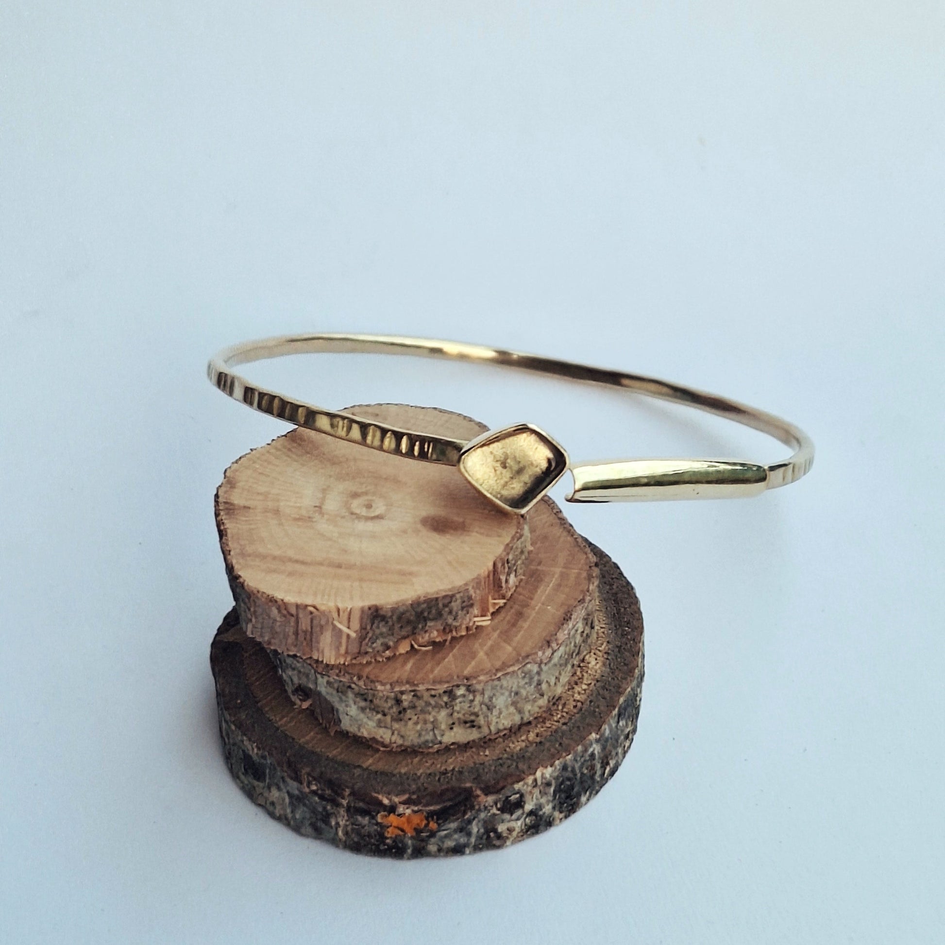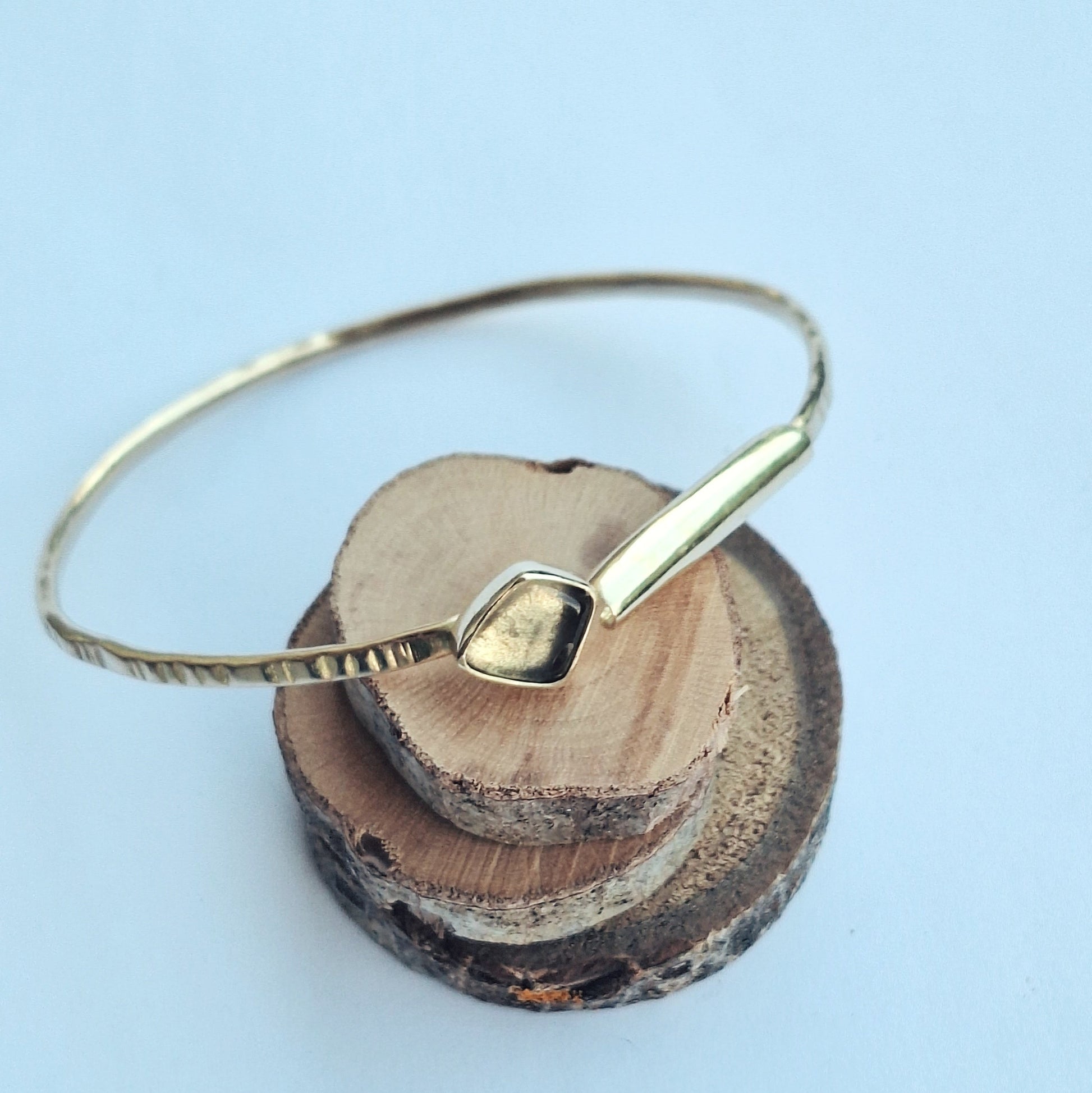 Narukvica krašena geometrijom, teksturama i sjajem gorskog kristala organskog oblika.
