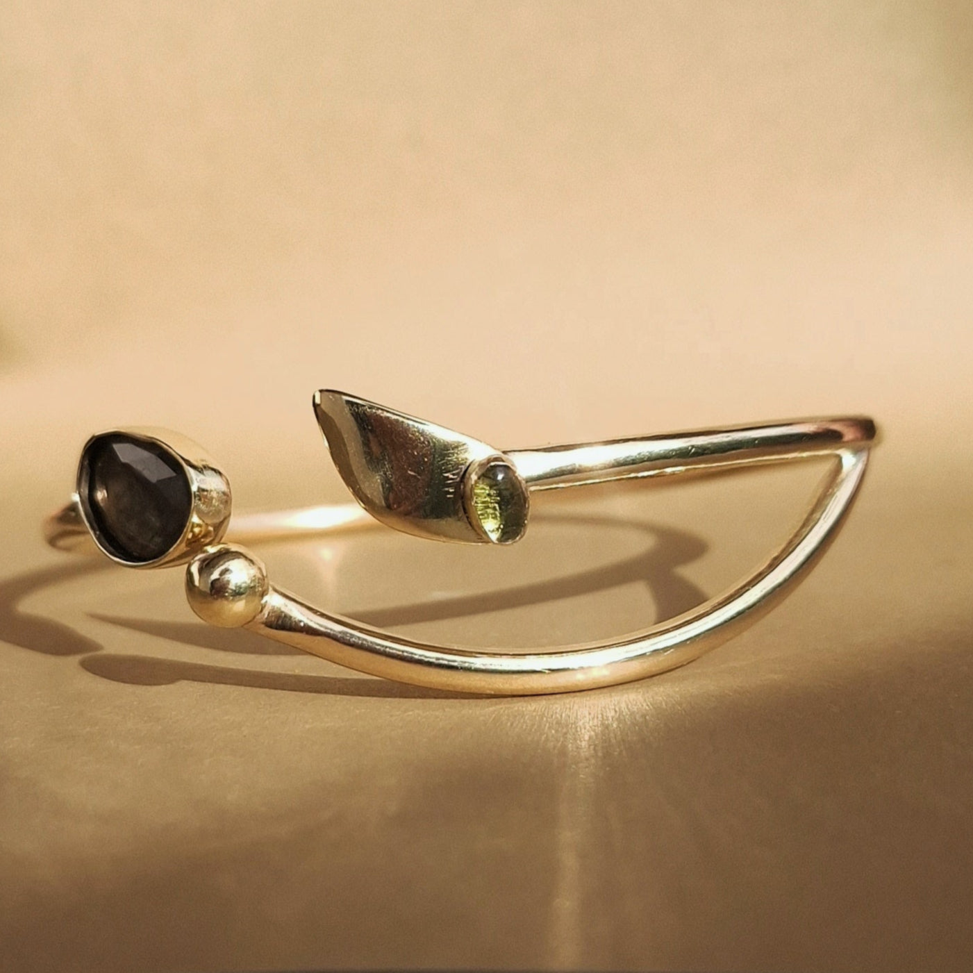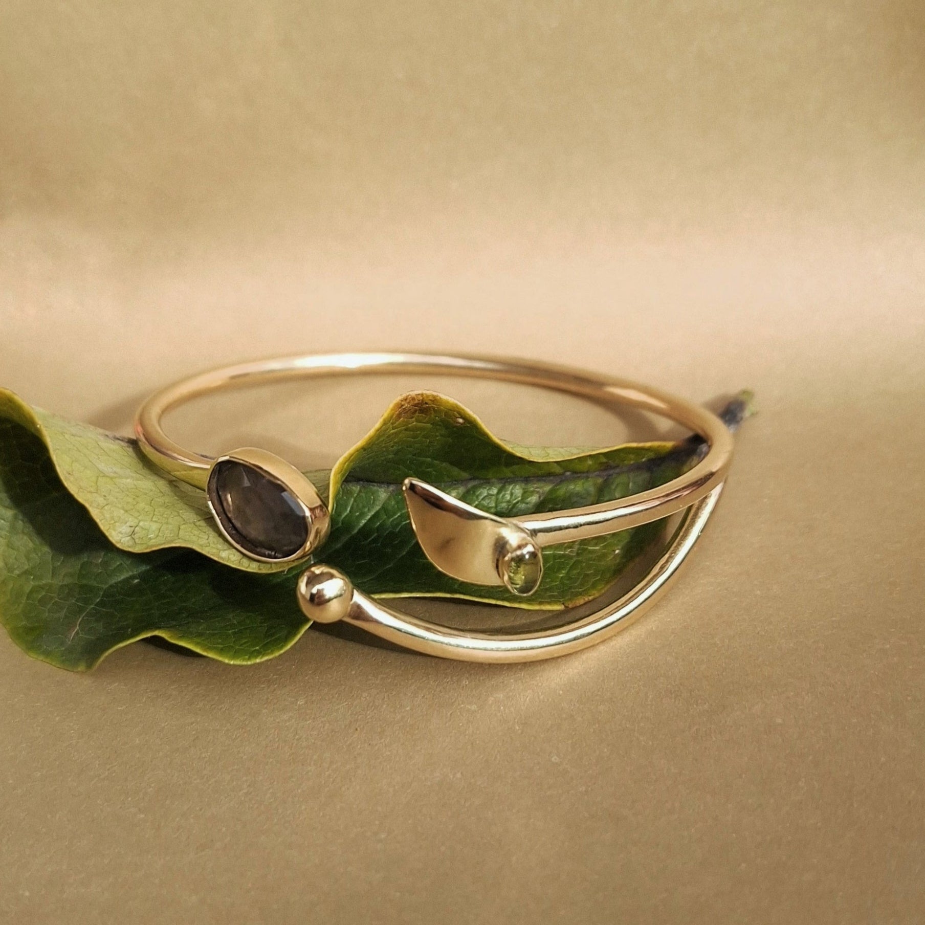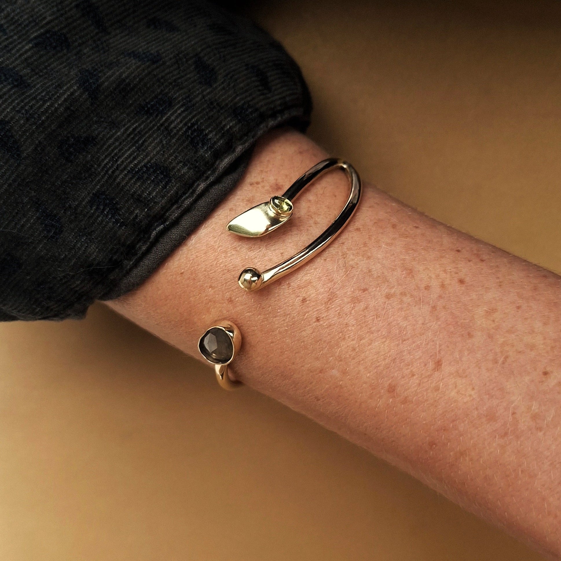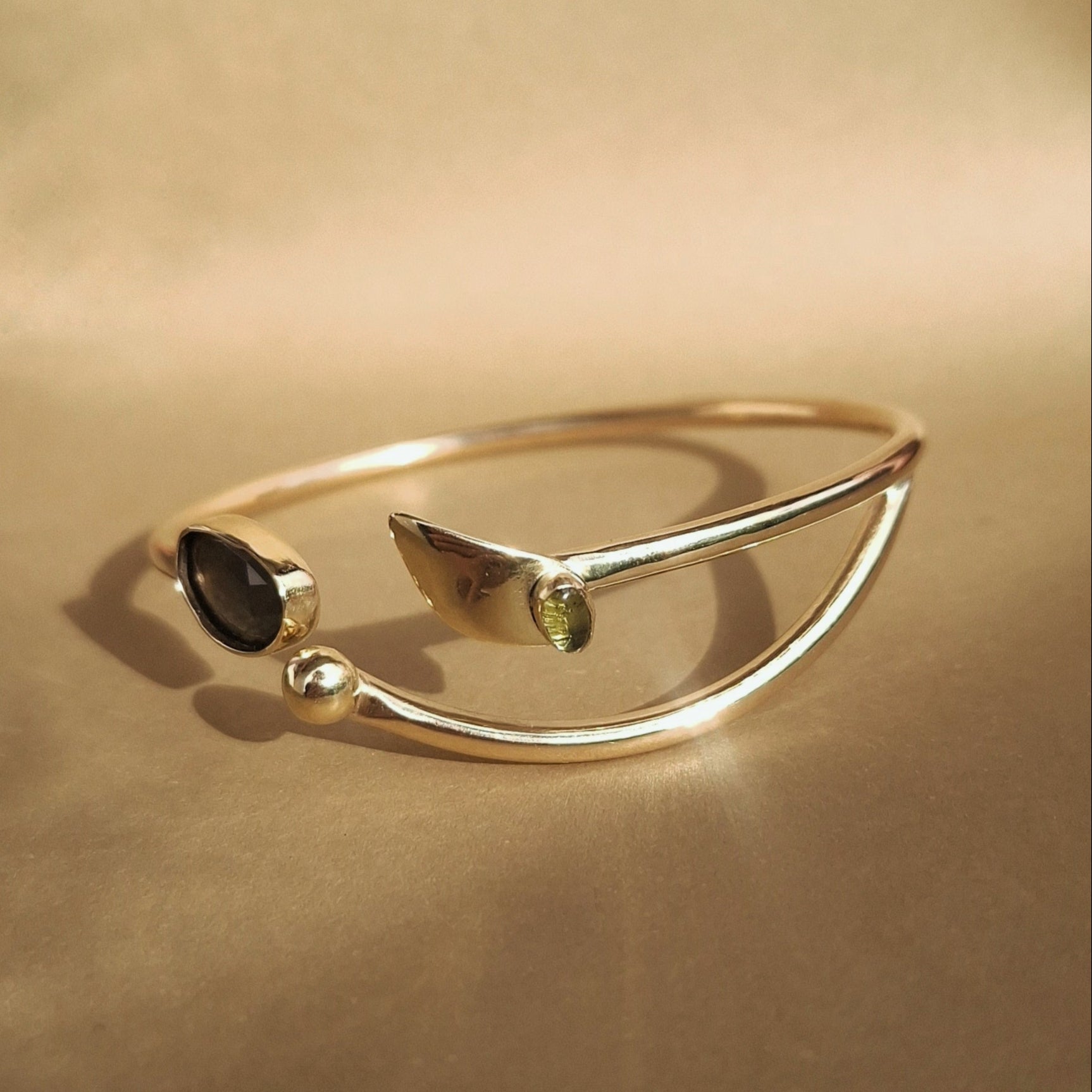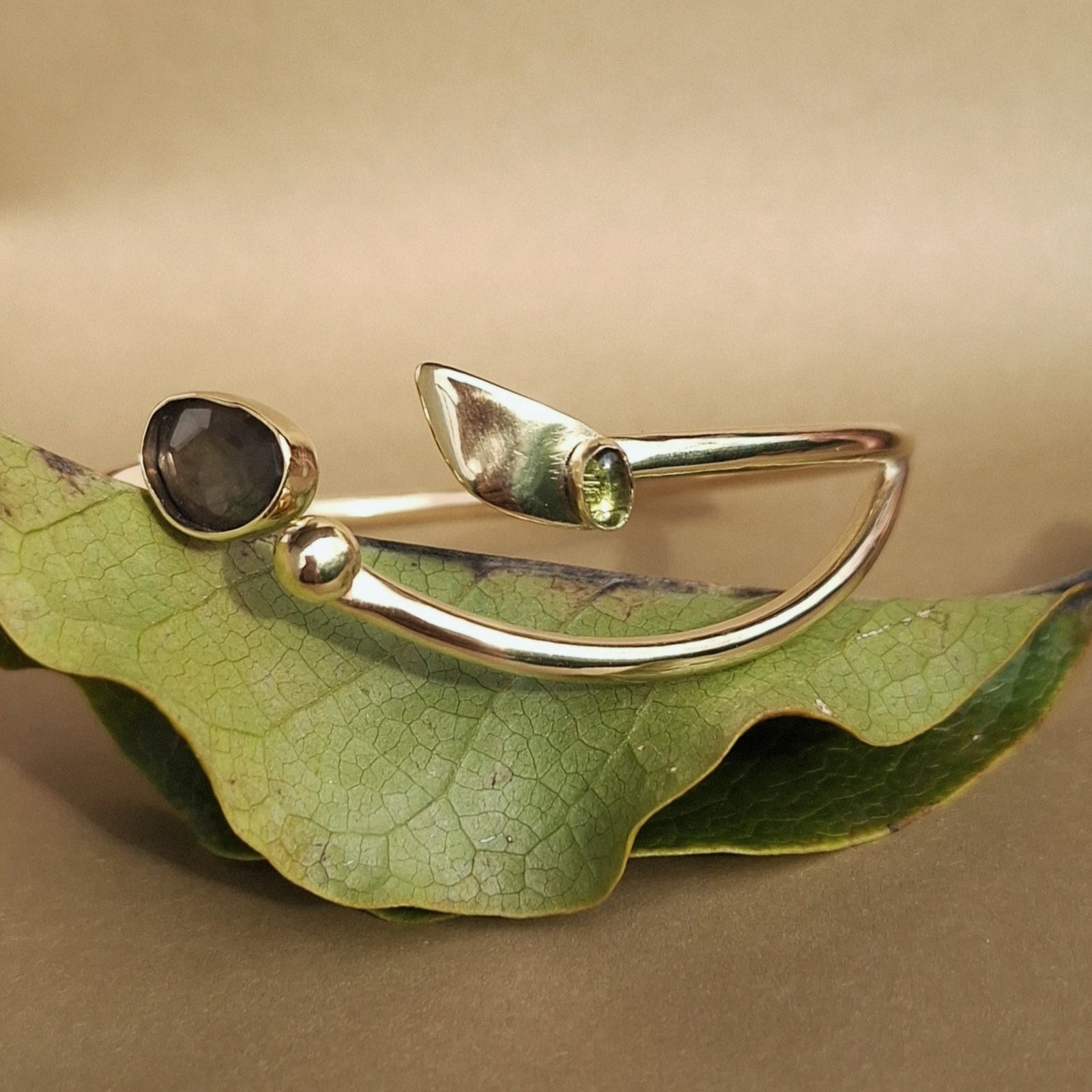 Grane na vjetru elegantne su i veličanstvene. Inspirirana njima, ova unikatna narukvica na svojim minimalističkim, a jakim granama nosi listić, mjedeni detalj u obliku kuglice, mali peridot i turmalin.