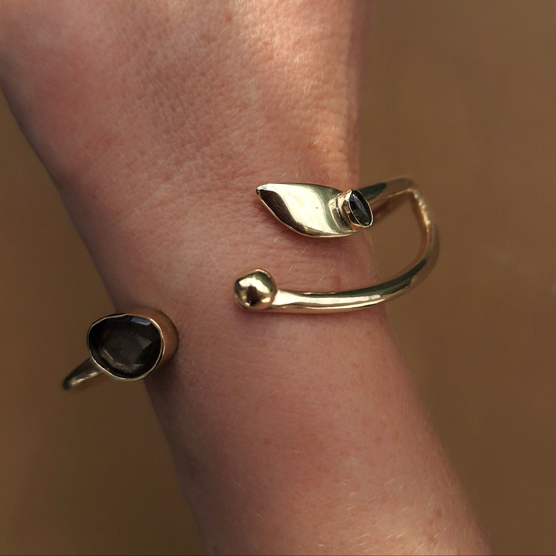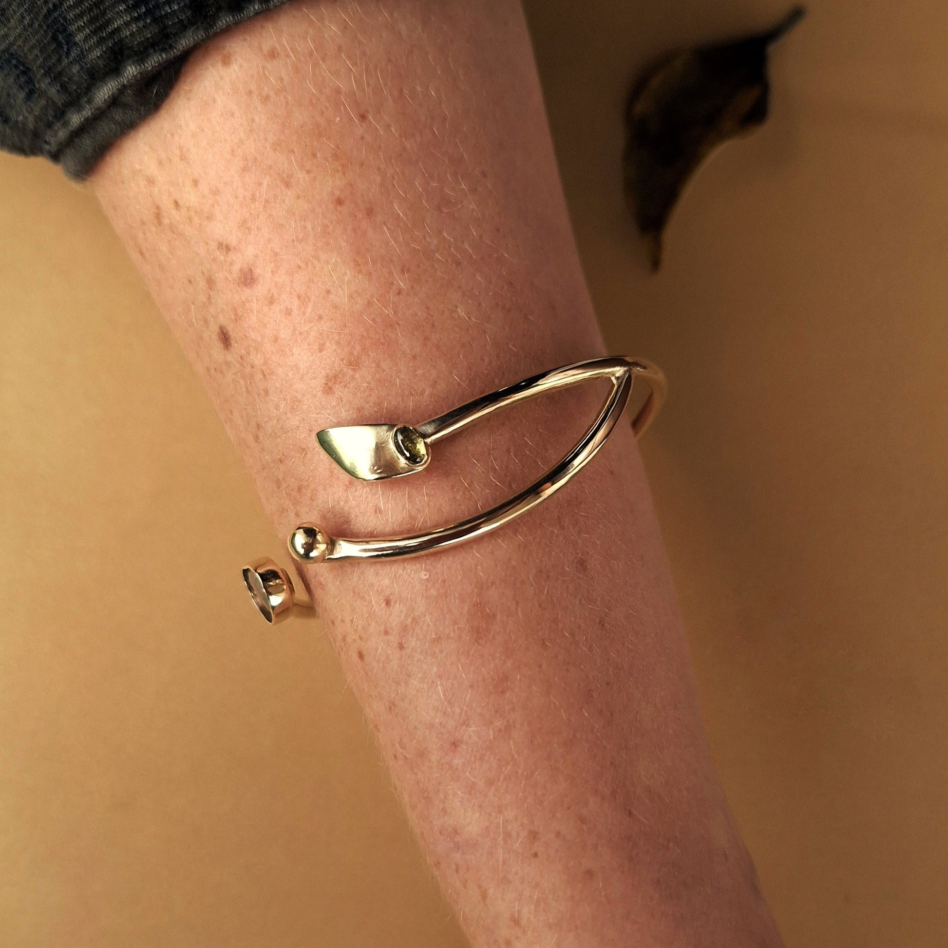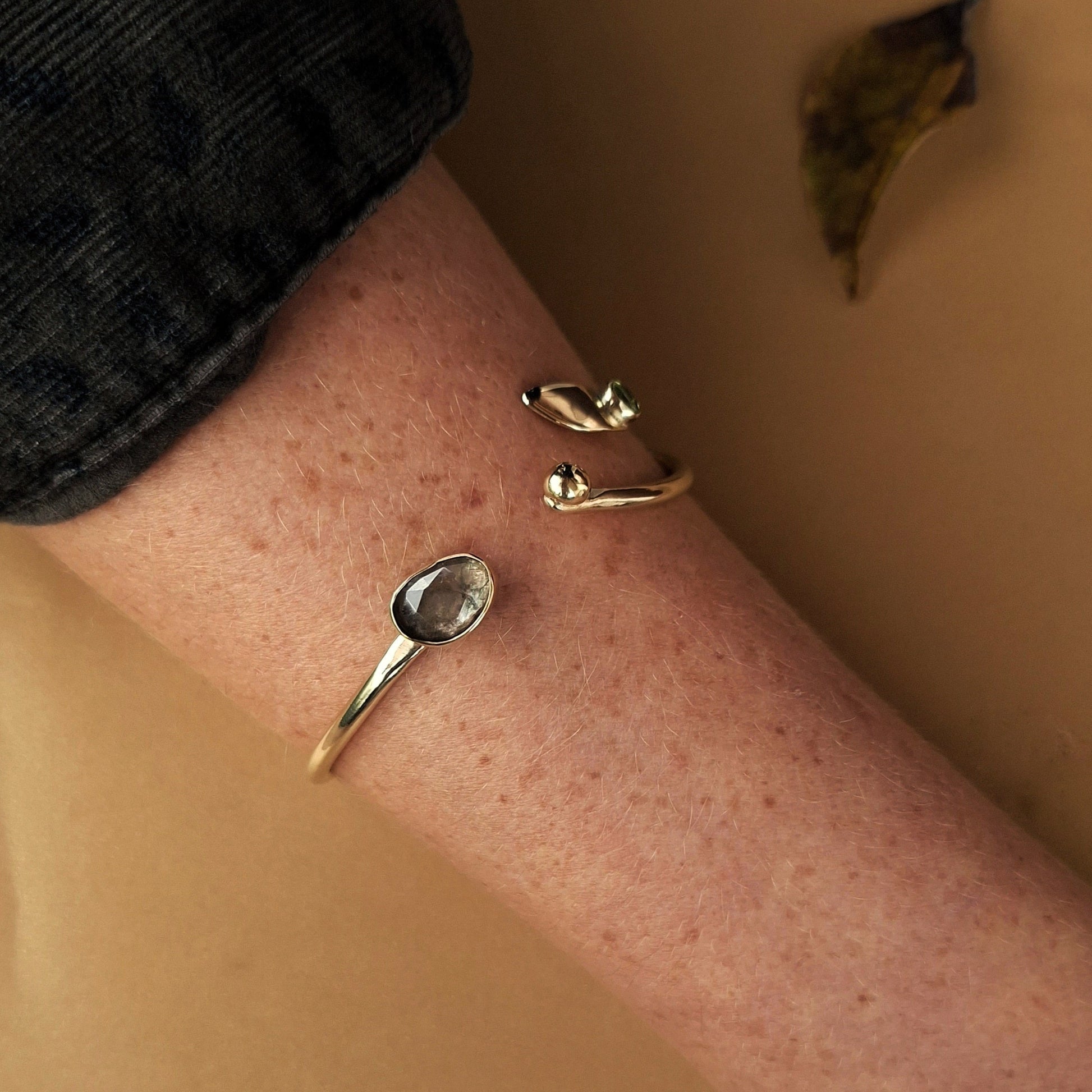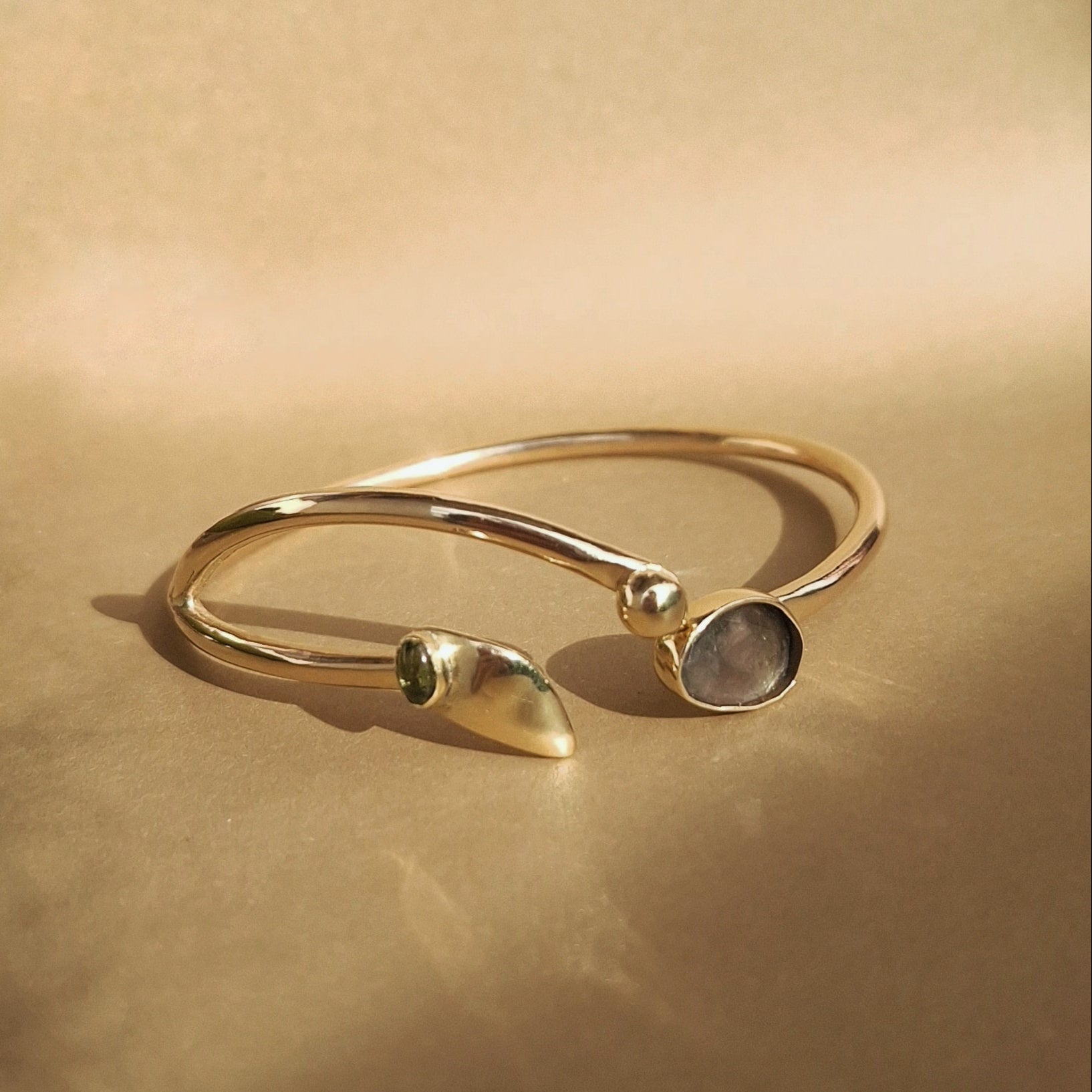 Grane na vjetru elegantne su i veličanstvene. Inspirirana njima, ova unikatna narukvica na svojim minimalističkim, a jakim granama nosi listić, mjedeni detalj u obliku kuglice, mali peridot i turmalin.