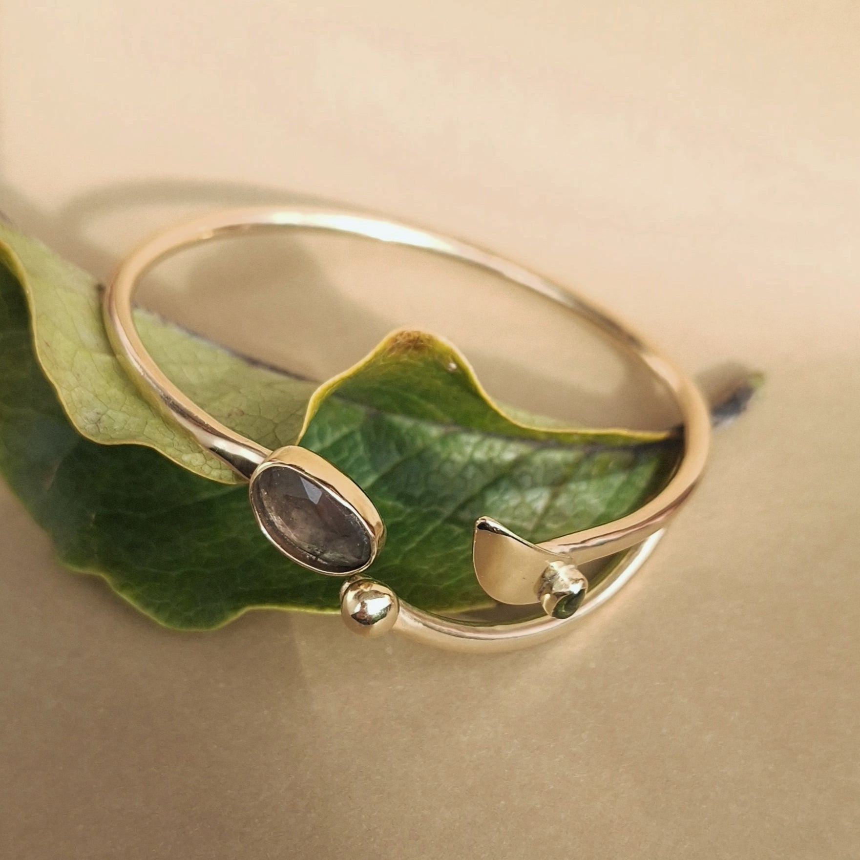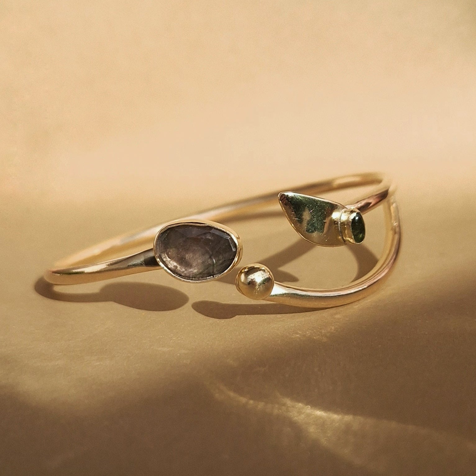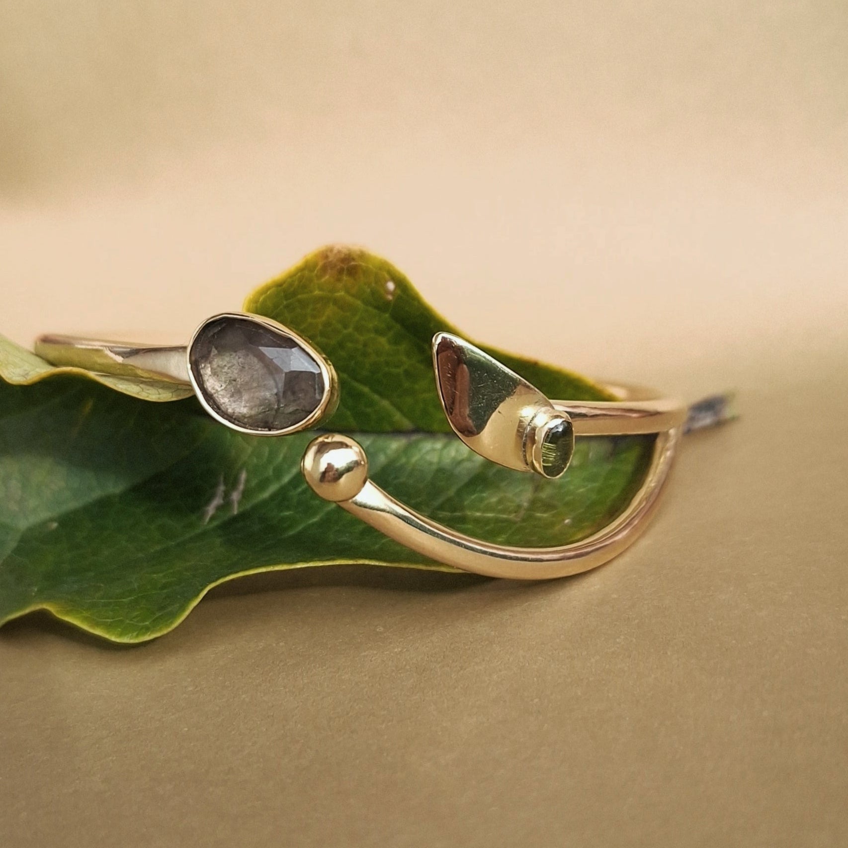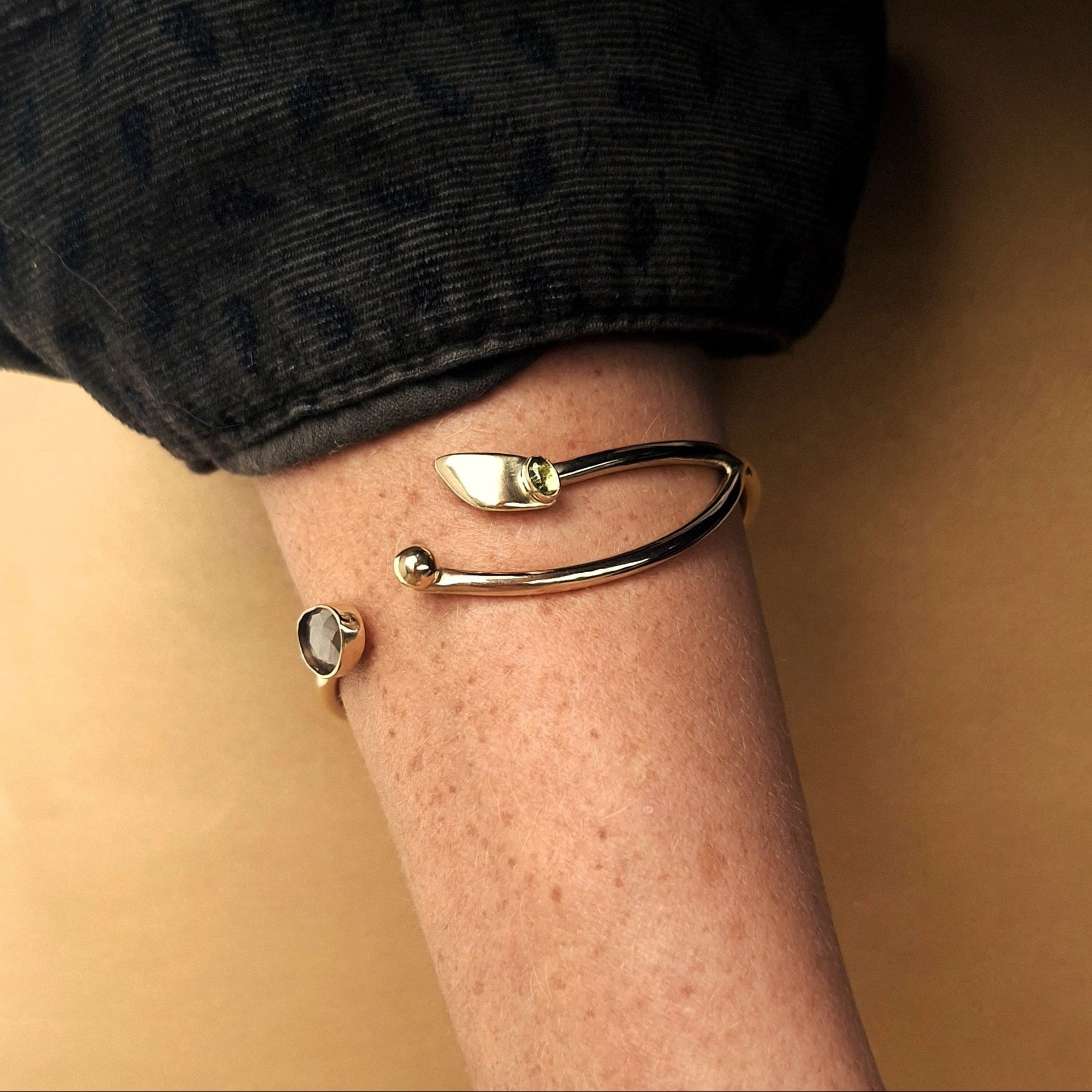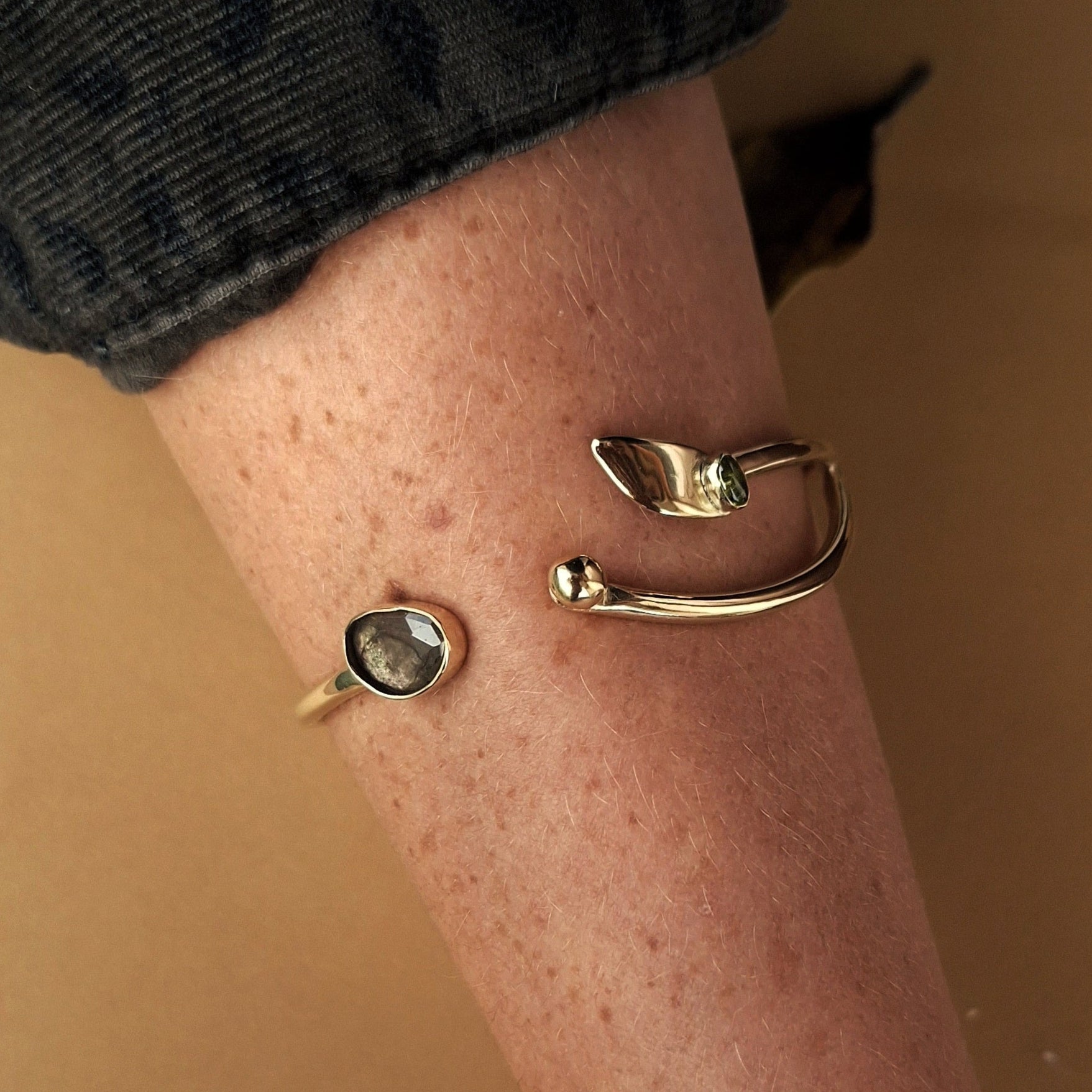 Grane na vjetru elegantne su i veličanstvene. Inspirirana njima, ova unikatna narukvica na svojim minimalističkim, a jakim granama nosi listić, mjedeni detalj u obliku kuglice, mali peridot i turmalin.