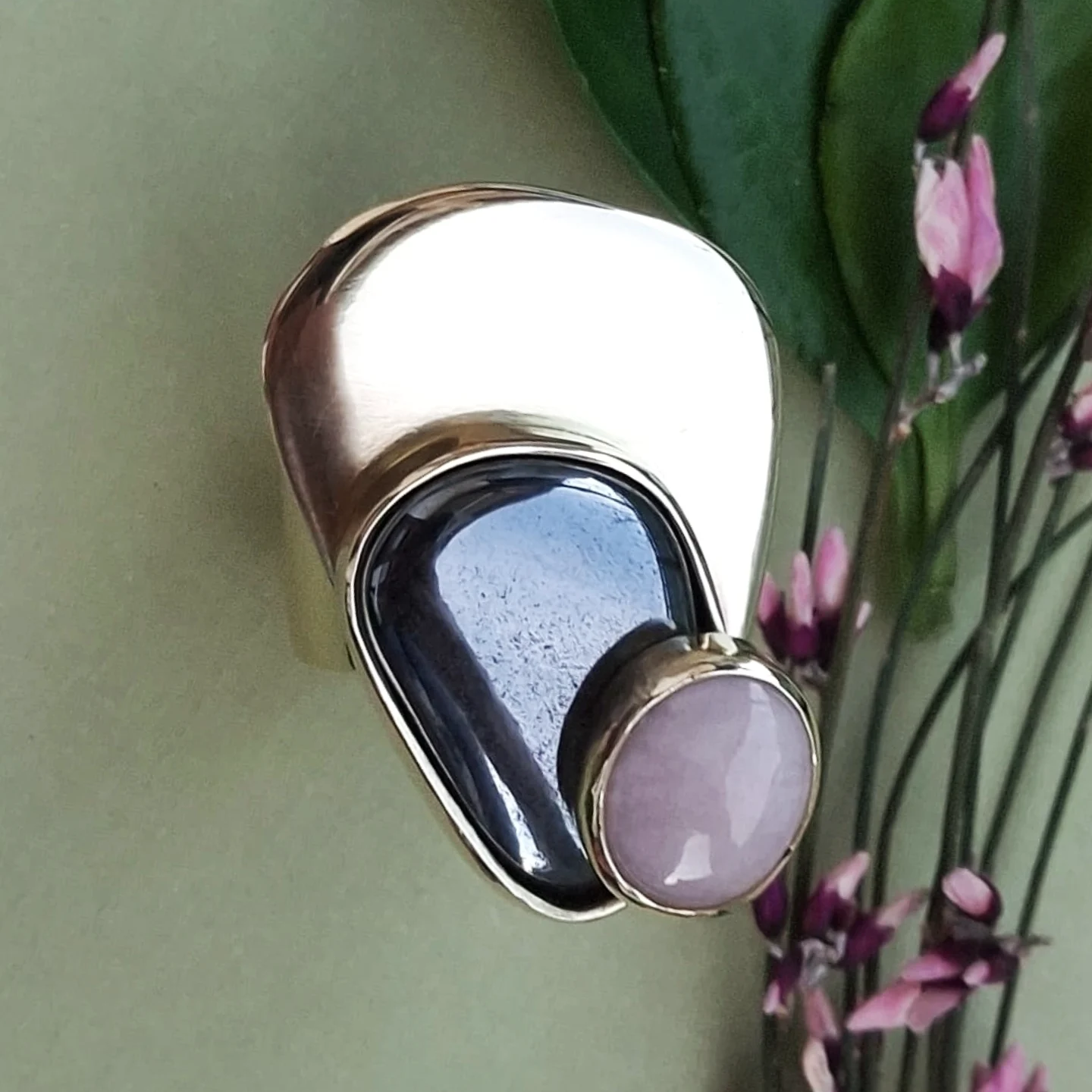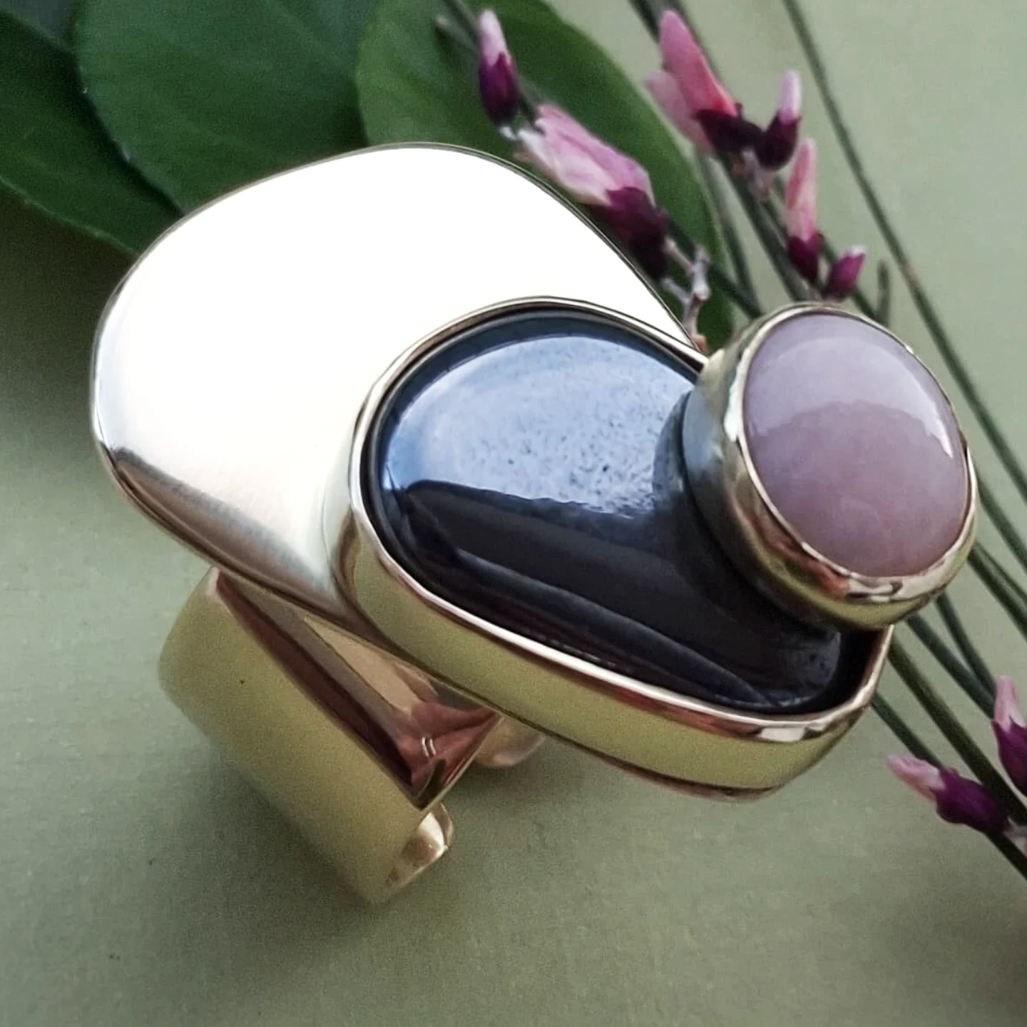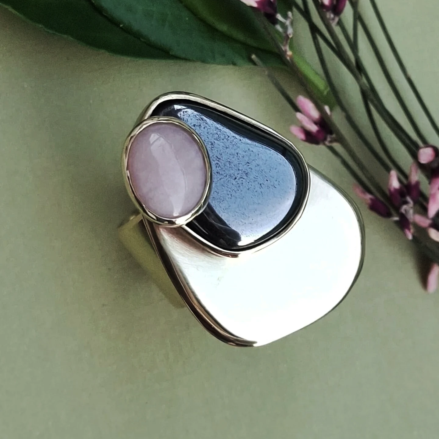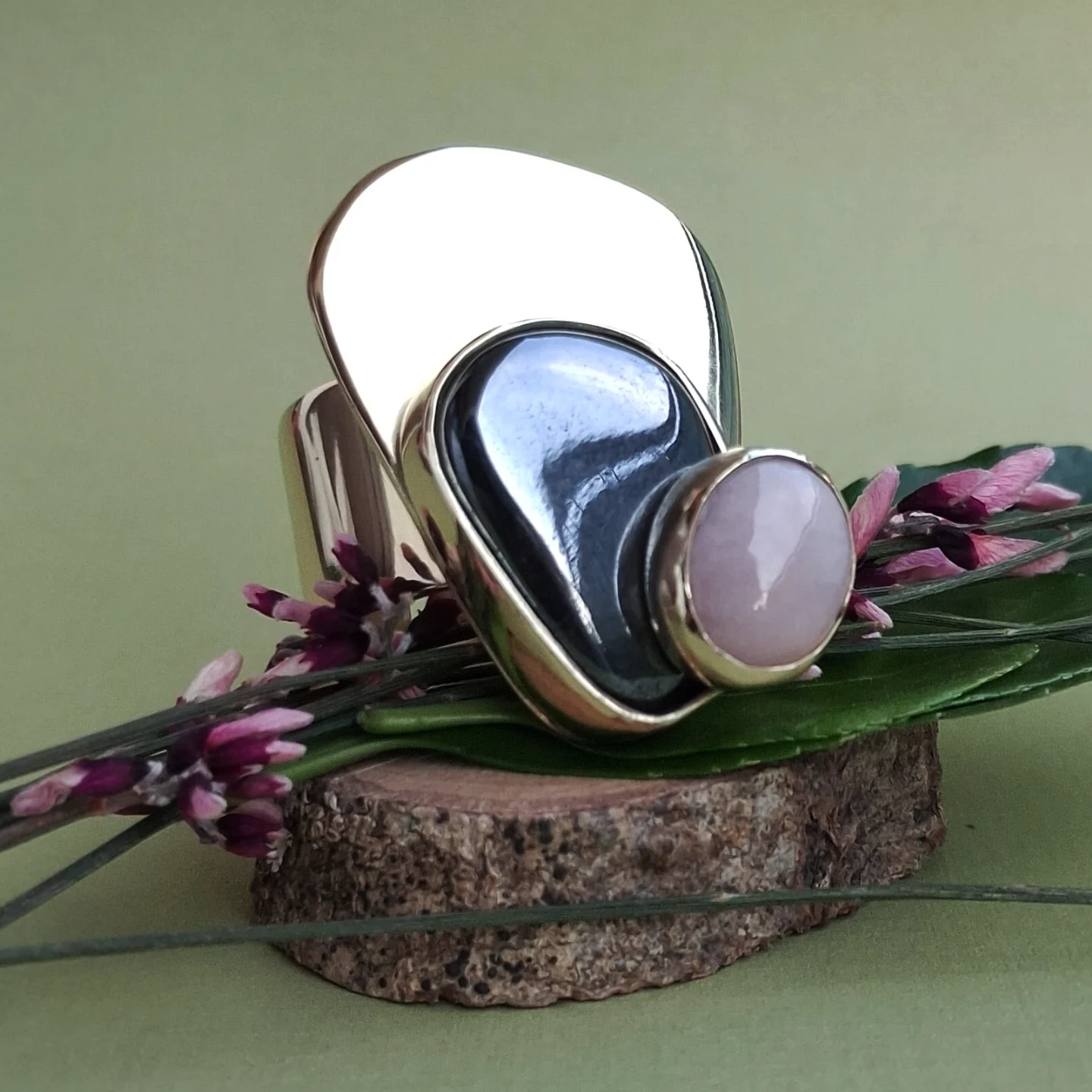 Prsten s kamenom na kamenu u bojama nježnog rozog opala i tamnosivog presijavajućeg hematita, a oni zajedno na snažnoj mjedenoj plohi.