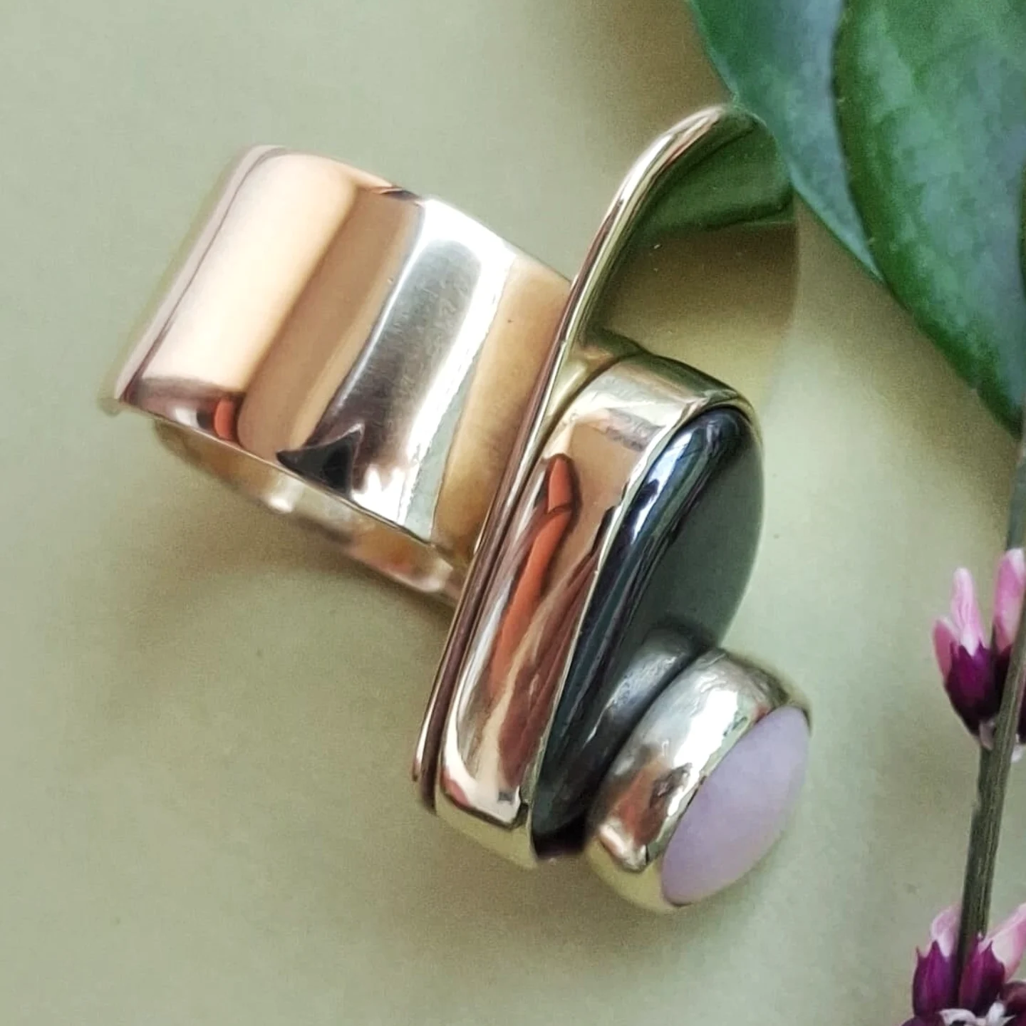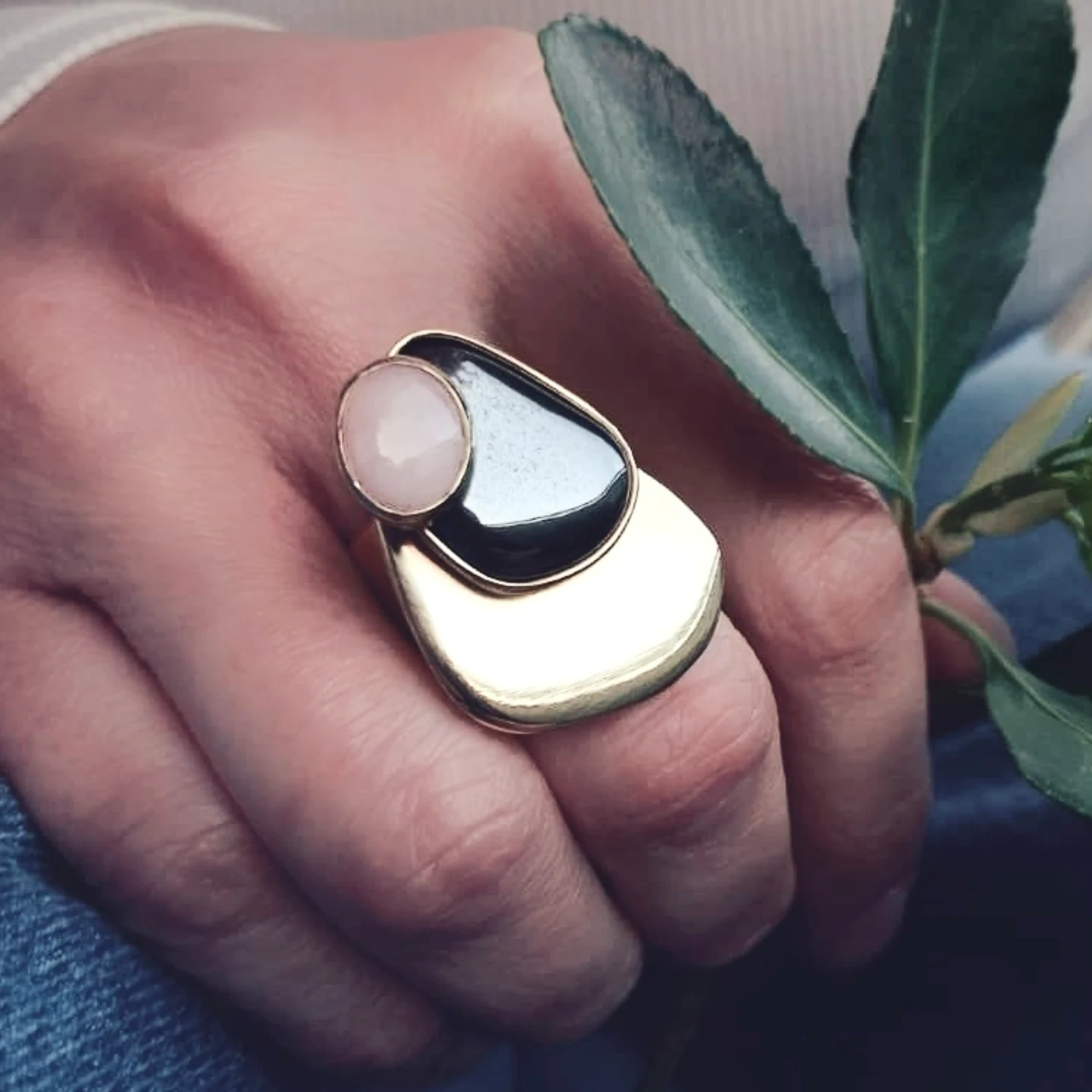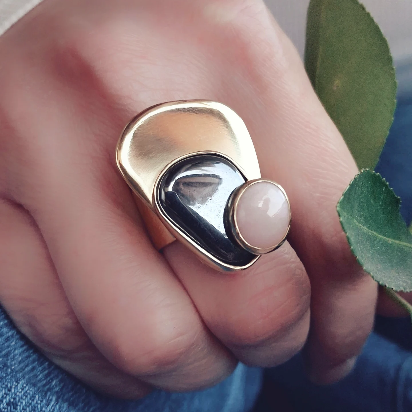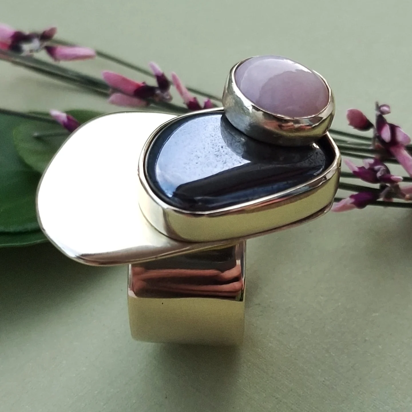 Prsten s kamenom na kamenu u bojama nježnog rozog opala i tamnosivog presijavajućeg hematita, a oni zajedno na snažnoj mjedenoj plohi.
