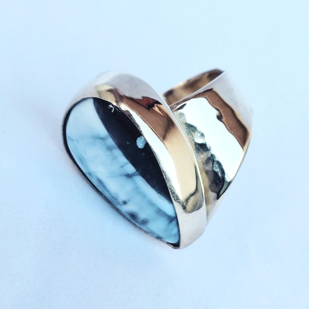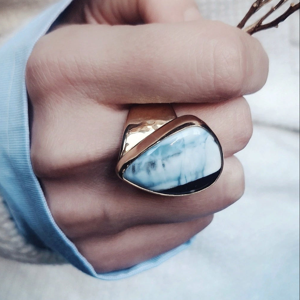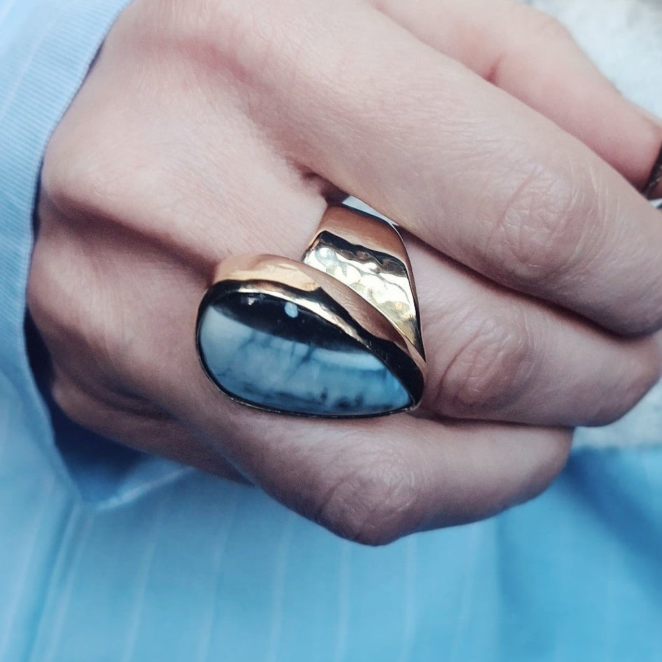 Snažni teksturirani mjedeni prsten istovremeno prati linije kamena i prsta, naglašavajući oblik kamena i donoseći ravnotežu u cjelokupni dizajn.