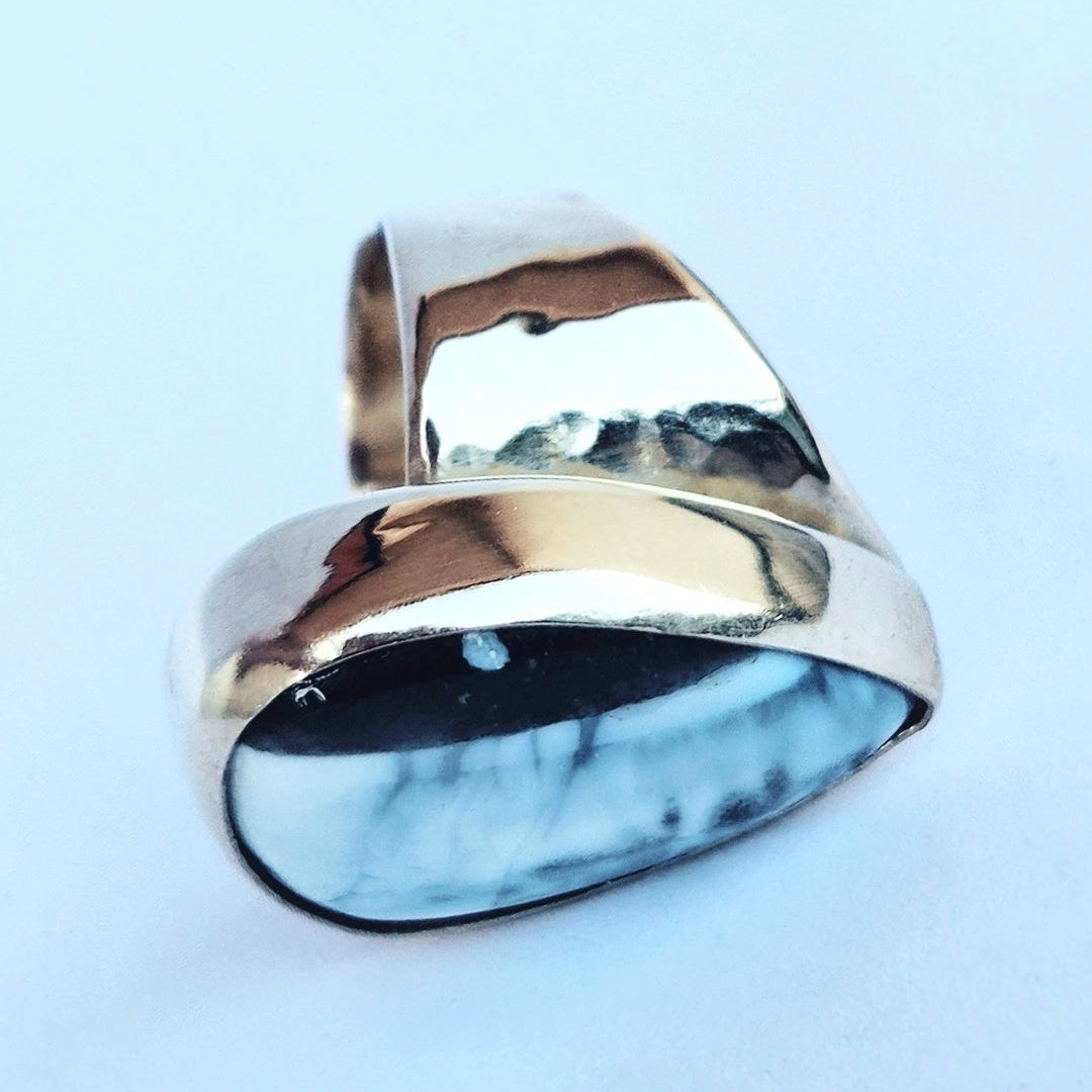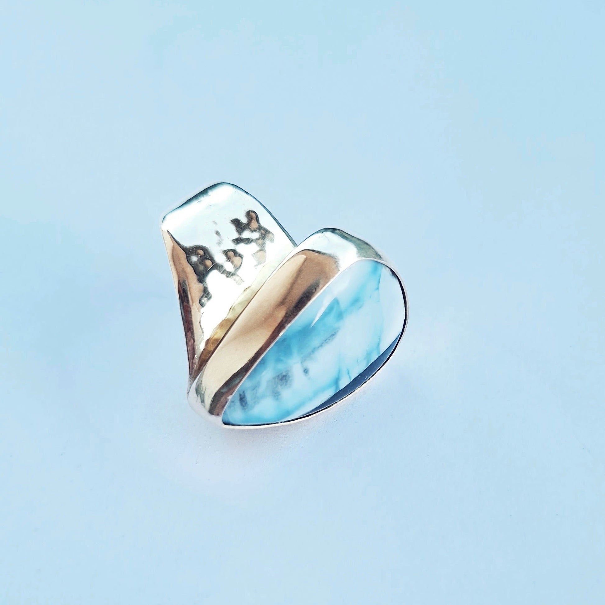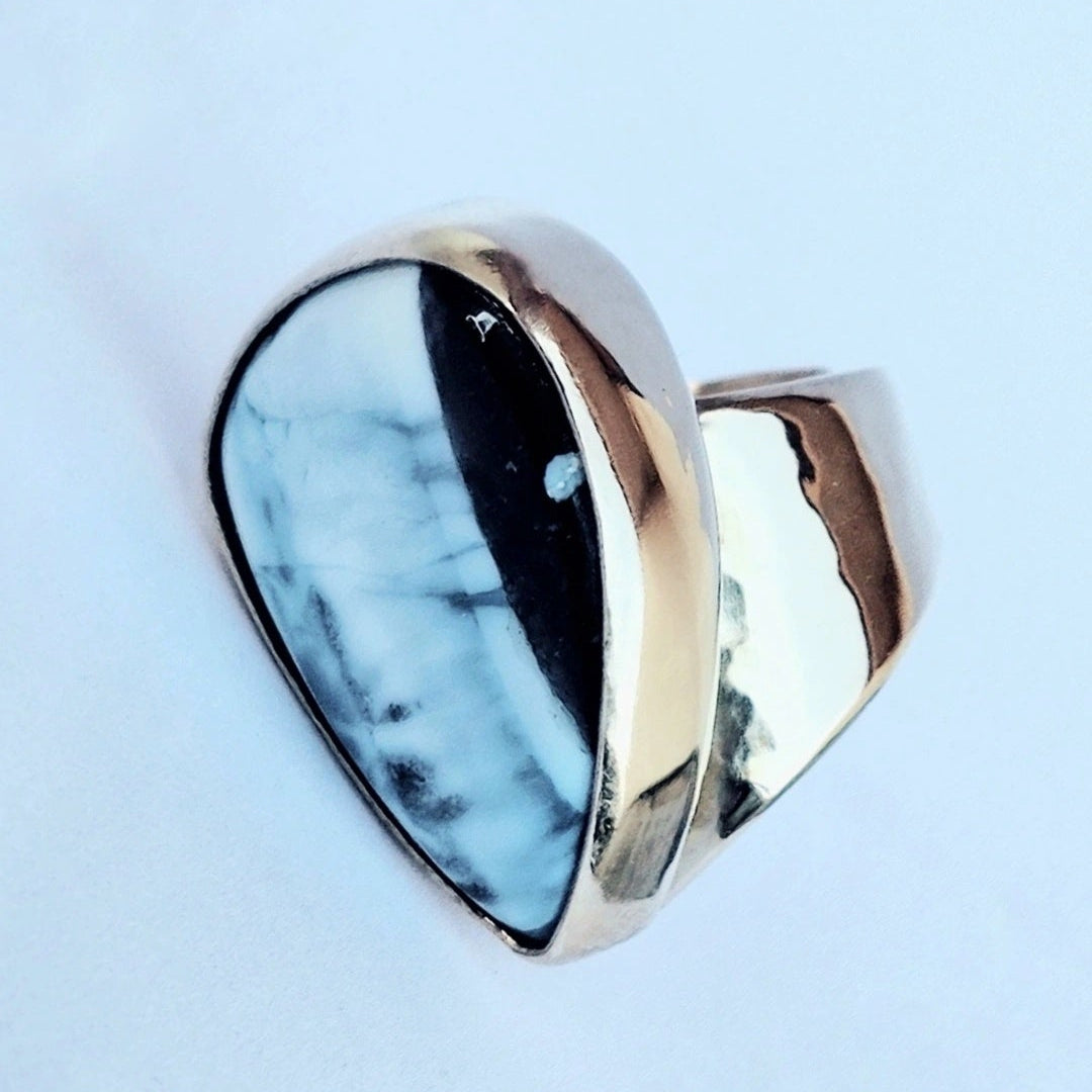 Snažni teksturirani mjedeni prsten istovremeno prati linije kamena i prsta, naglašavajući oblik kamena i donoseći ravnotežu u cjelokupni dizajn.