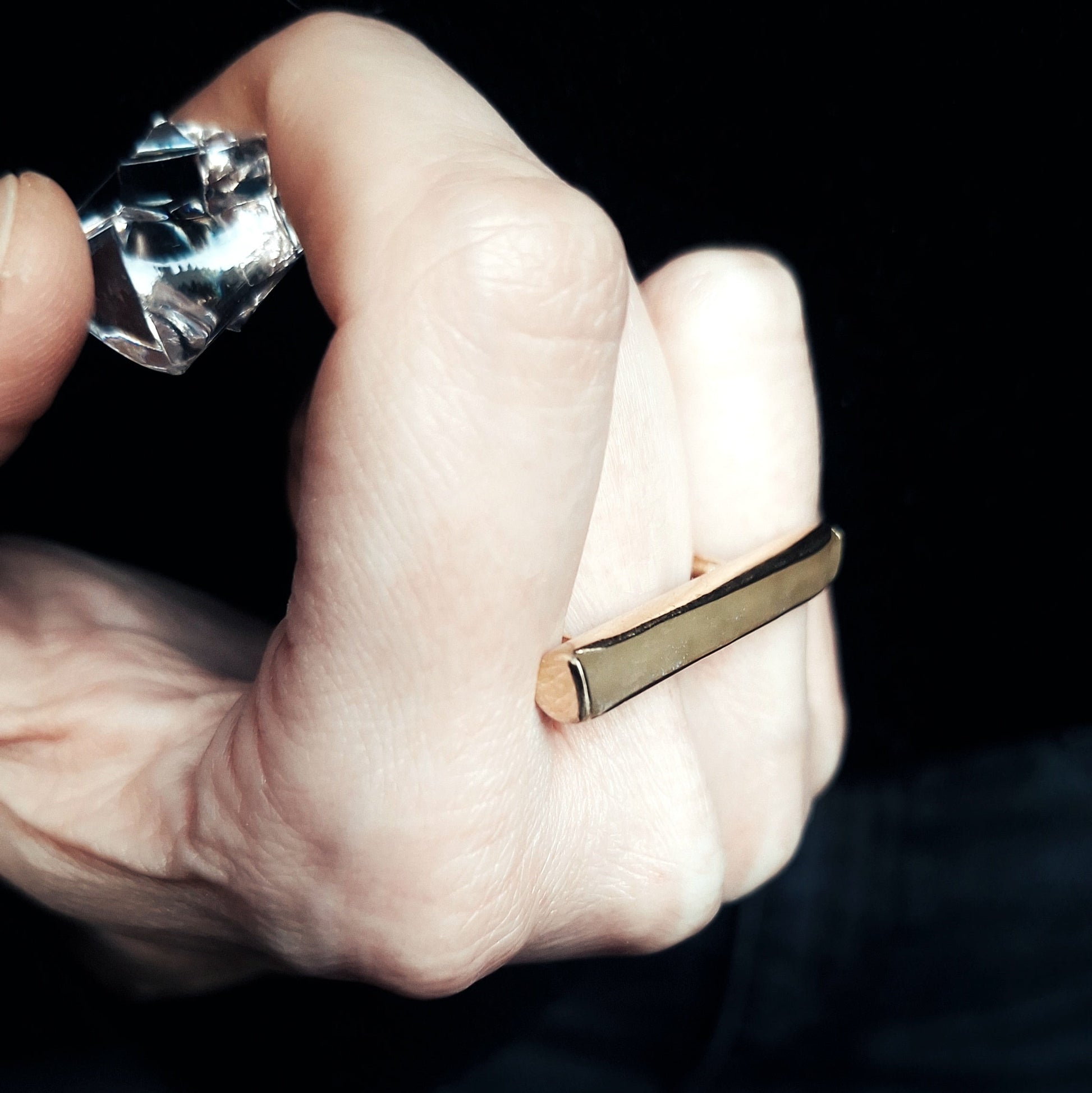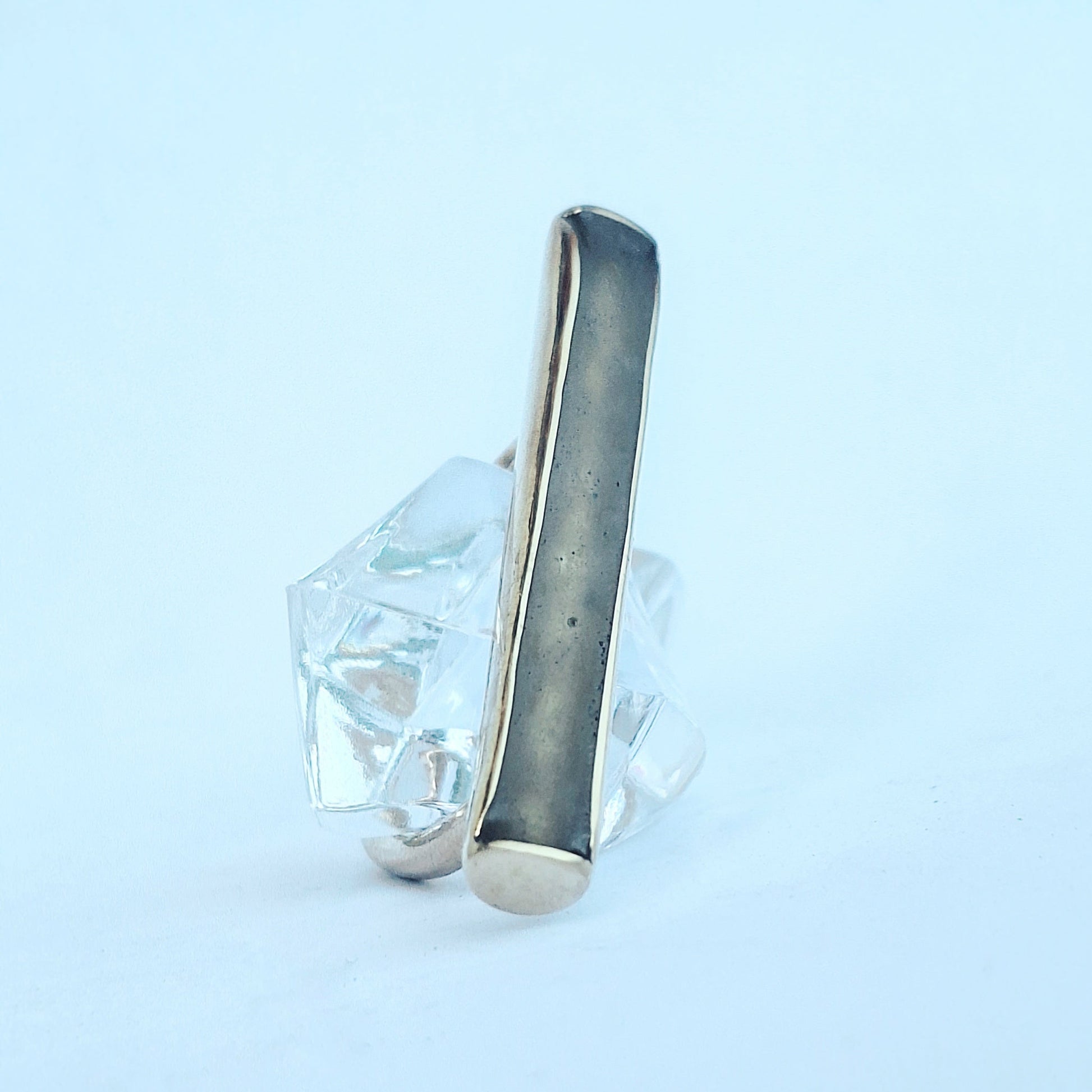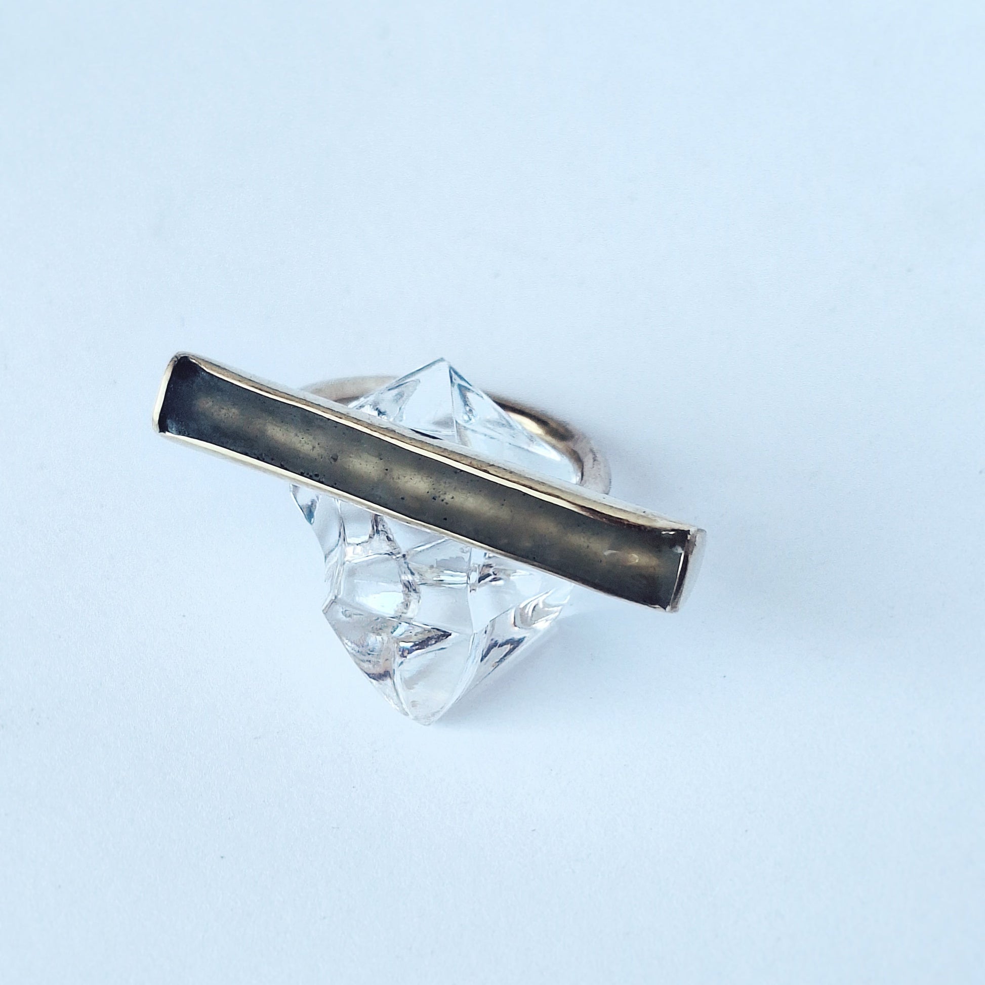 Među zlaćanim linijskim rubovima mjedenog okvira viri mat površina - bez boje, mutna i čvrsta kao led na zimskoj hladnoći: ona čini glavu ovog geometrijskog prstena i zadržava jedan djelić ledene površine kao uspomenu na čvrstu, vrlo hladnu i pamtljivu zimu.