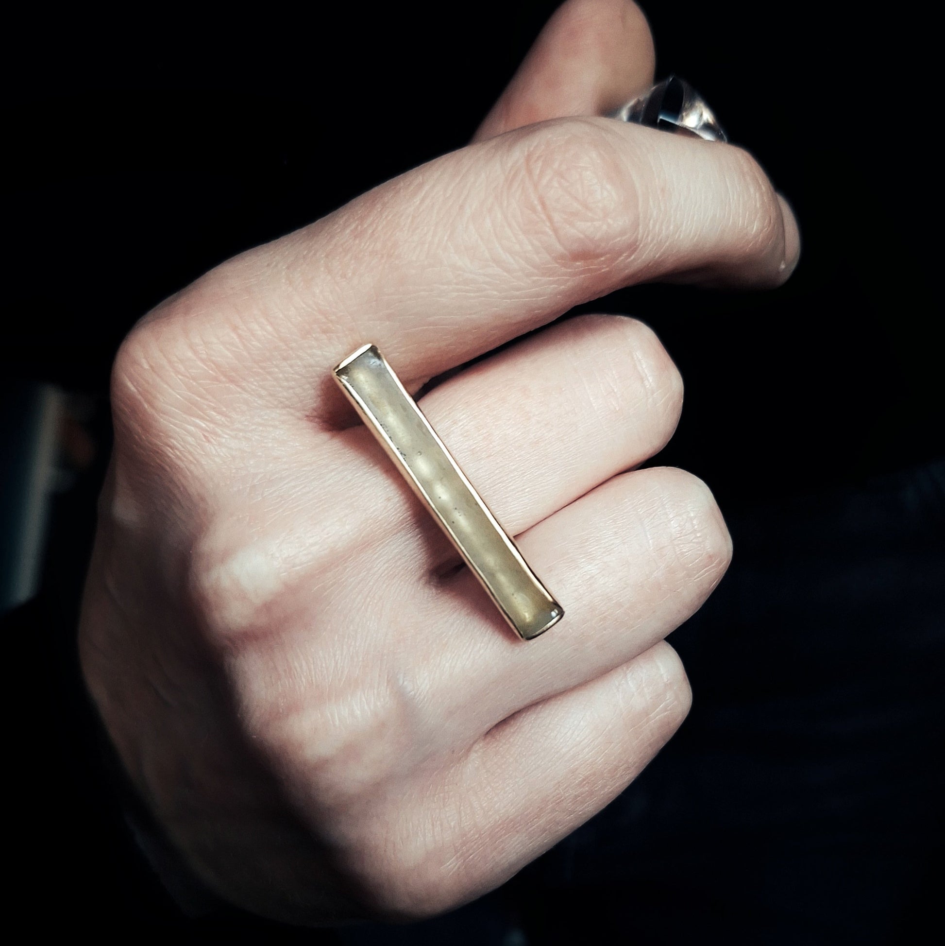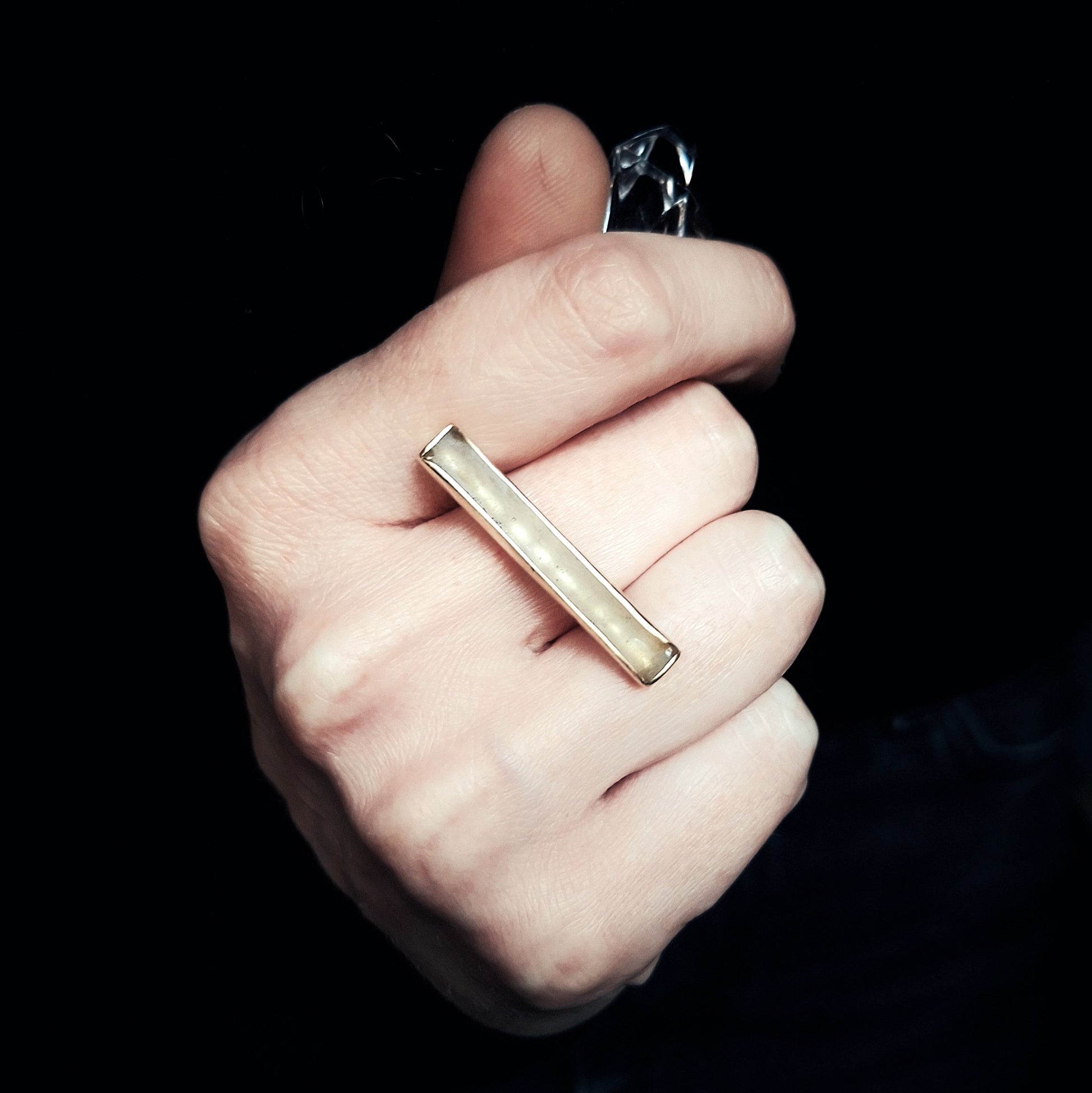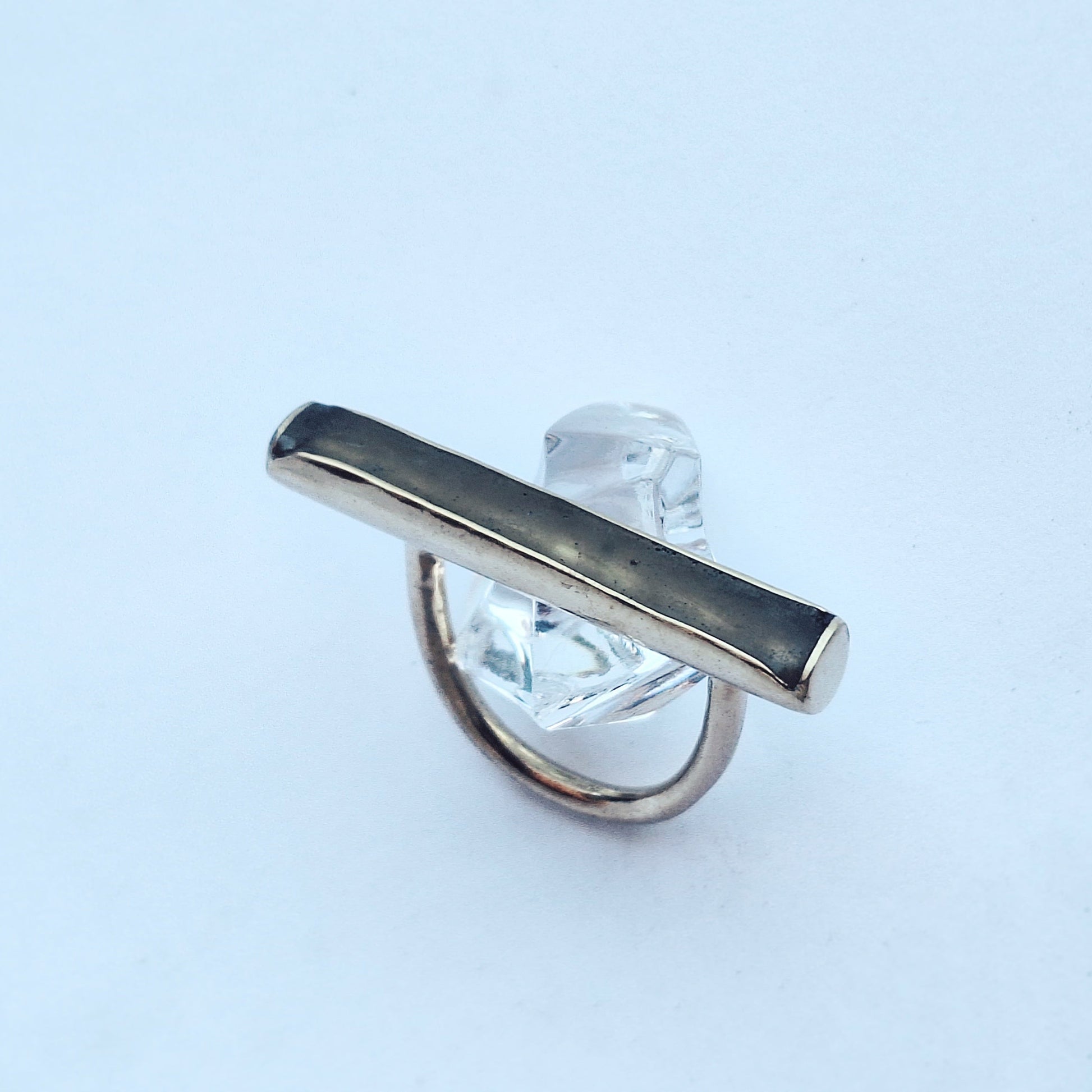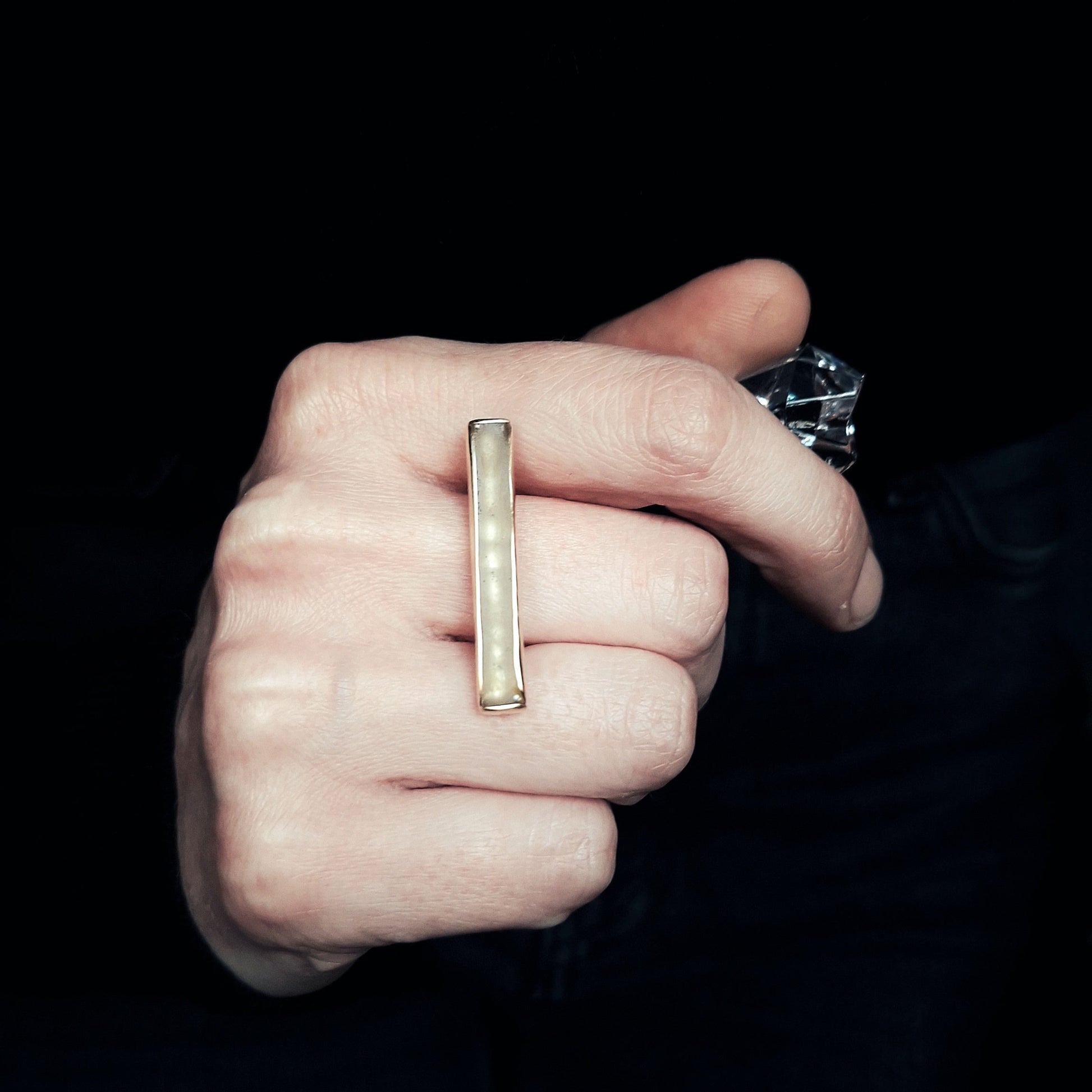Među zlaćanim linijskim rubovima mjedenog okvira viri mat površina - bez boje, mutna i čvrsta kao led na zimskoj hladnoći: ona čini glavu ovog geometrijskog prstena i zadržava jedan djelić ledene površine kao uspomenu na čvrstu, vrlo hladnu i pamtljivu zimu.