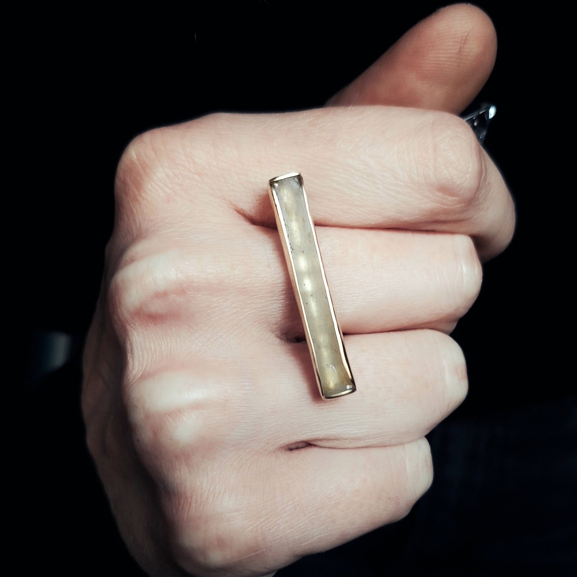 Gorski kristali blago vidljivi i zadržani pod čvrstim slojem epoksidne smole unutar duguljaste glave donose tračak tekstura pod ledom vidljivih pod Suncem.