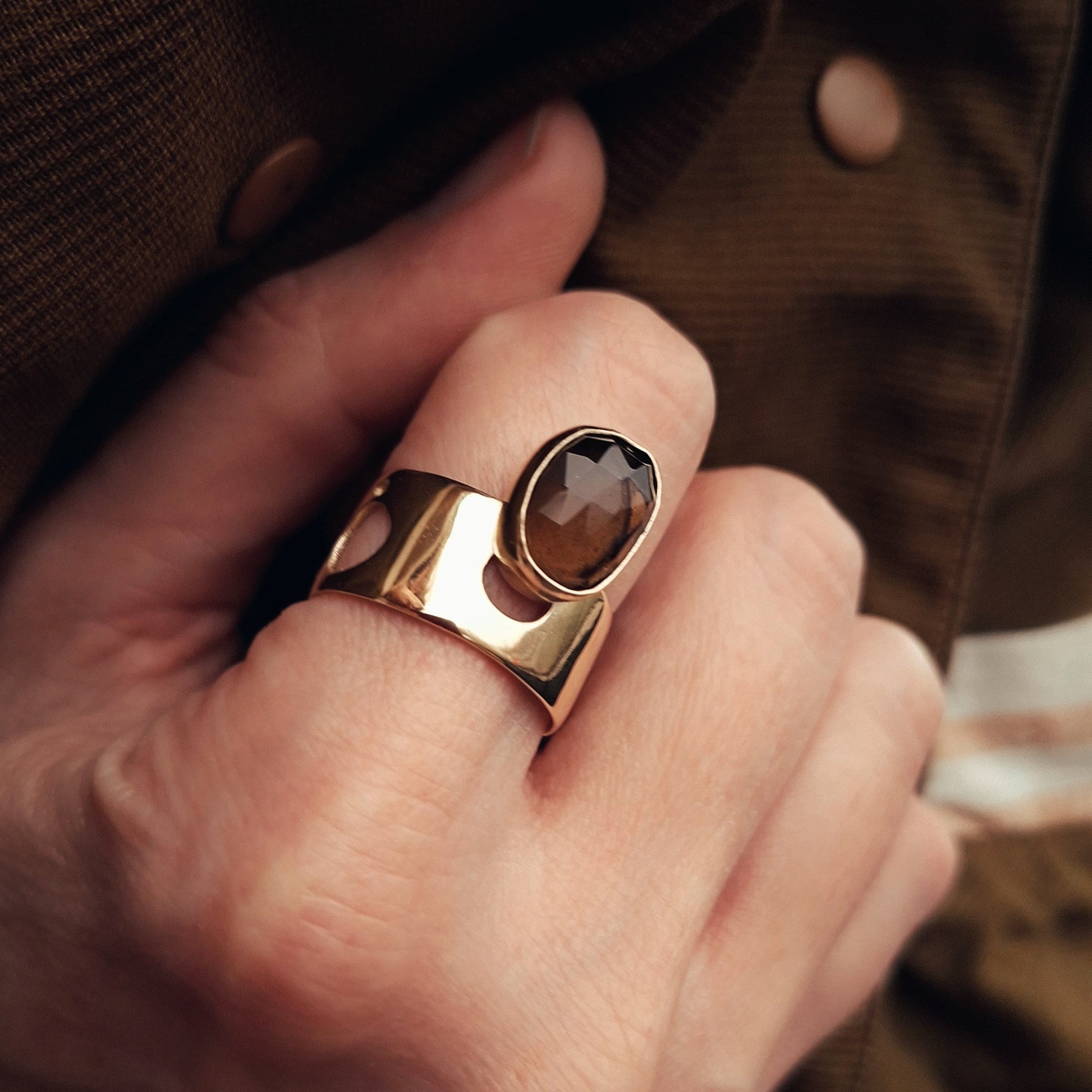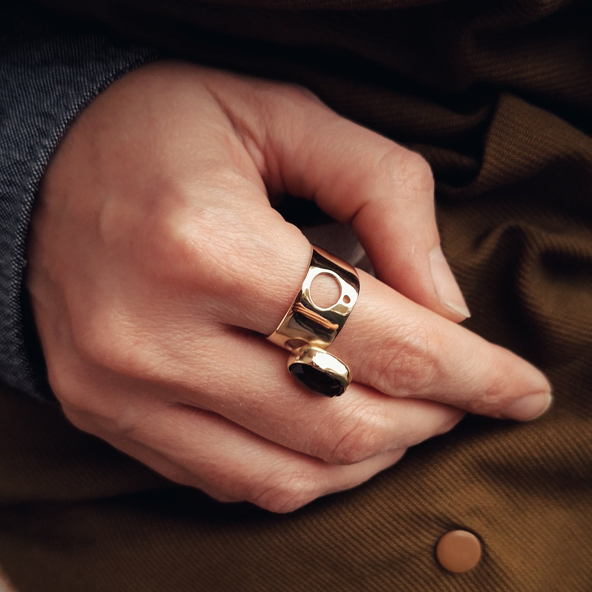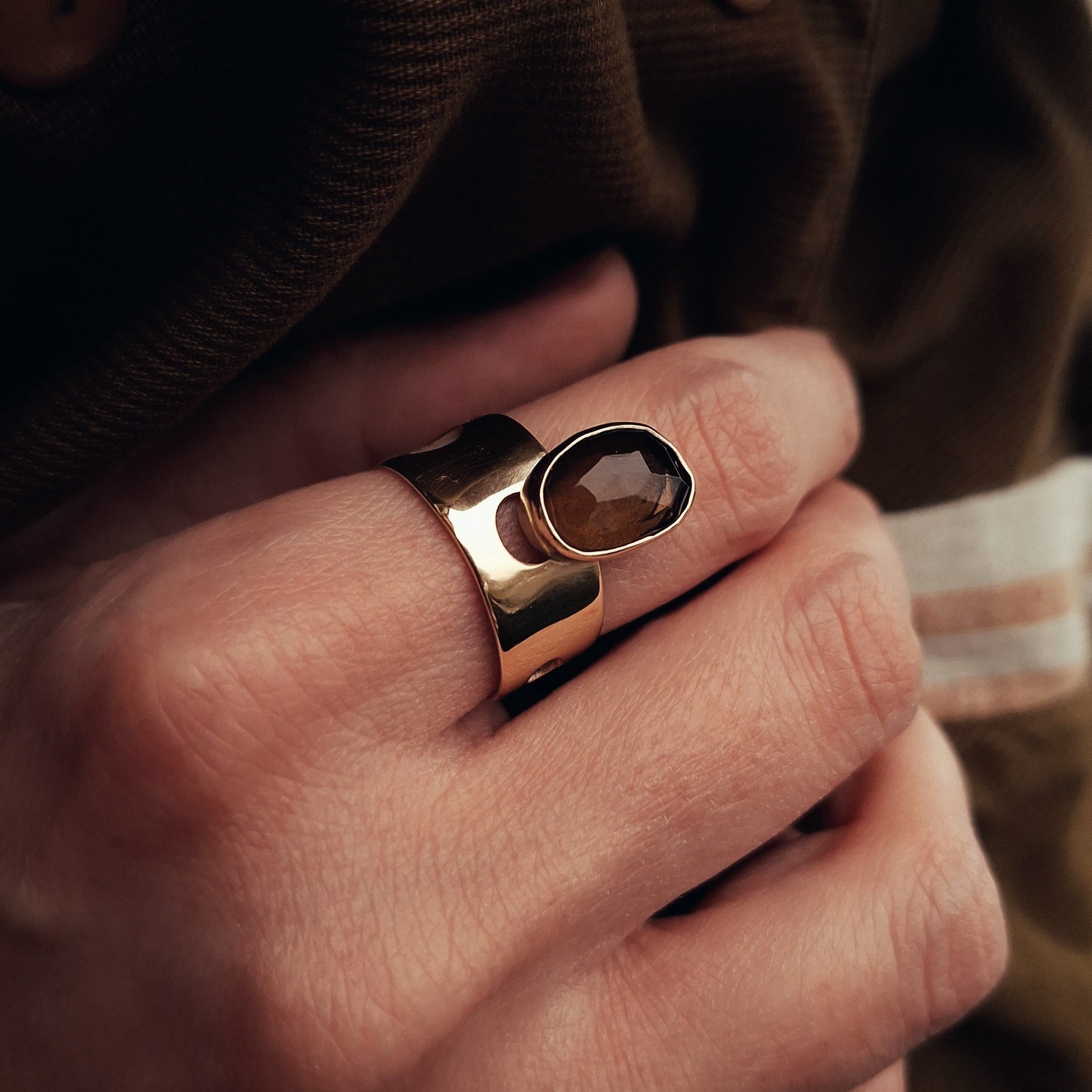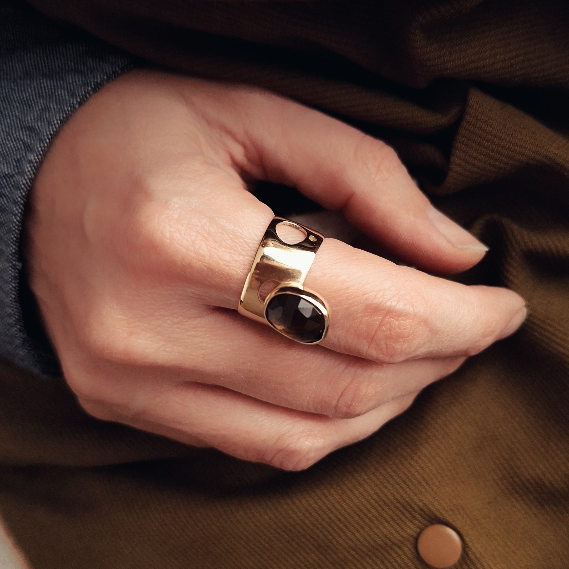 Smokey kvarc blago ovalnog oblika iskače nad ovim blago asimetričim prstenom duž kojeg se prostiru praznine kao simbol drugih, već ubranih maslina.