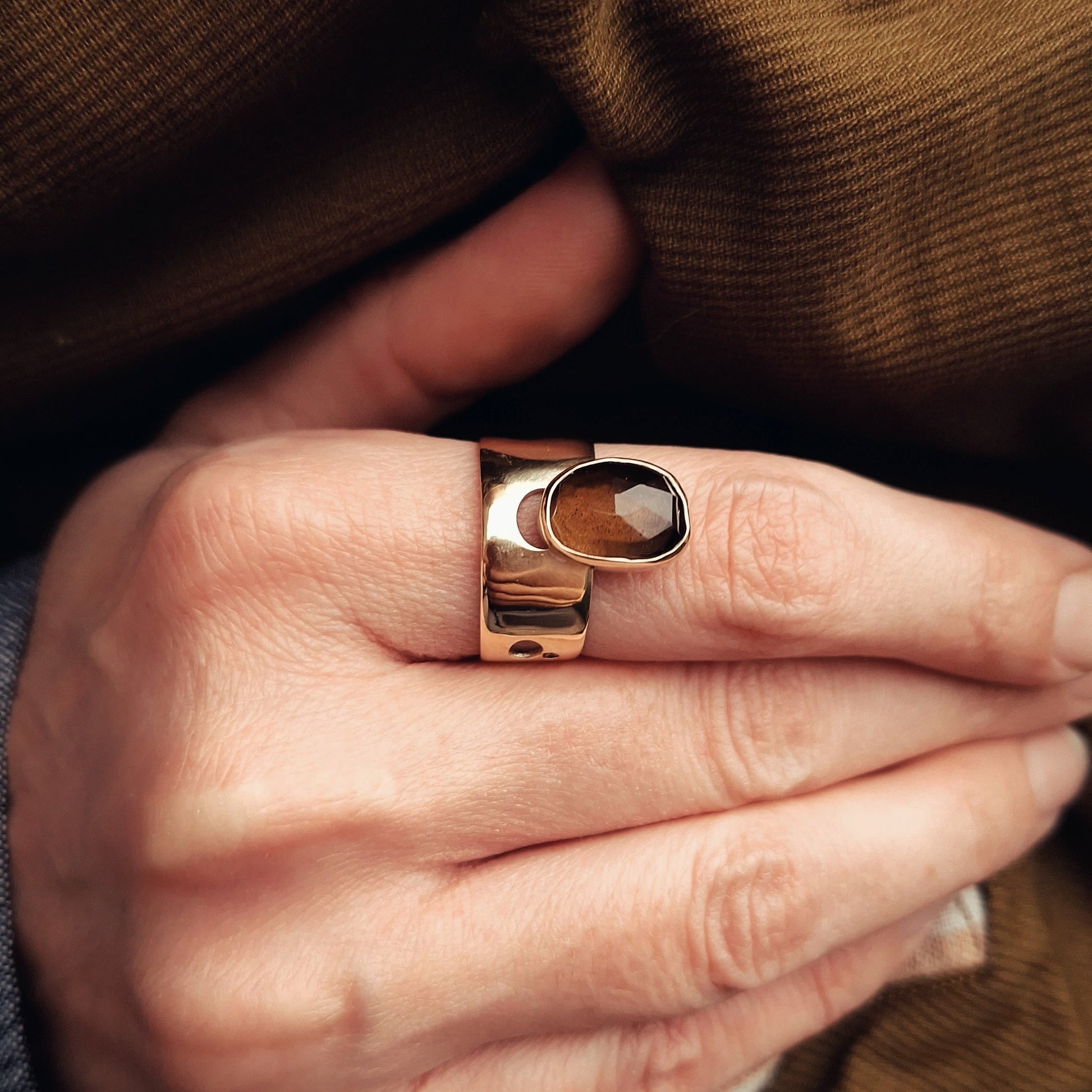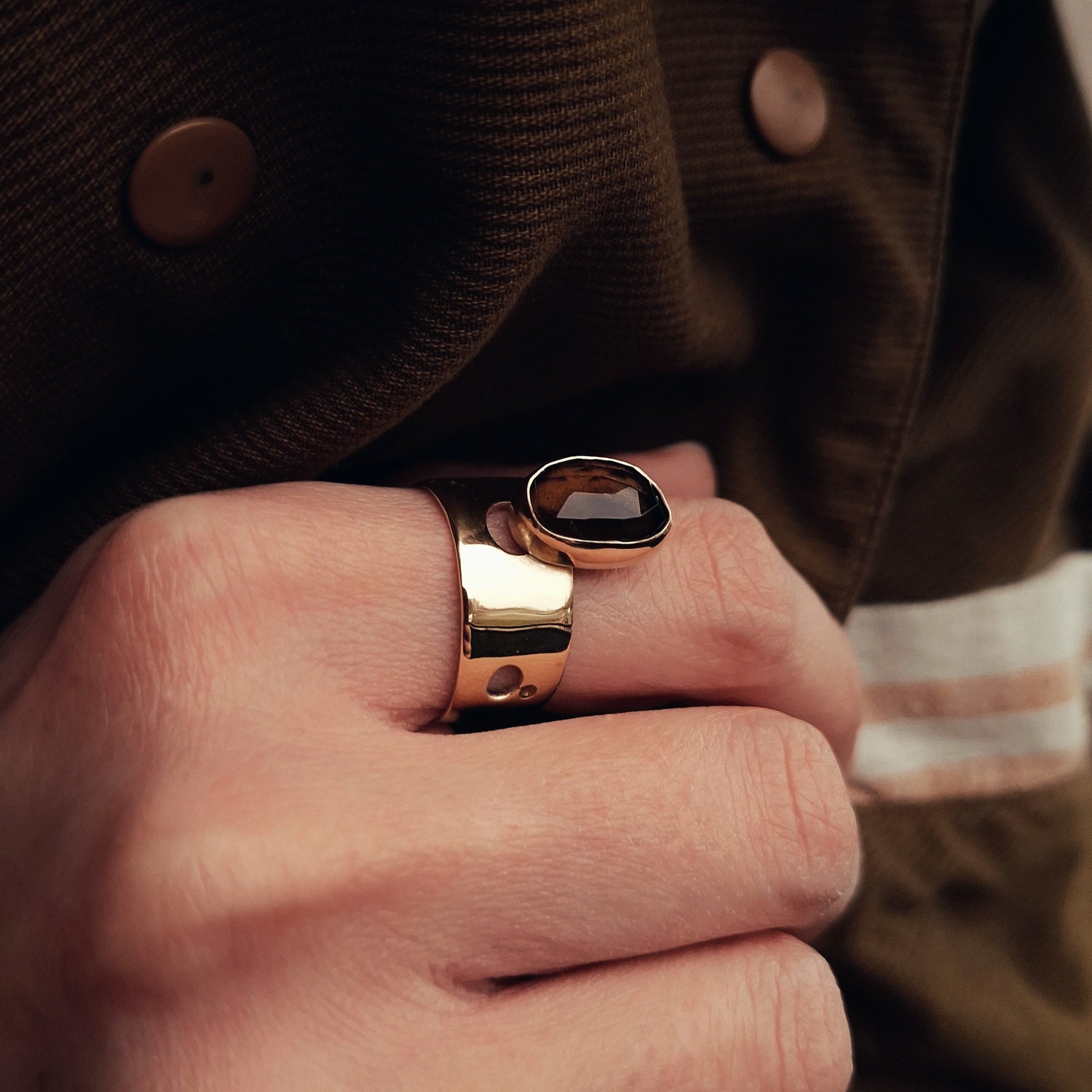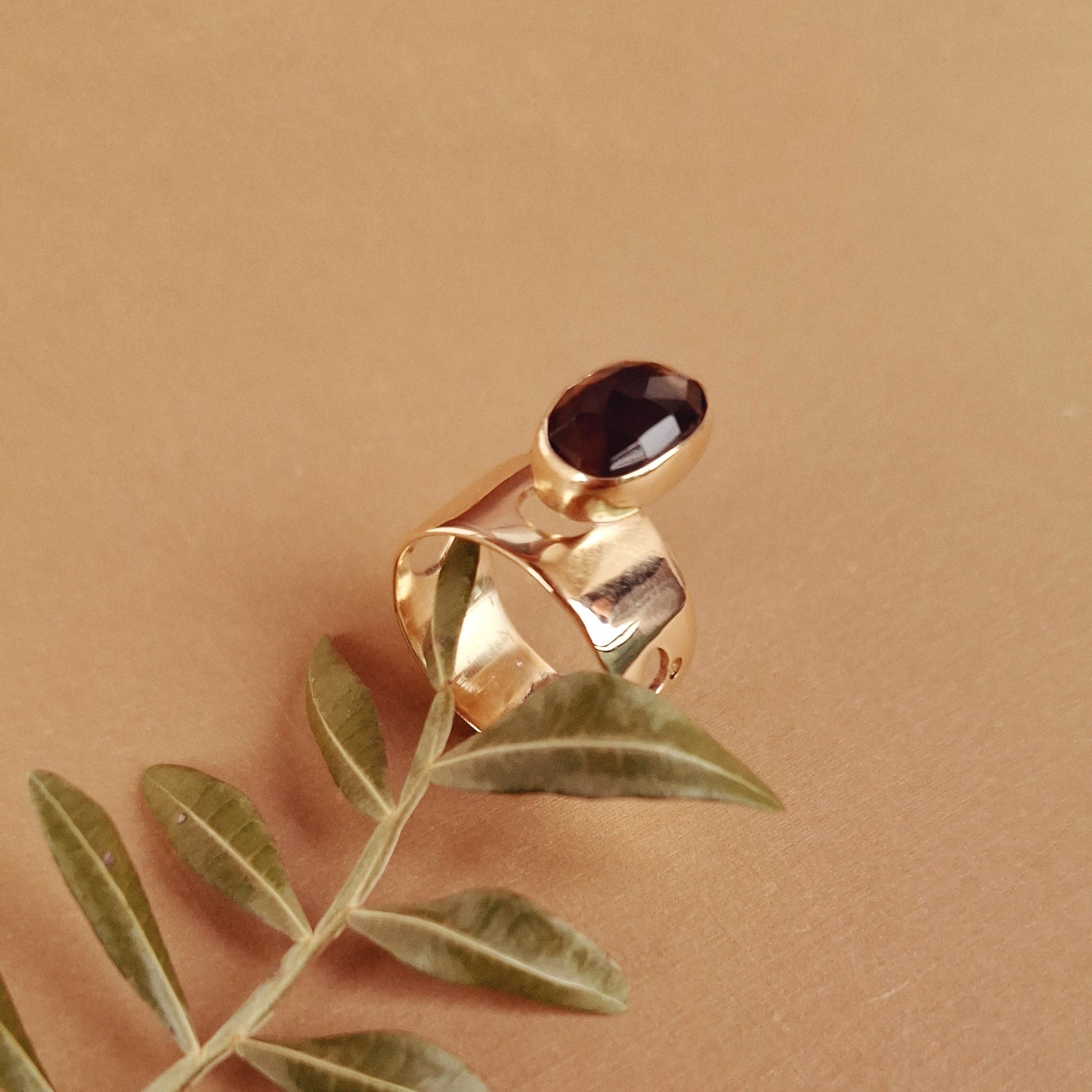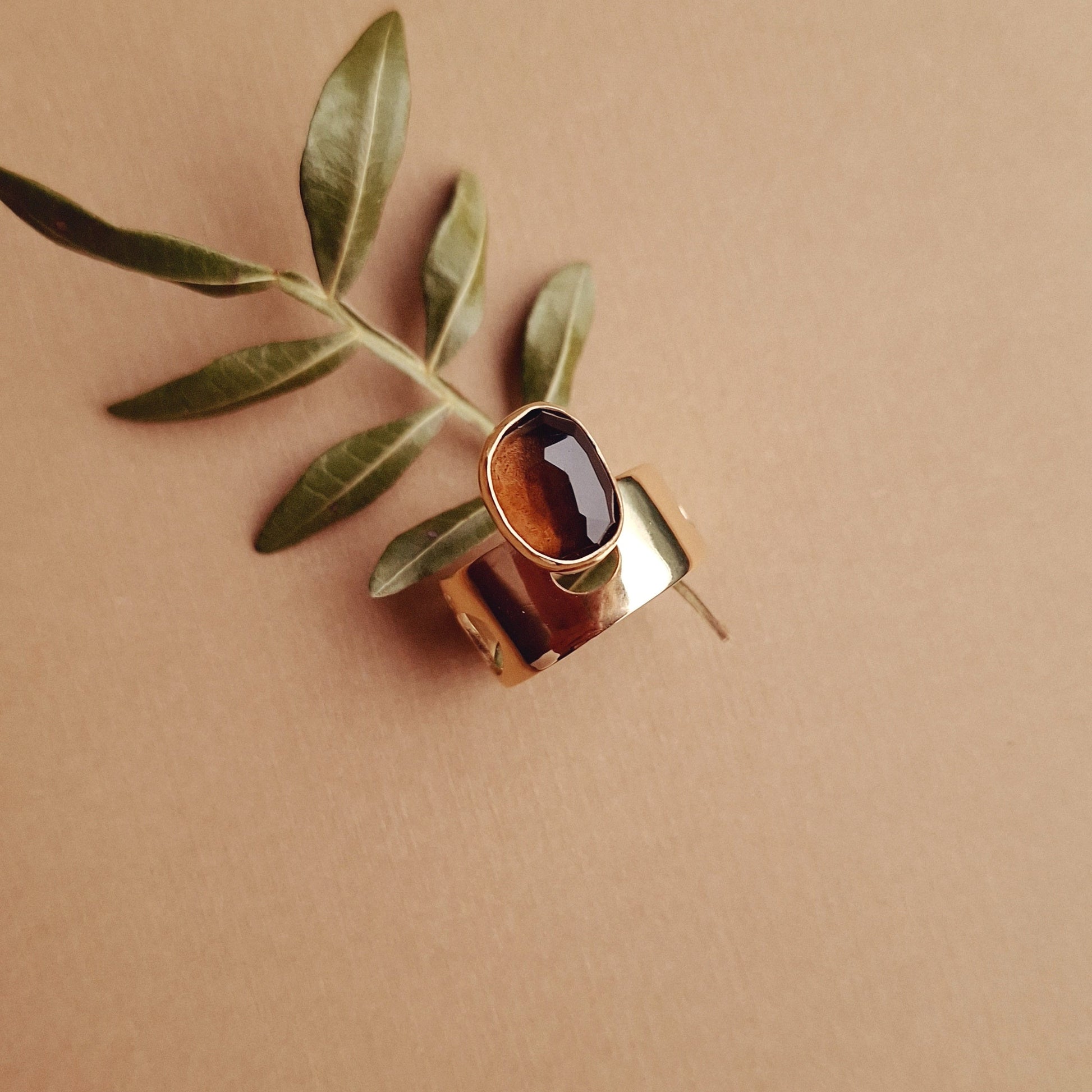 Smokey kvarc blago ovalnog oblika iskače nad ovim blago asimetričim prstenom duž kojeg se prostiru praznine kao simbol drugih, već ubranih maslina.