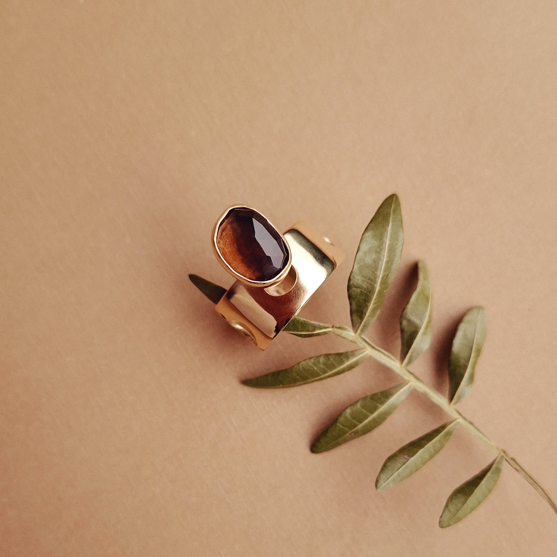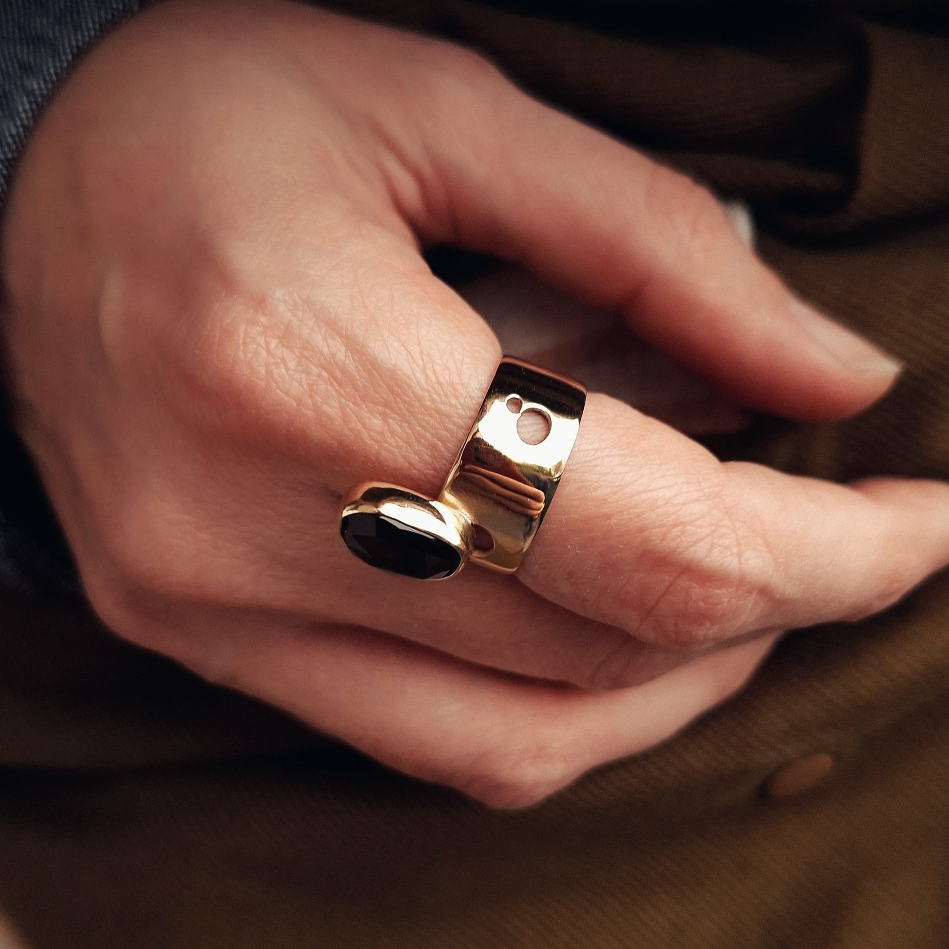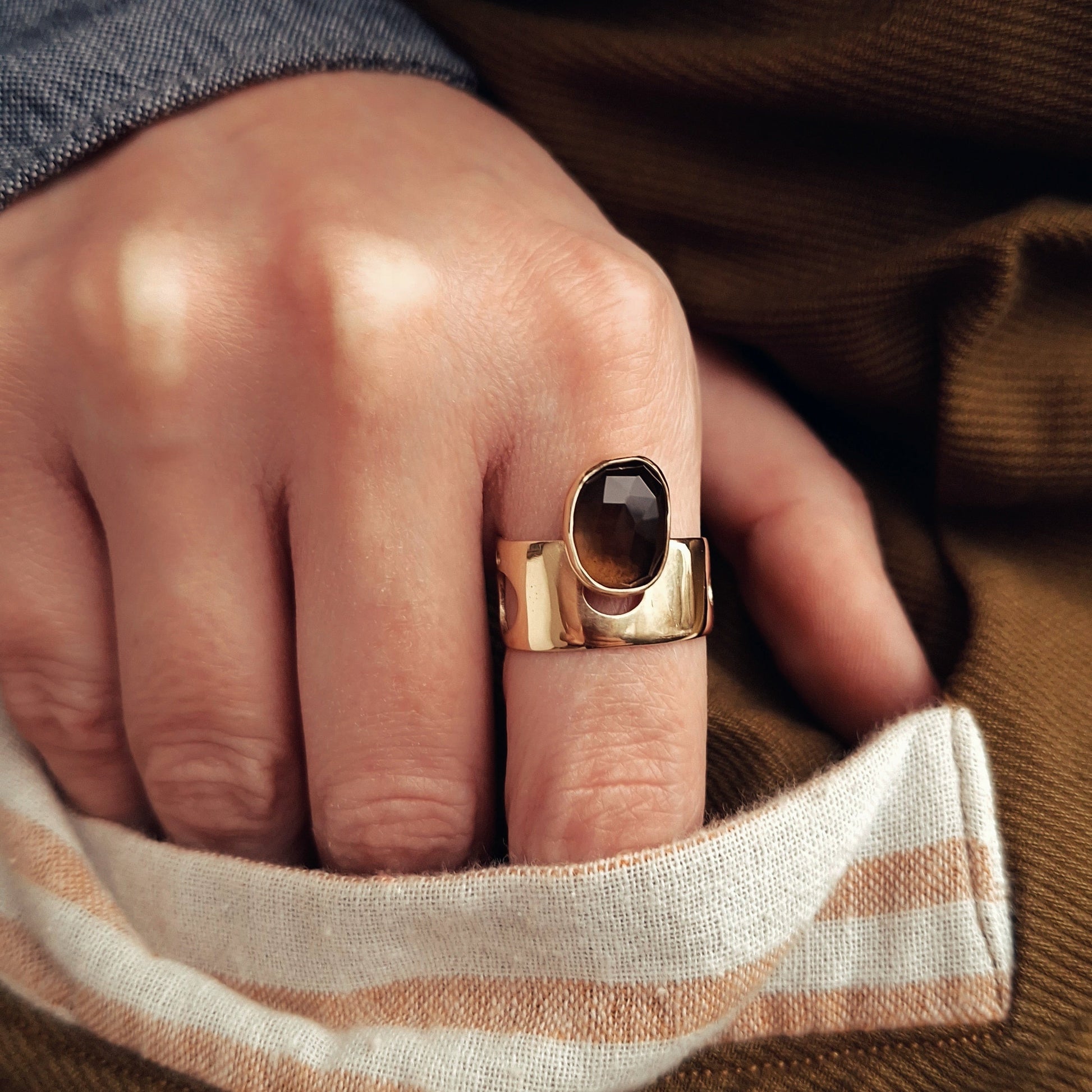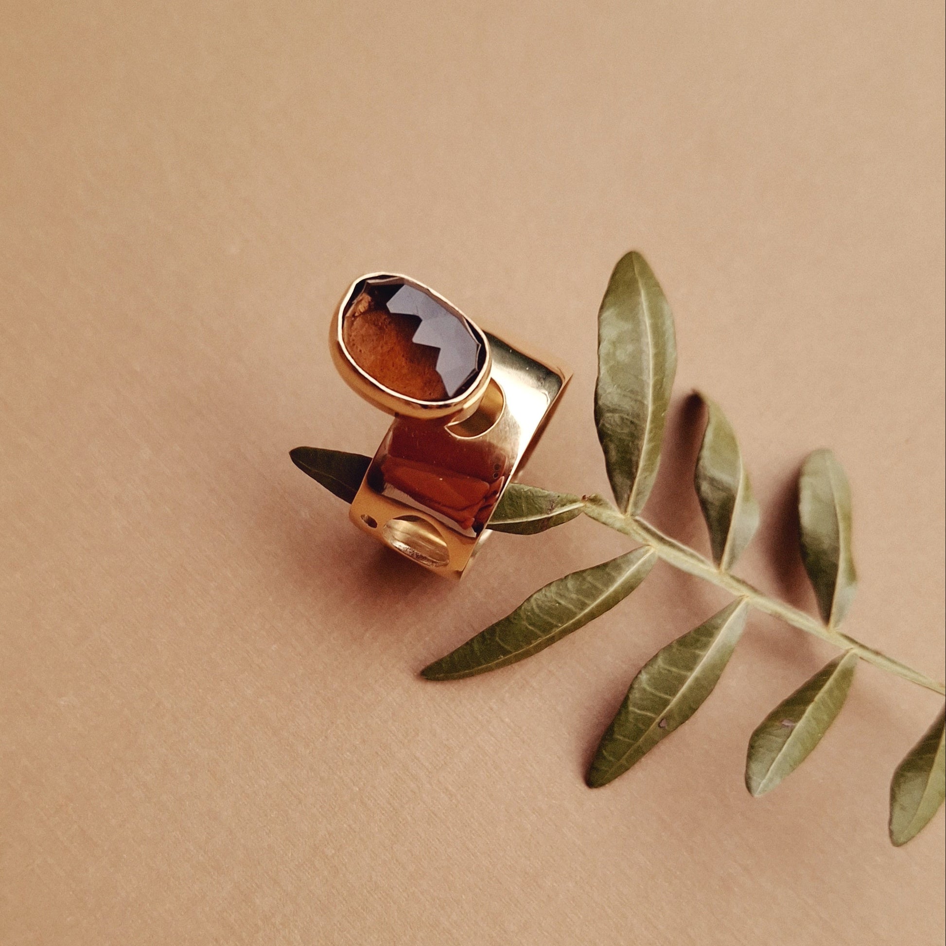 Smokey kvarc blago ovalnog oblika iskače nad ovim blago asimetričim prstenom duž kojeg se prostiru praznine kao simbol drugih, već ubranih maslina.