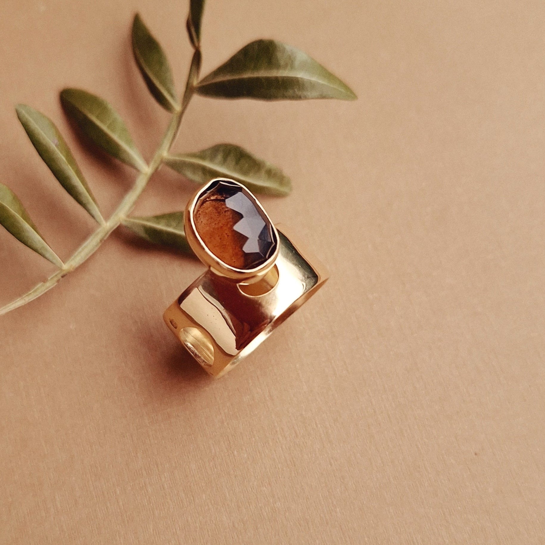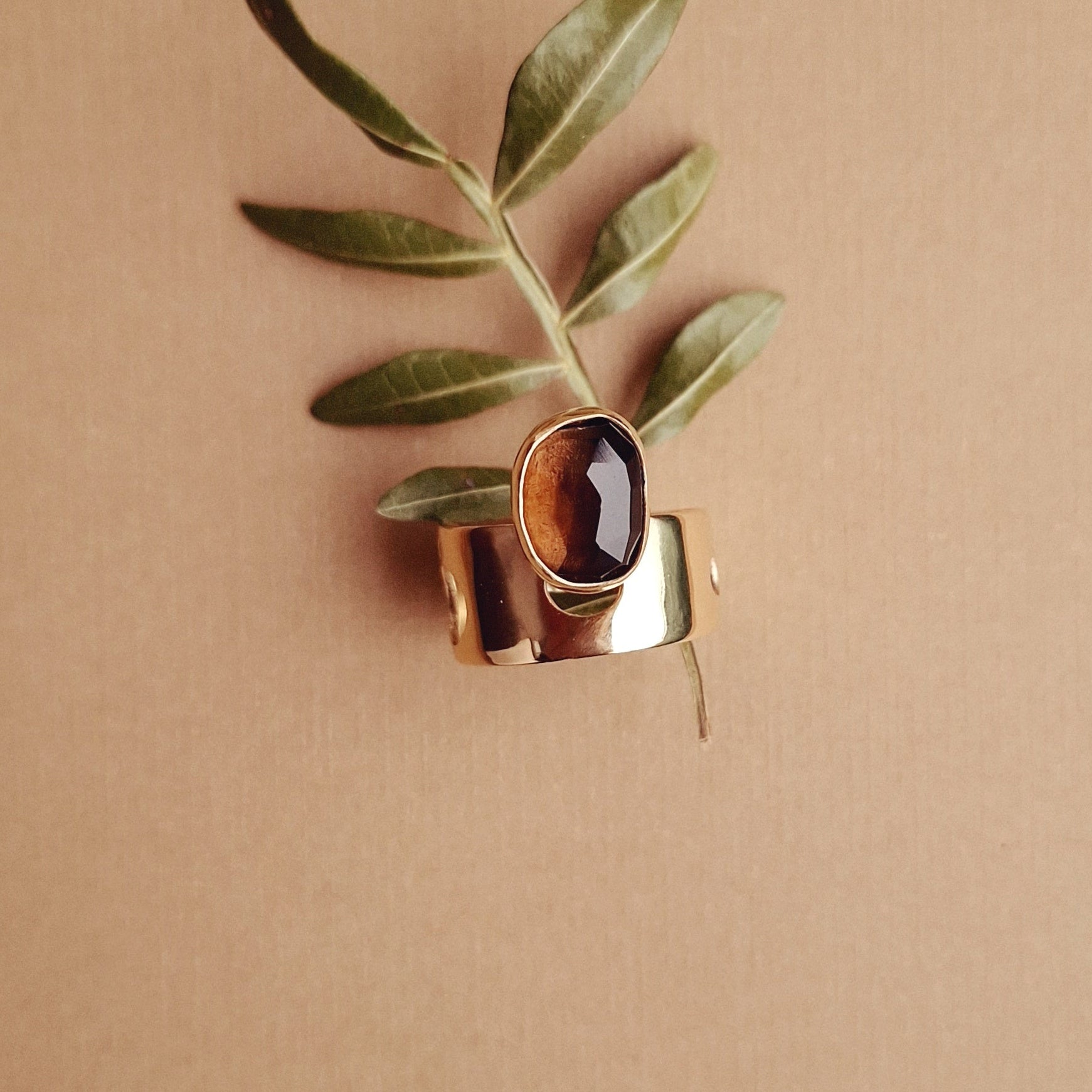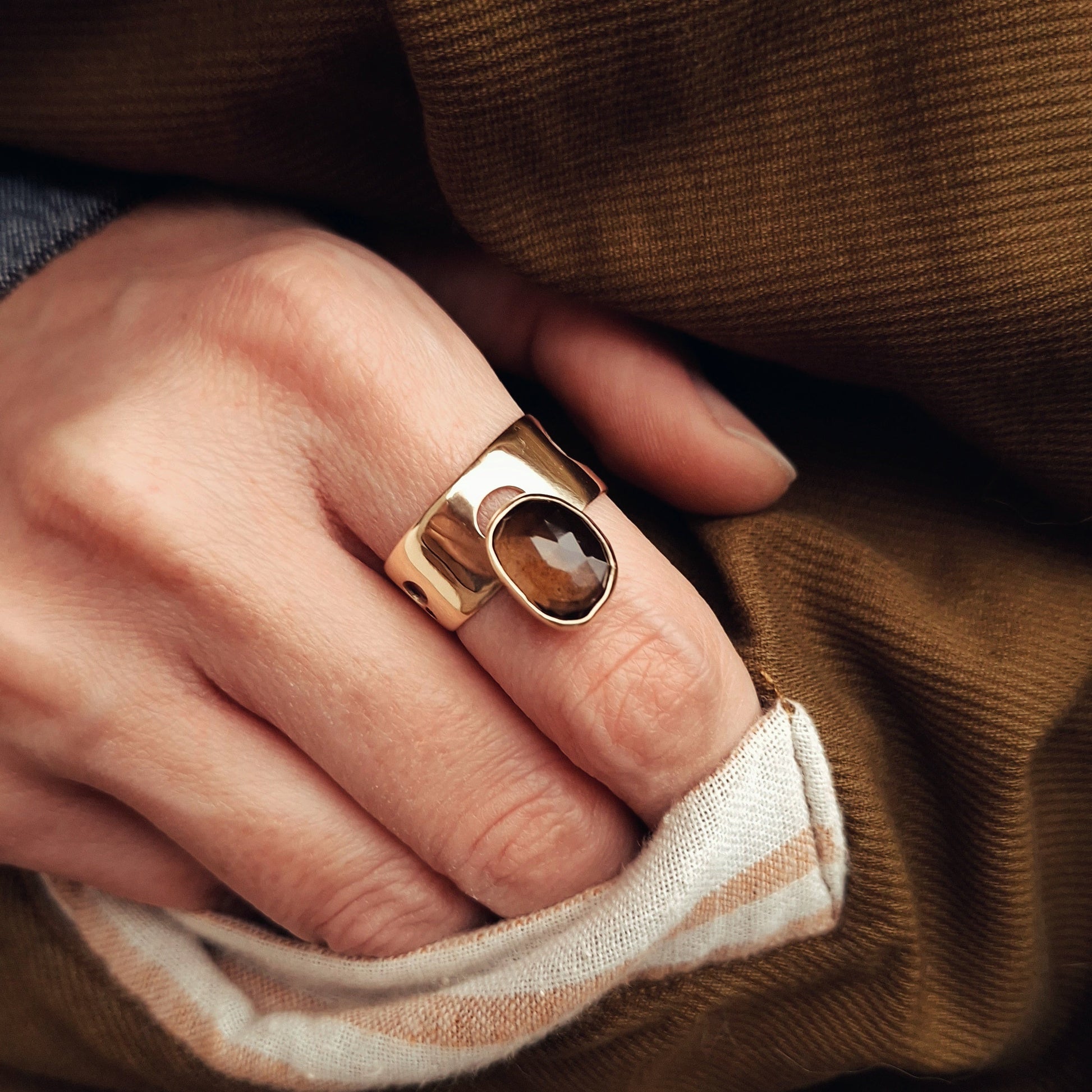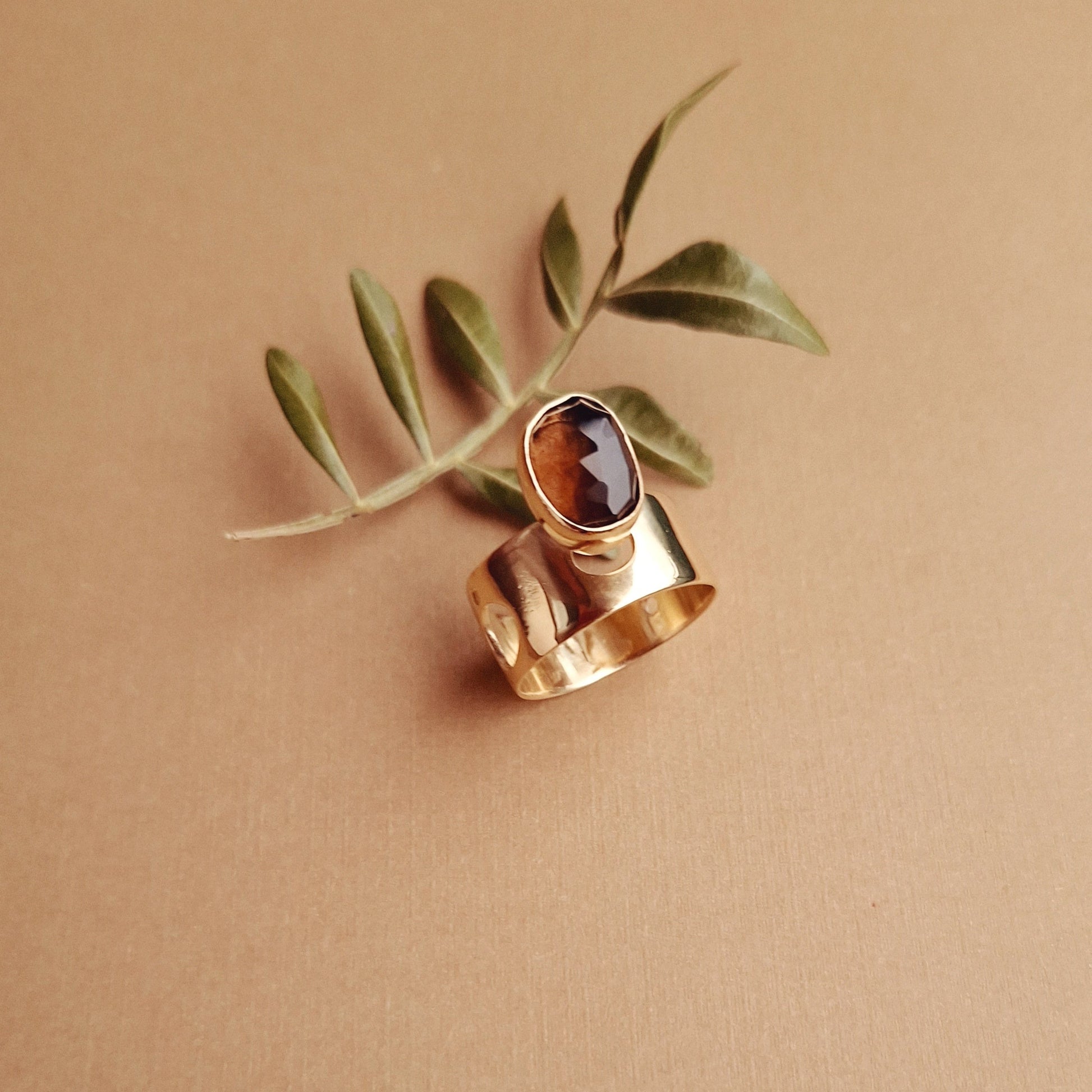 Smokey kvarc blago ovalnog oblika iskače nad ovim blago asimetričim prstenom duž kojeg se prostiru praznine kao simbol drugih, već ubranih maslina.