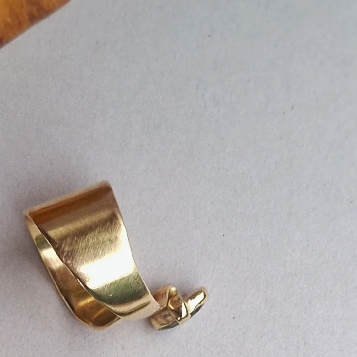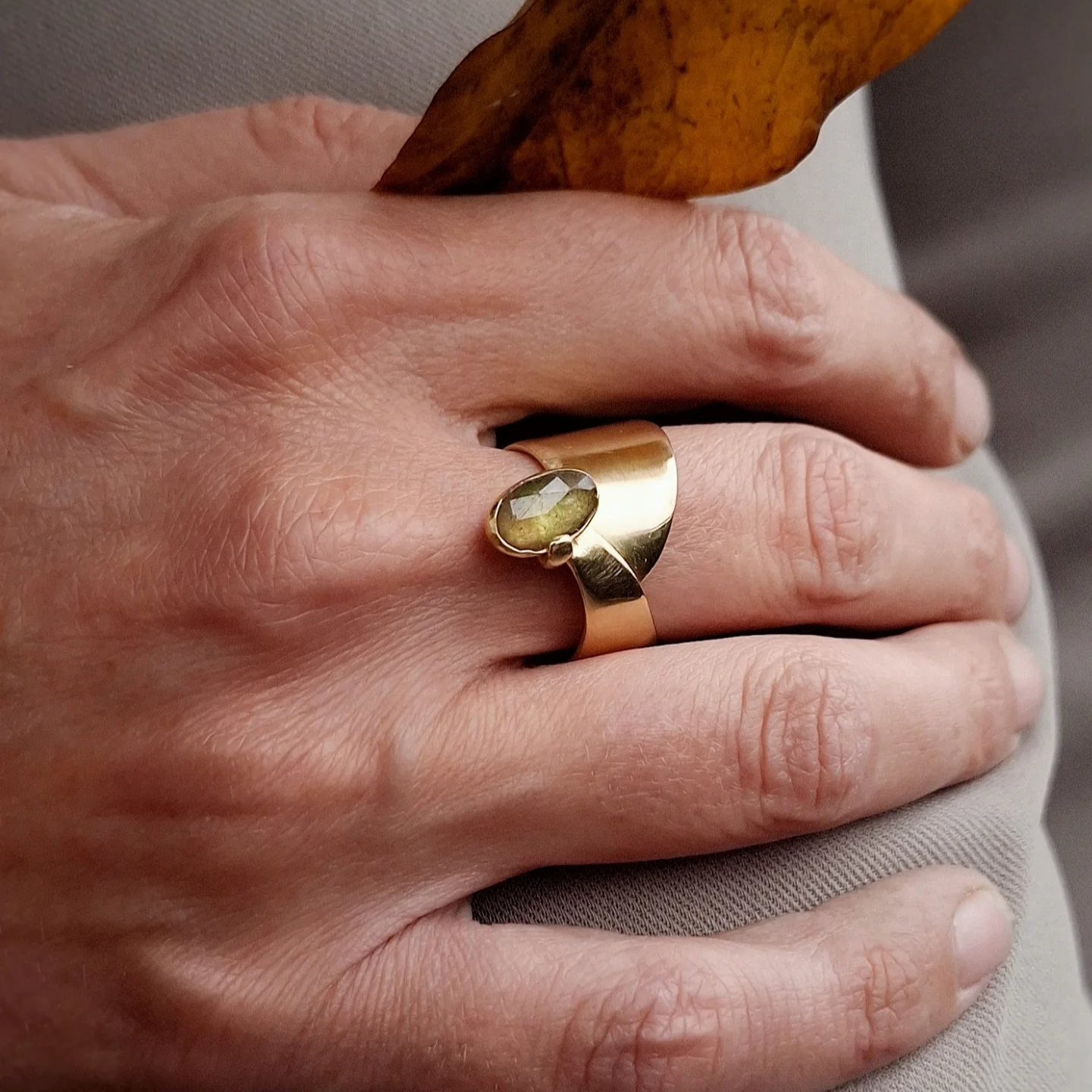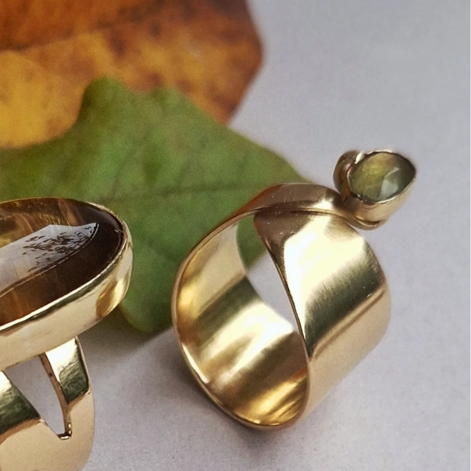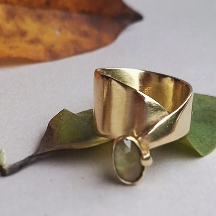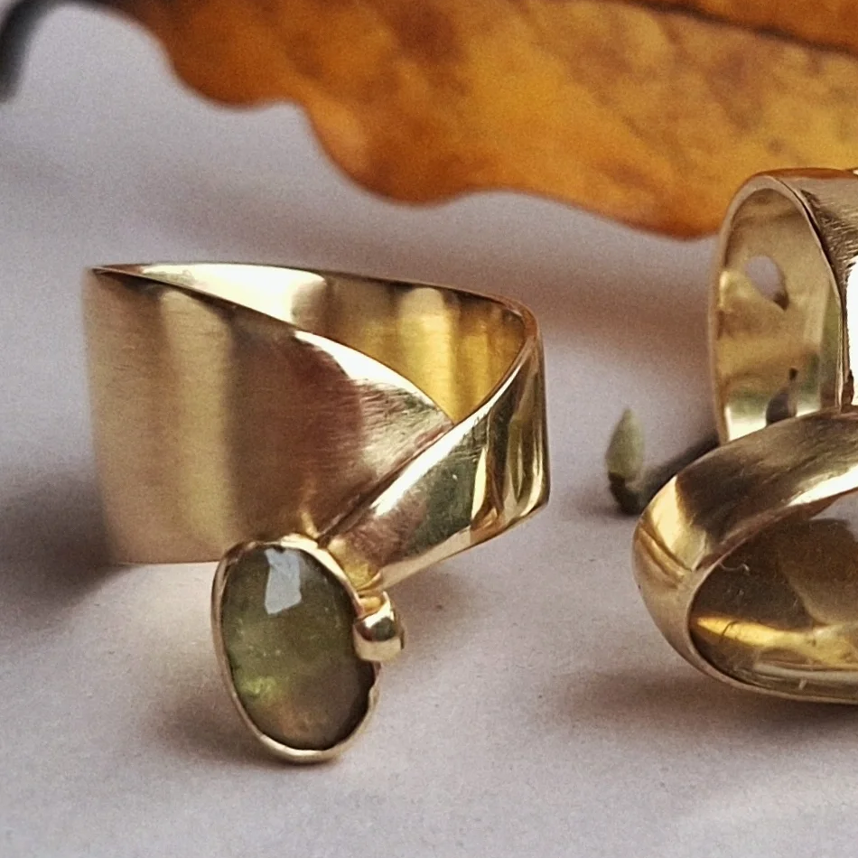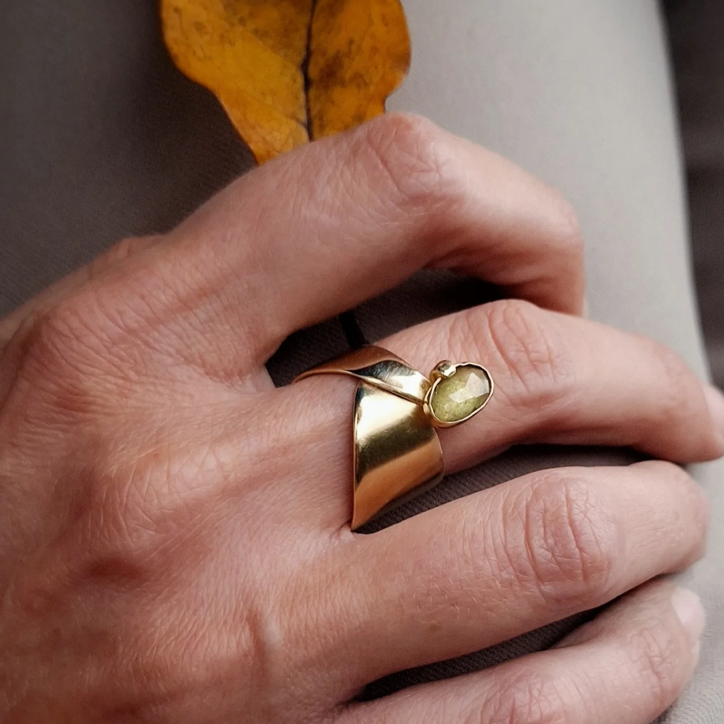Kao jesen, elegantan i tajanstven: unikatni prsten-zamotuljak od mjedi sa zelenim turmalinom, kao grana koja na svojem vrhu drži list na jesenskom vjetru.