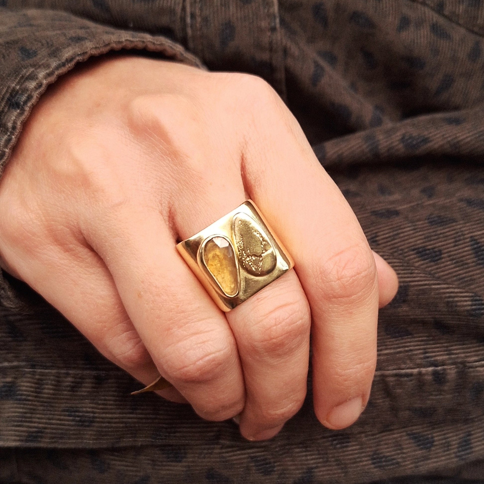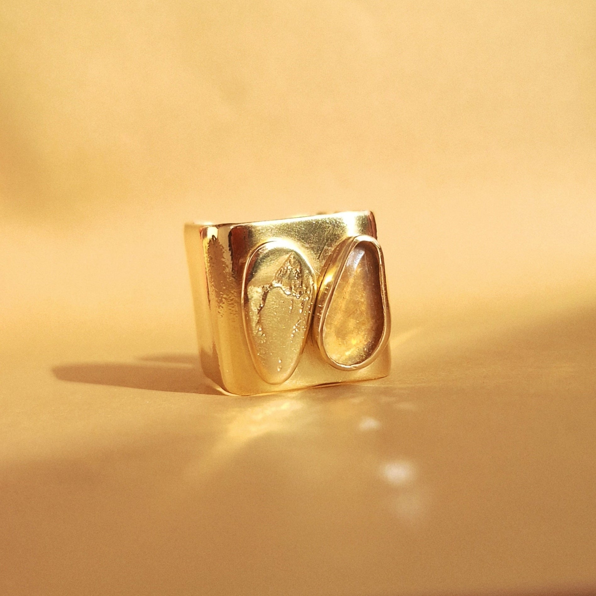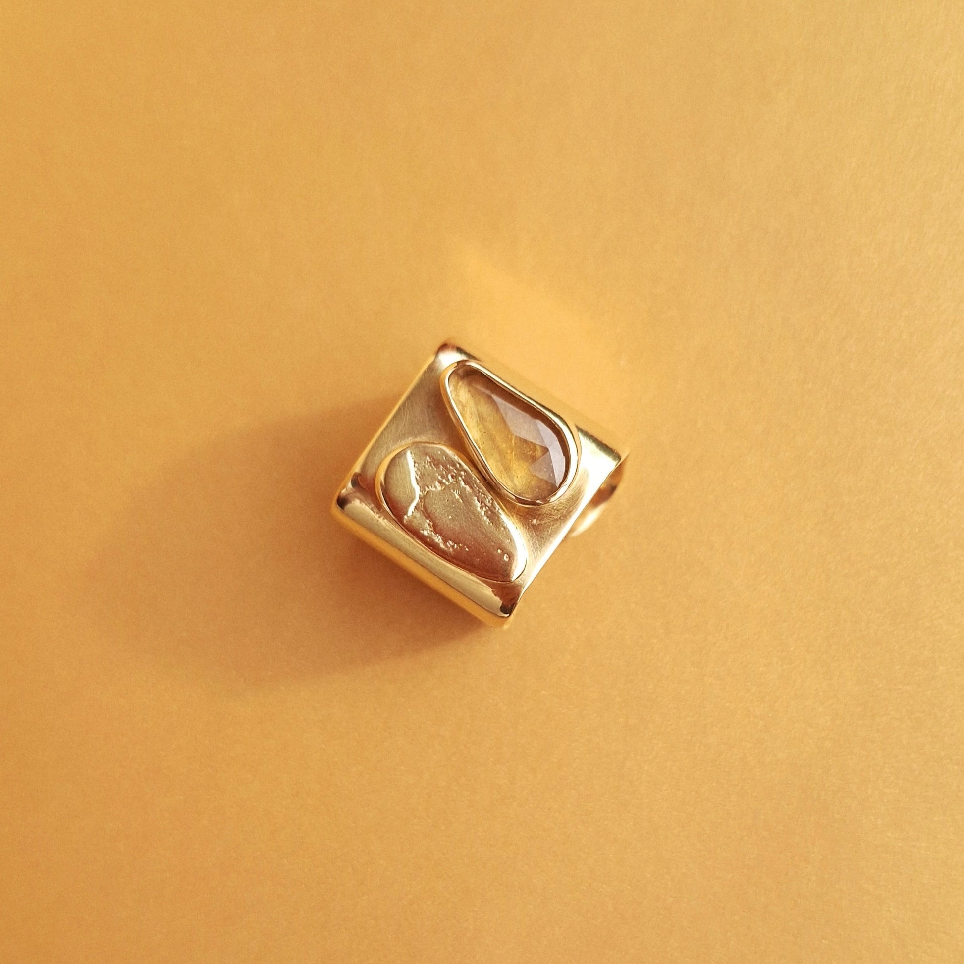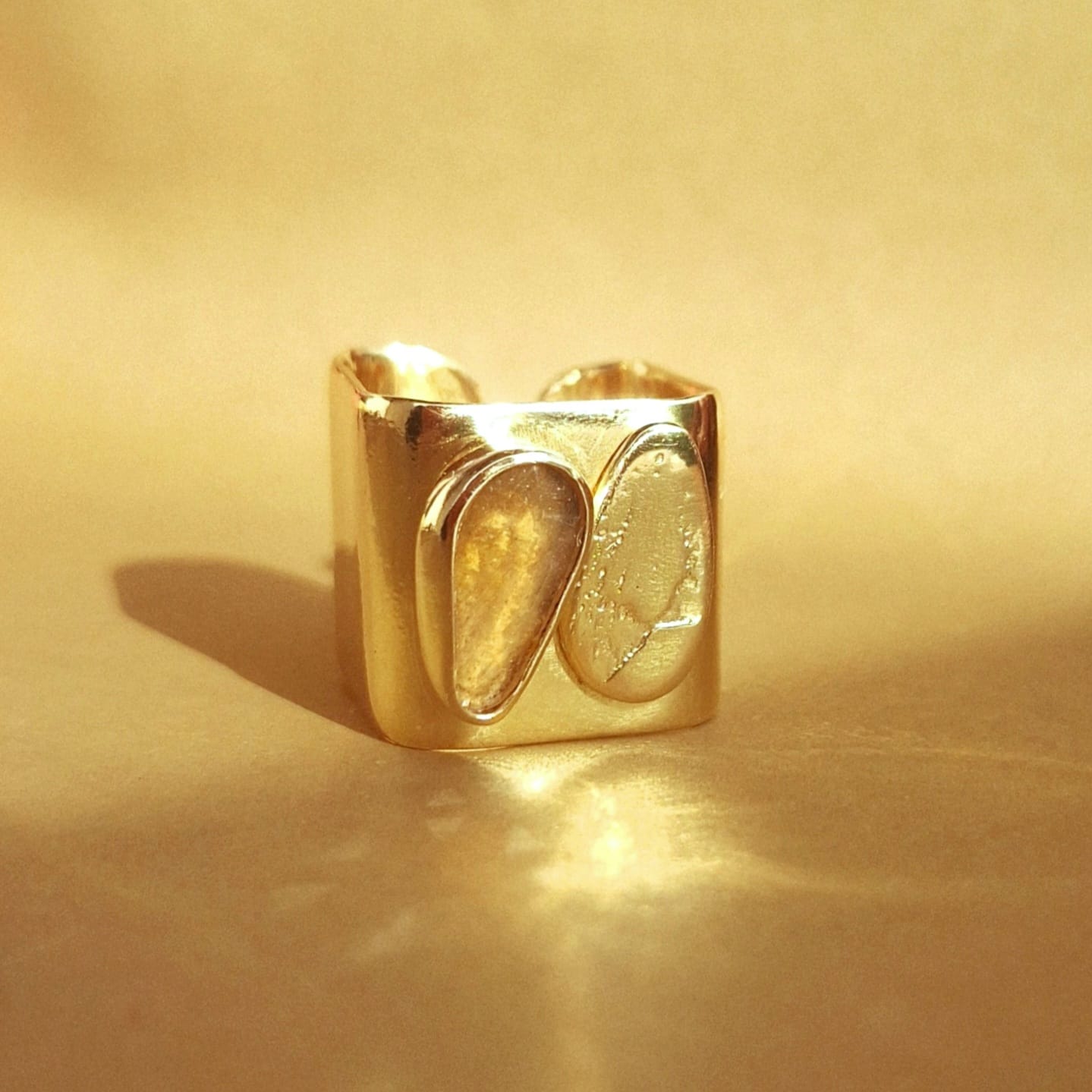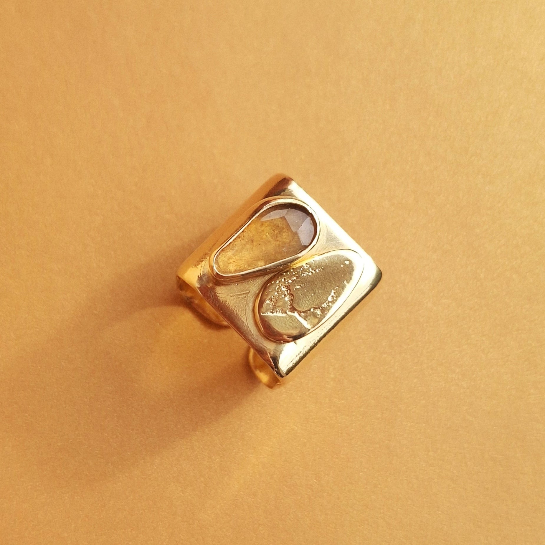 Uglati prsten s ukrasima organskih oblika: dvije kapljice ulja - jedna bistra, a druga teksturirana. Turmalin toplih žućkasto-narančastih tonova, kao odležano ulje i detalj od jetkane mjedi, koji kao da nosi čestice mladog, još nefiltriranog ulja.