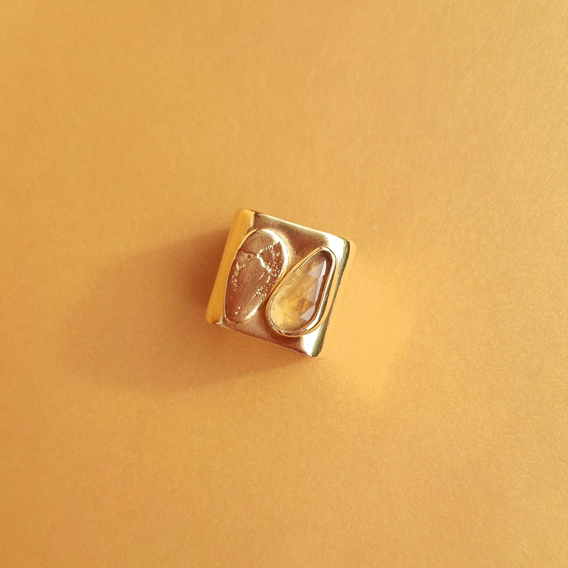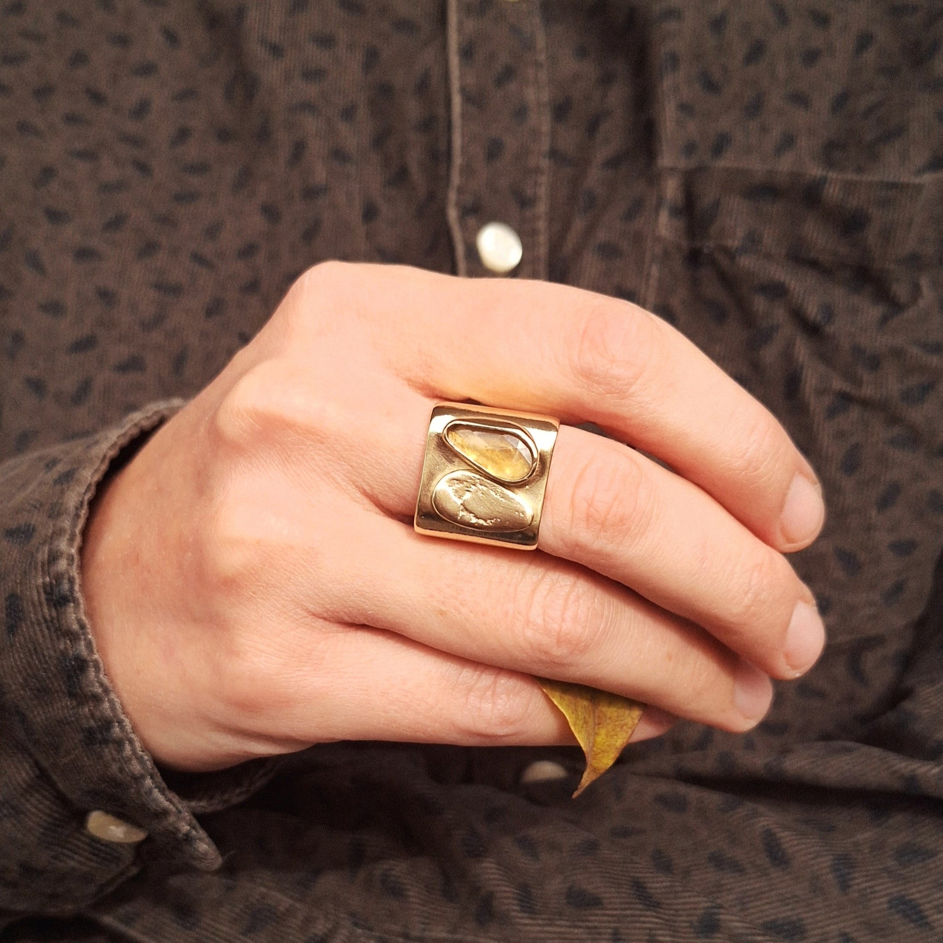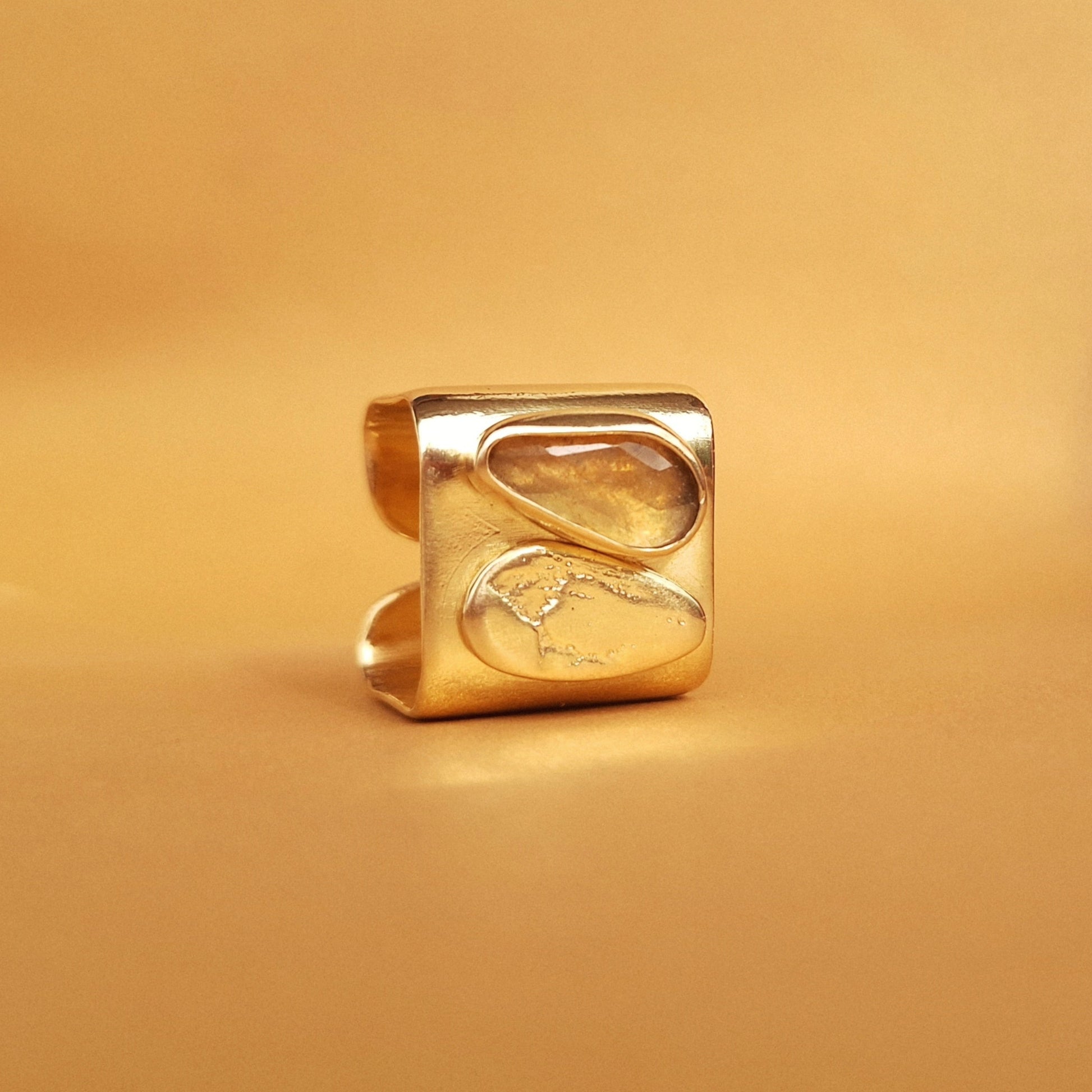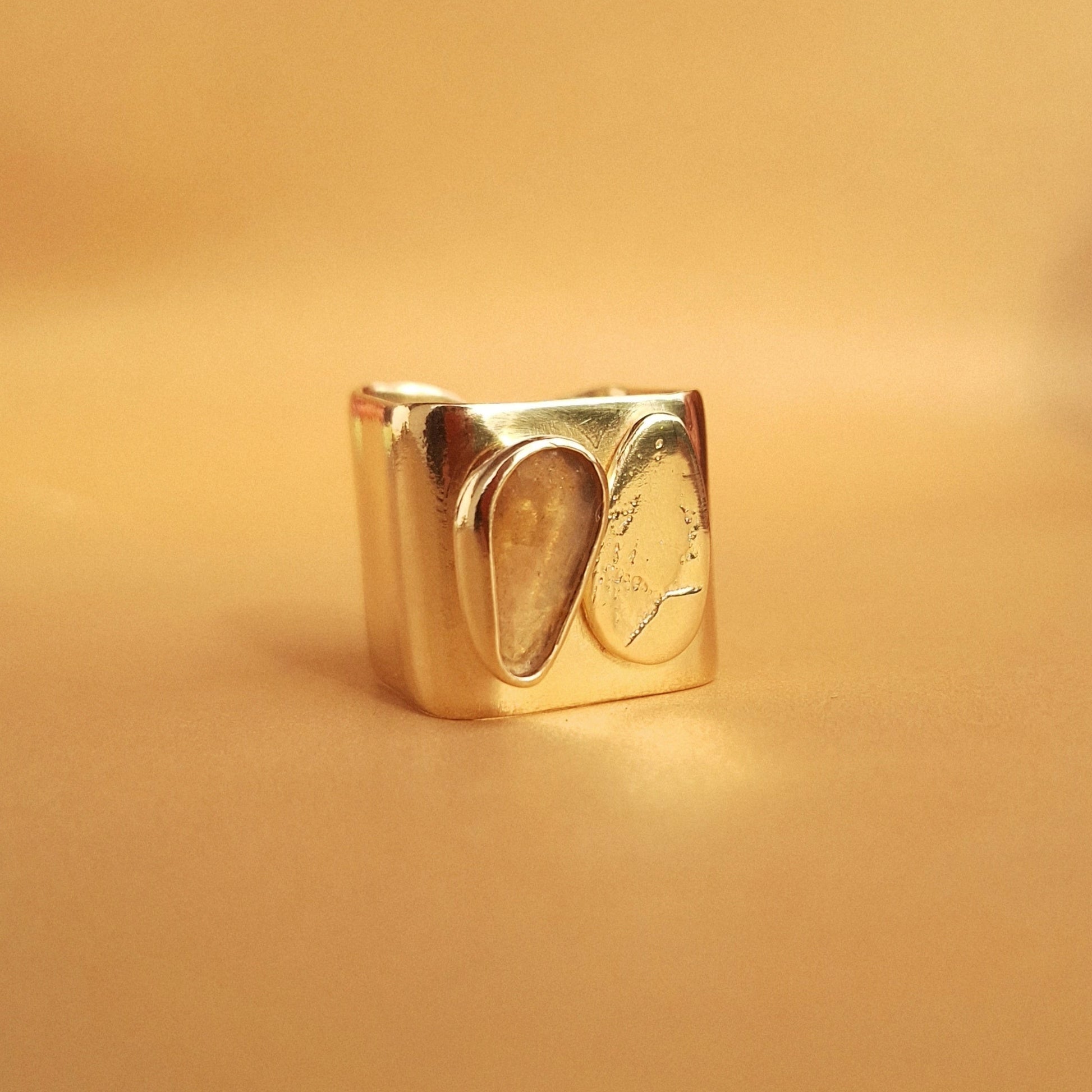 Uglati prsten s ukrasima organskih oblika: dvije kapljice ulja - jedna bistra, a druga teksturirana. Turmalin toplih žućkasto-narančastih tonova, kao odležano ulje i detalj od jetkane mjedi, koji kao da nosi čestice mladog, još nefiltriranog ulja.