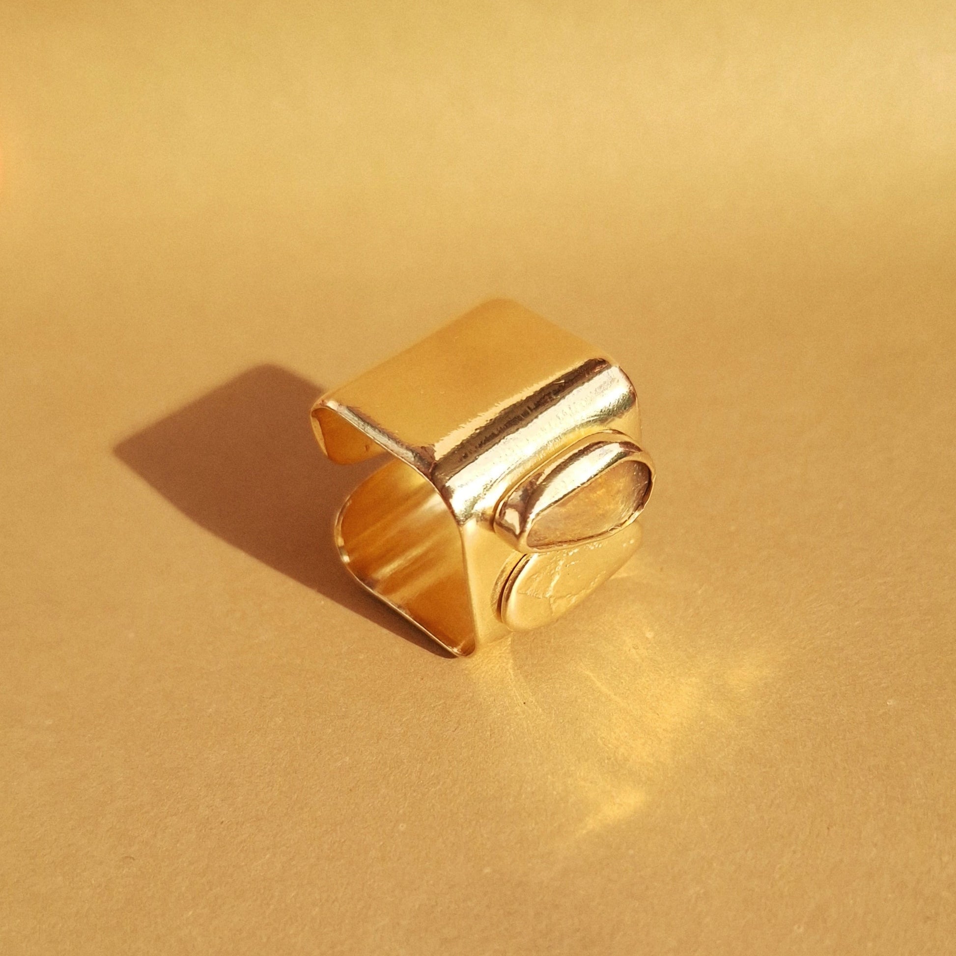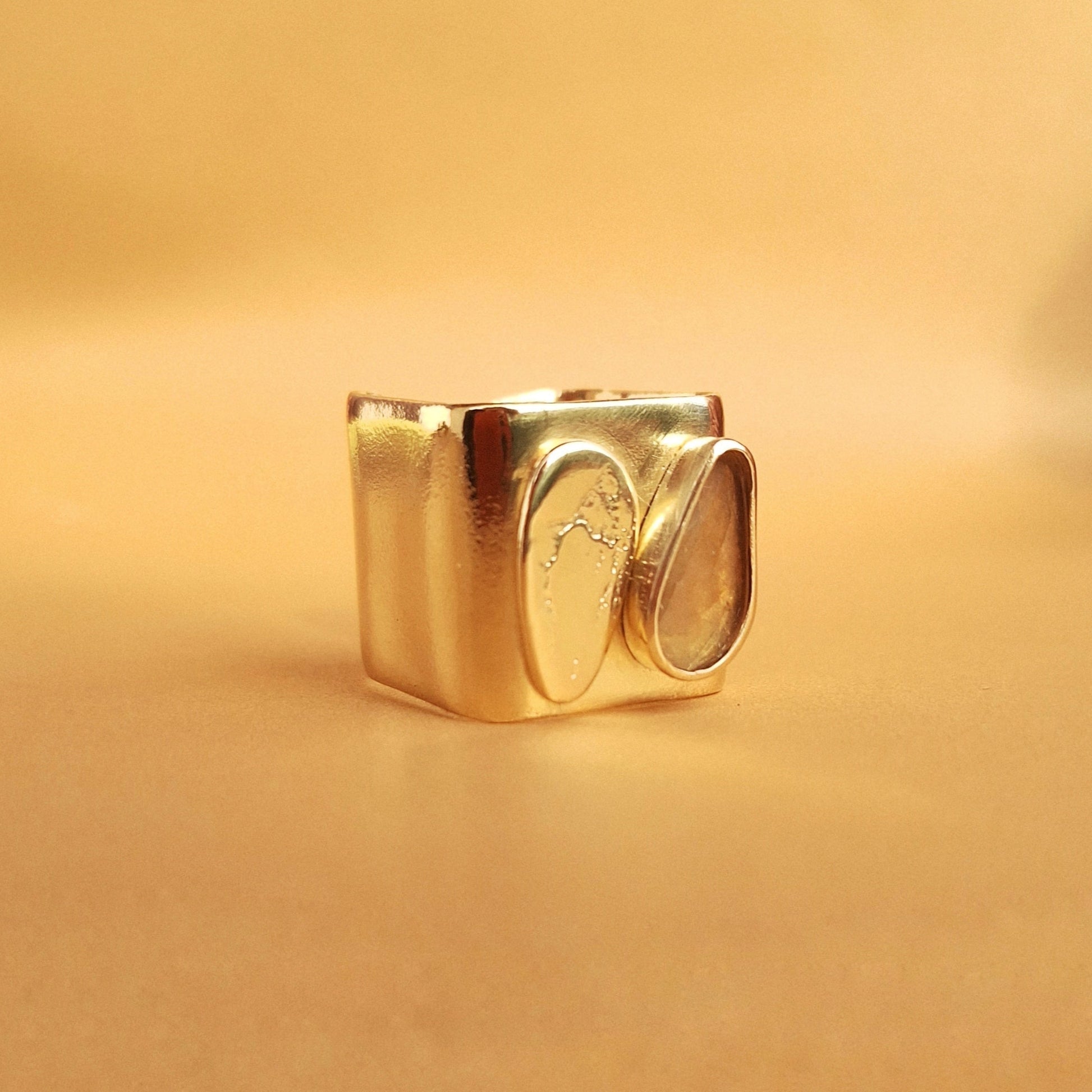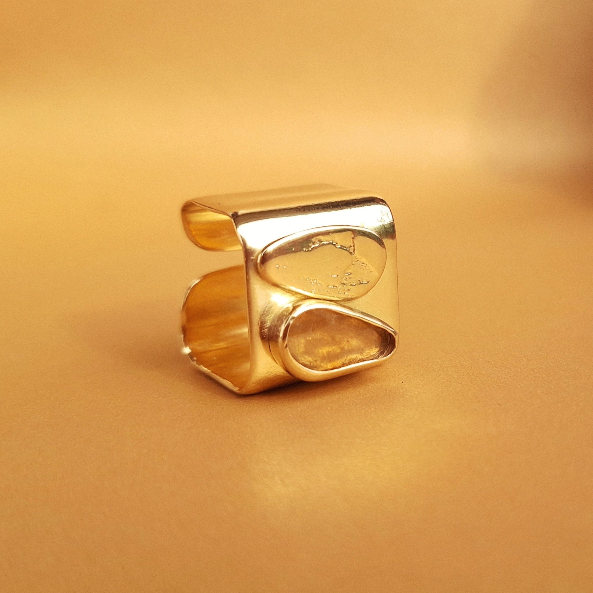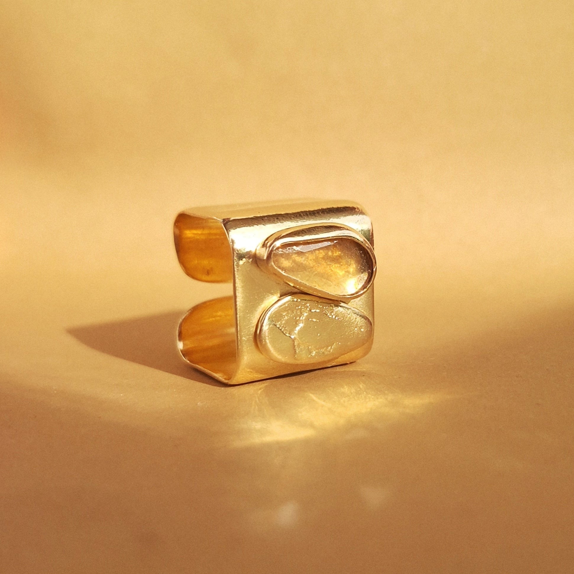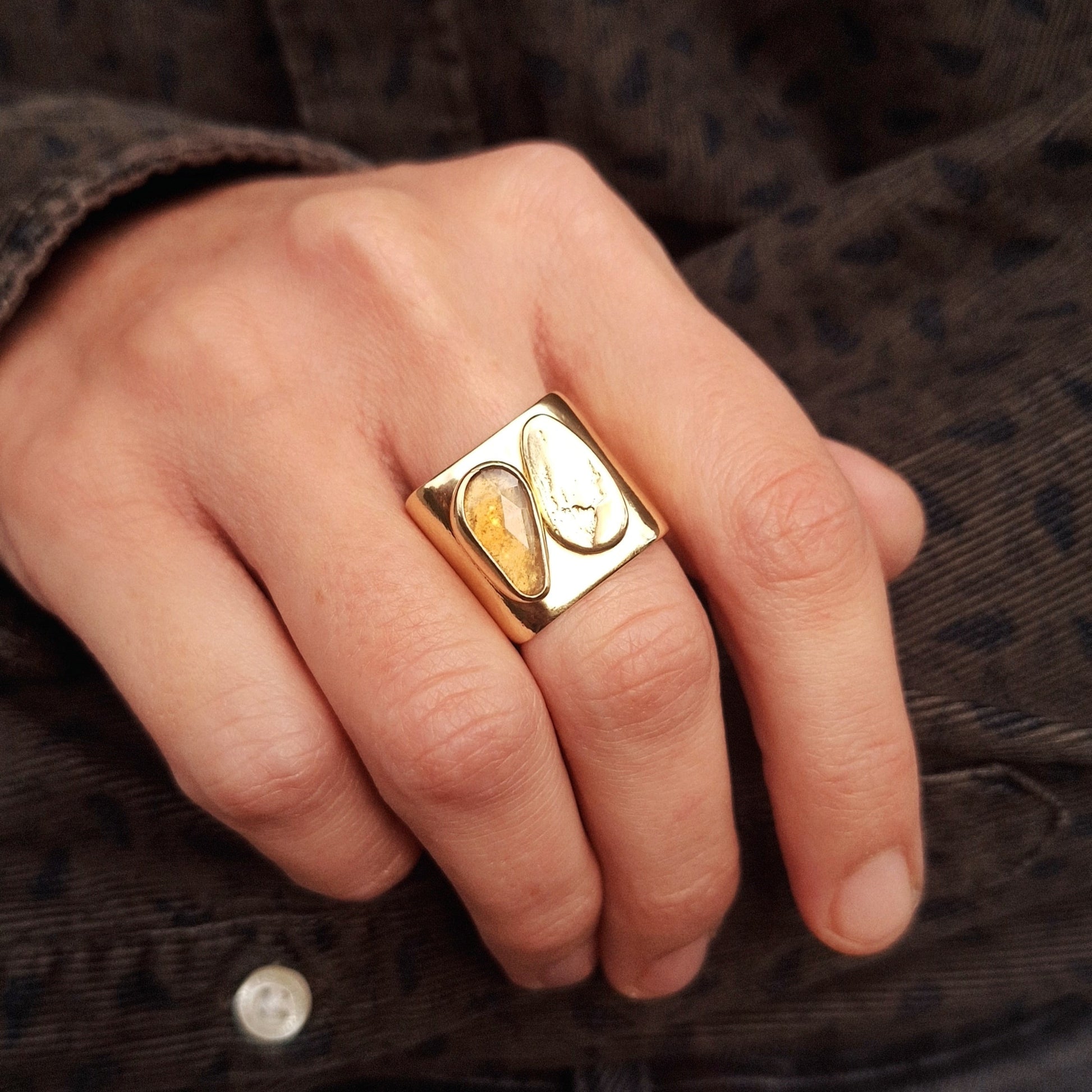 Uglati prsten s ukrasima organskih oblika: dvije kapljice ulja - jedna bistra, a druga teksturirana. Turmalin toplih žućkasto-narančastih tonova, kao odležano ulje i detalj od jetkane mjedi, koji kao da nosi čestice mladog, još nefiltriranog ulja.