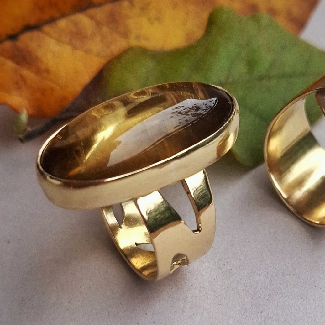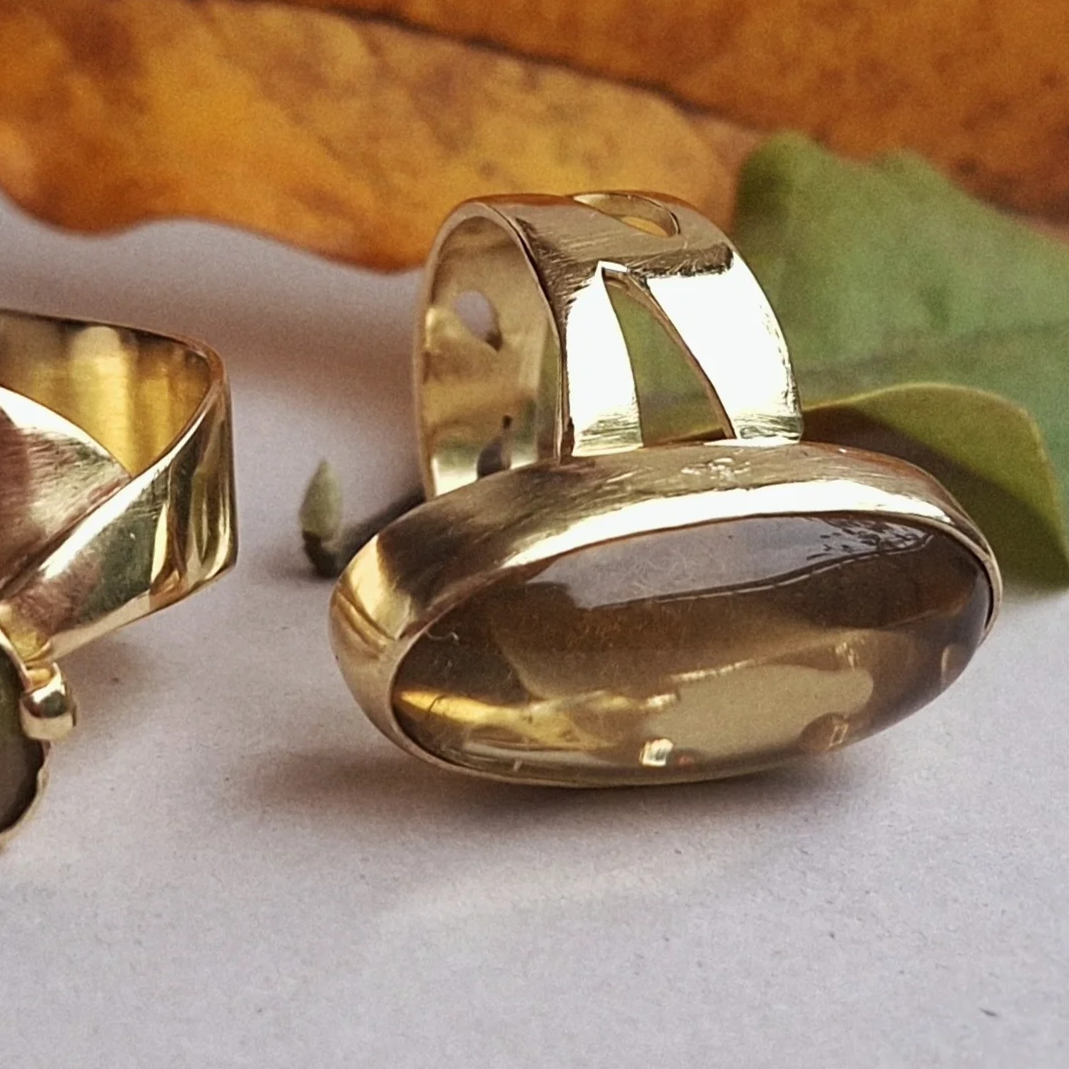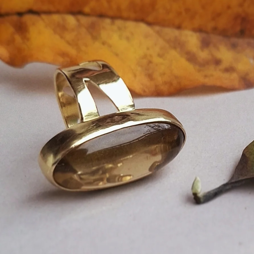 Veliki statement prsten koji svoju zanimljivost nosi u asimetriji mjedenog ringa krašenog s nekoliko detalja inspiriranih listovima u letu, a glavni ukras je lemon citrin koji tonove mijenja ovisno o svjetlosti - od svijetložute, narančaste, pa do raznih tonova smeđe.