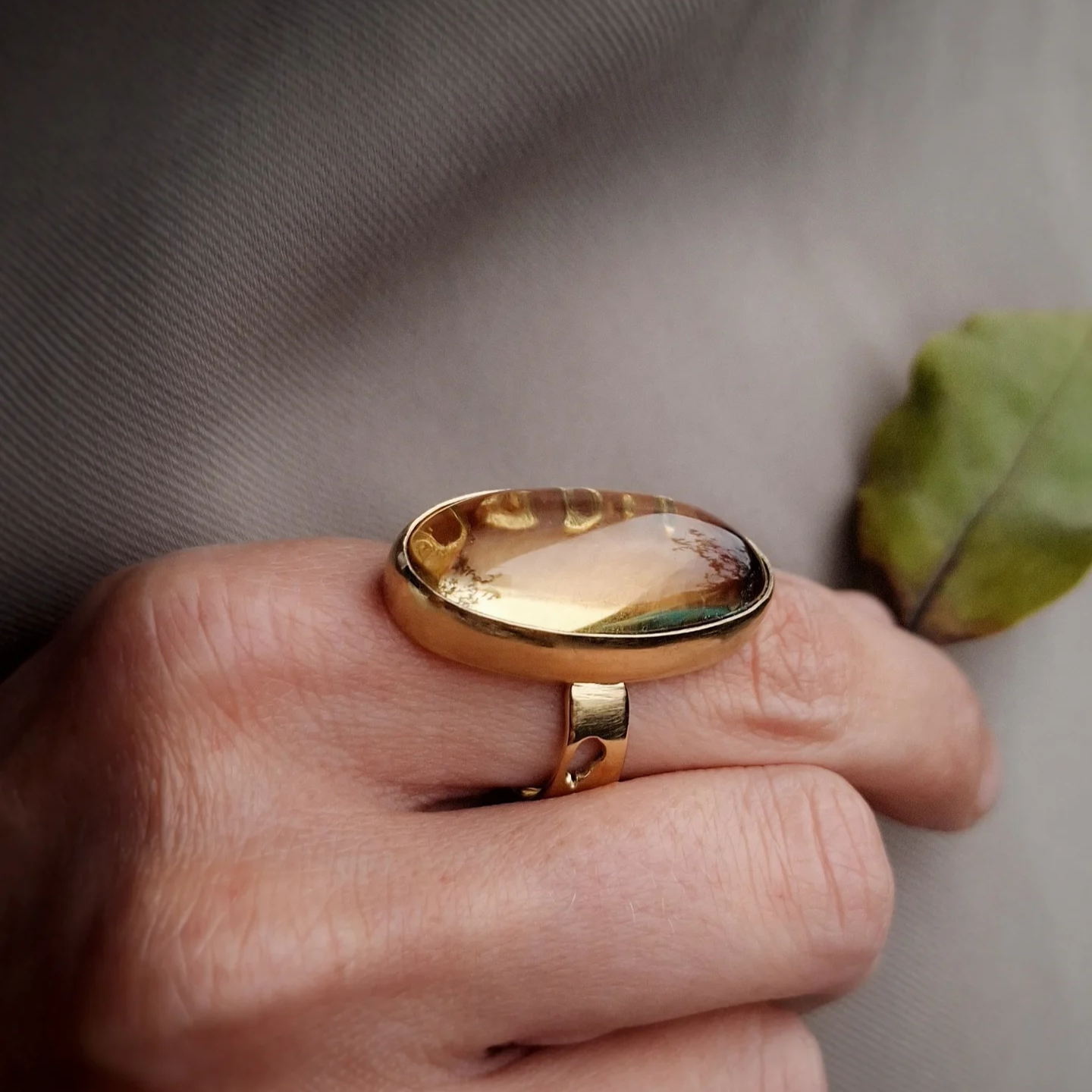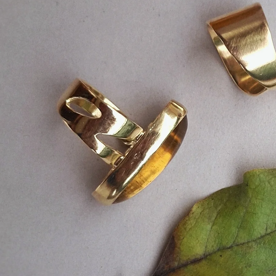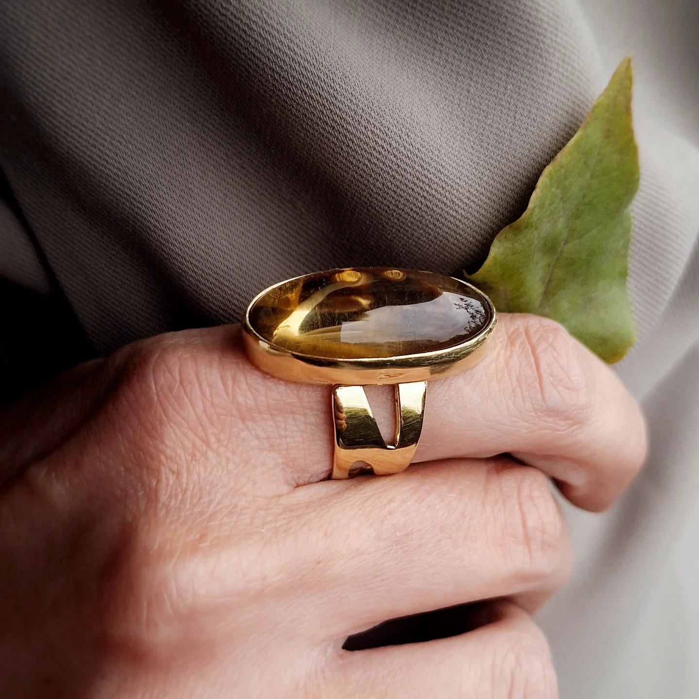 Veliki statement prsten koji svoju zanimljivost nosi u asimetriji mjedenog ringa krašenog s nekoliko detalja inspiriranih listovima u letu, a glavni ukras je lemon citrin koji tonove mijenja ovisno o svjetlosti - od svijetložute, narančaste, pa do raznih tonova smeđe.