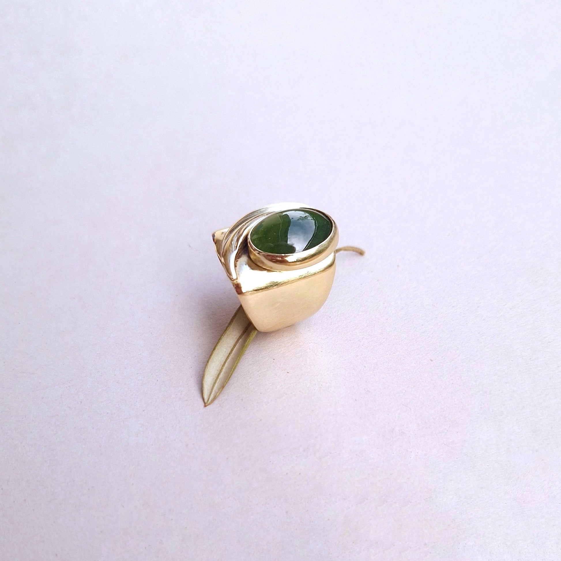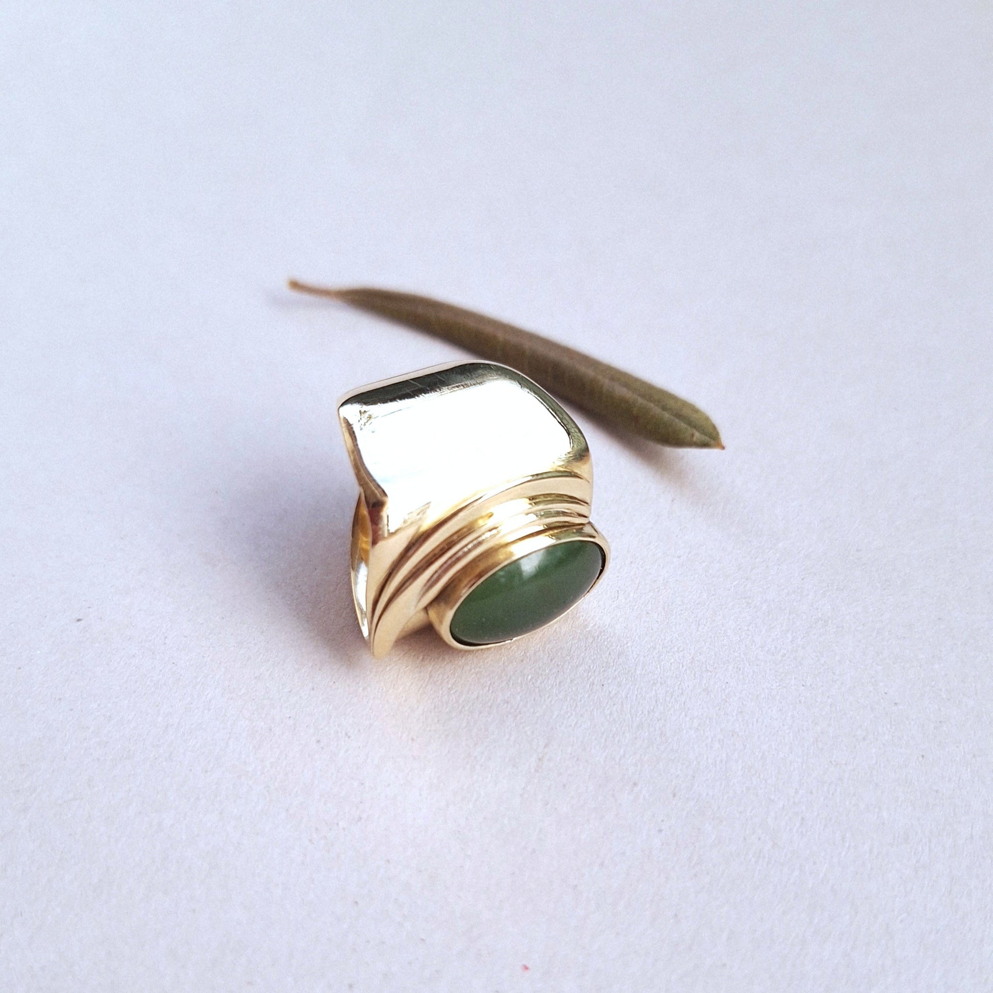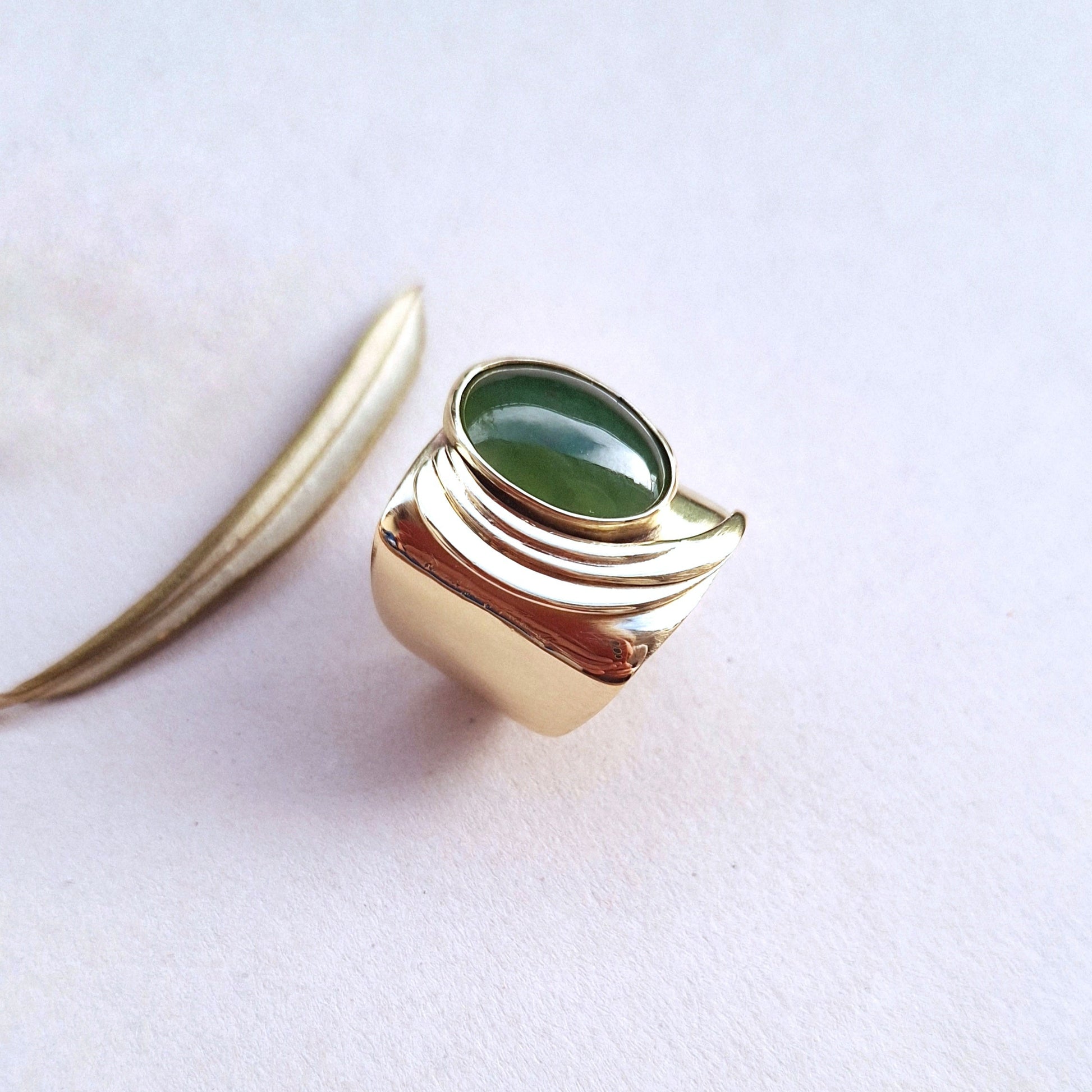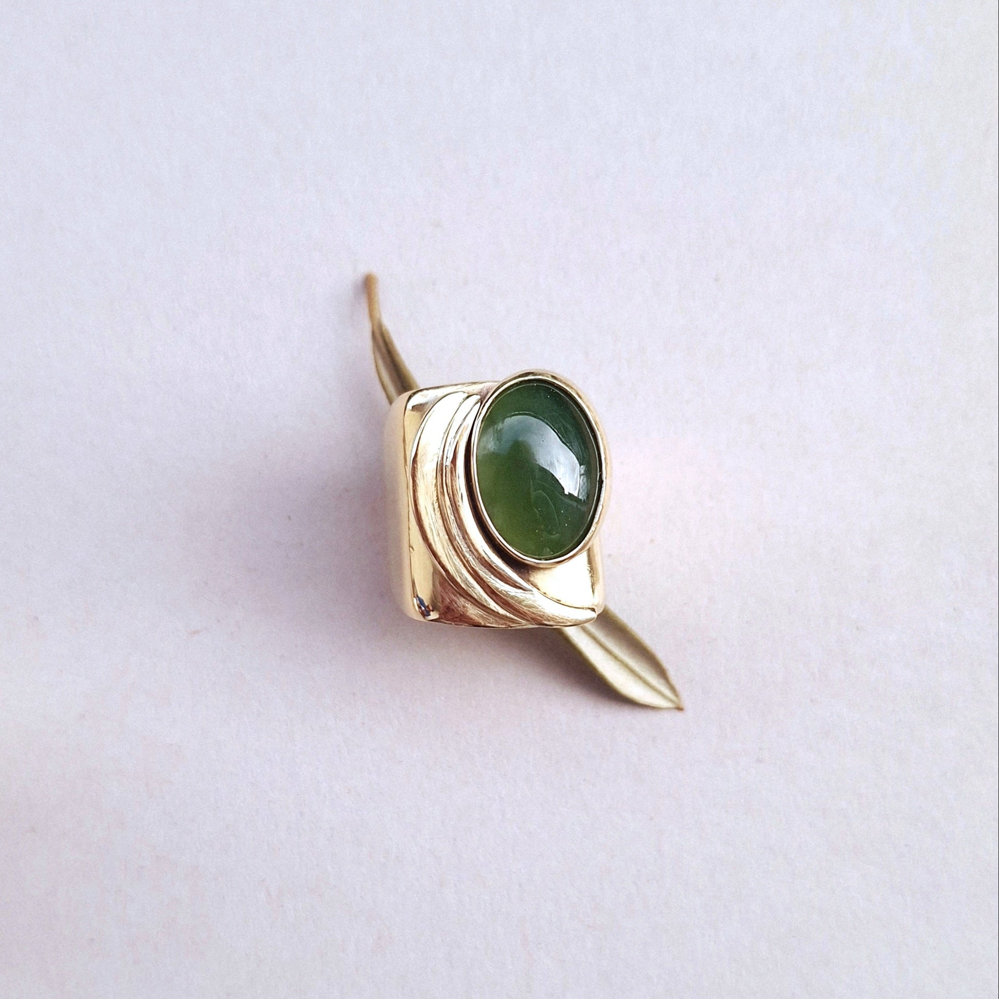 Prsten za sve one koji vole iskakati iz mase. Naglašeno upečatljiv i ženstven uz linijske detalje inspirirane maslininim listovima i ovalni zeleni žad koji prate.