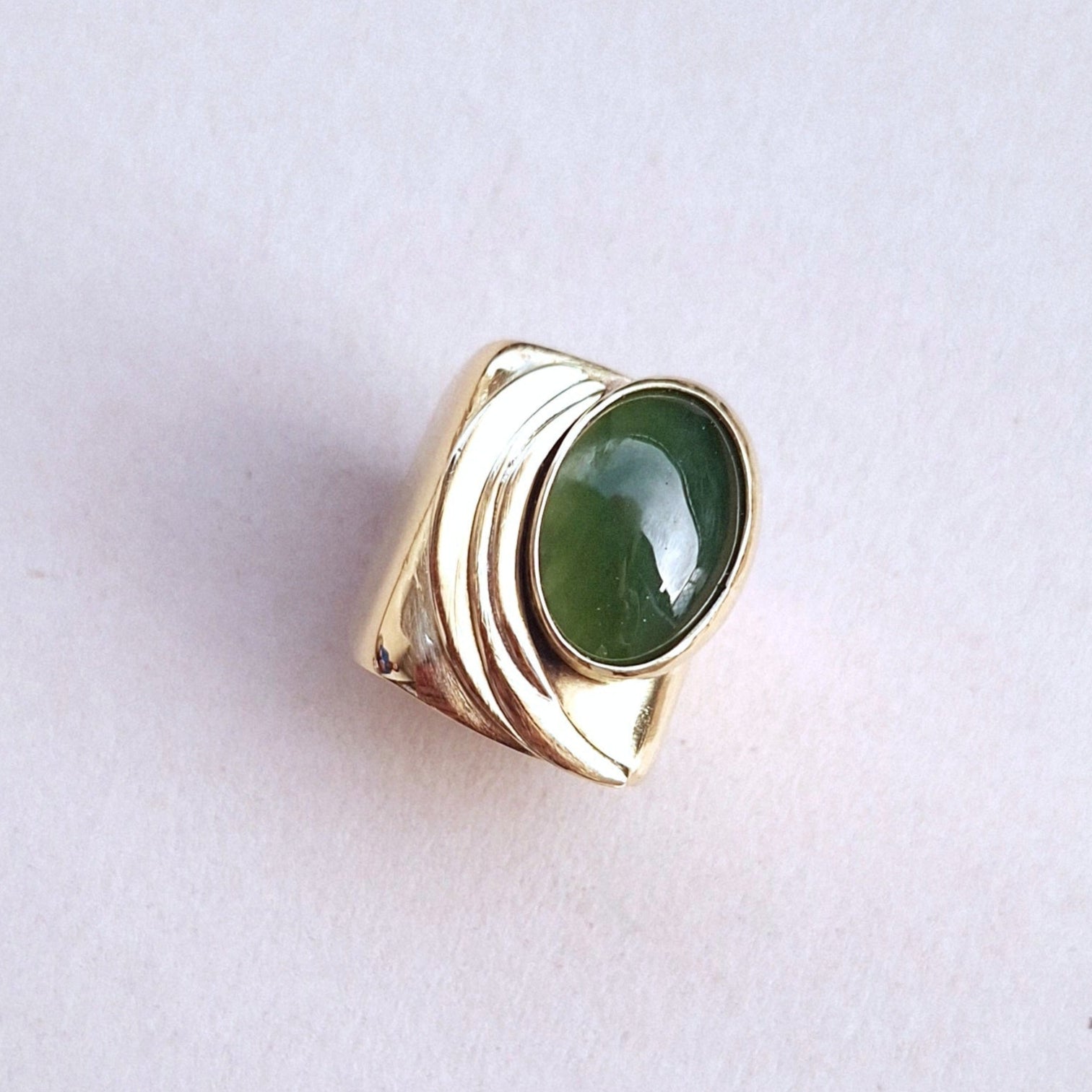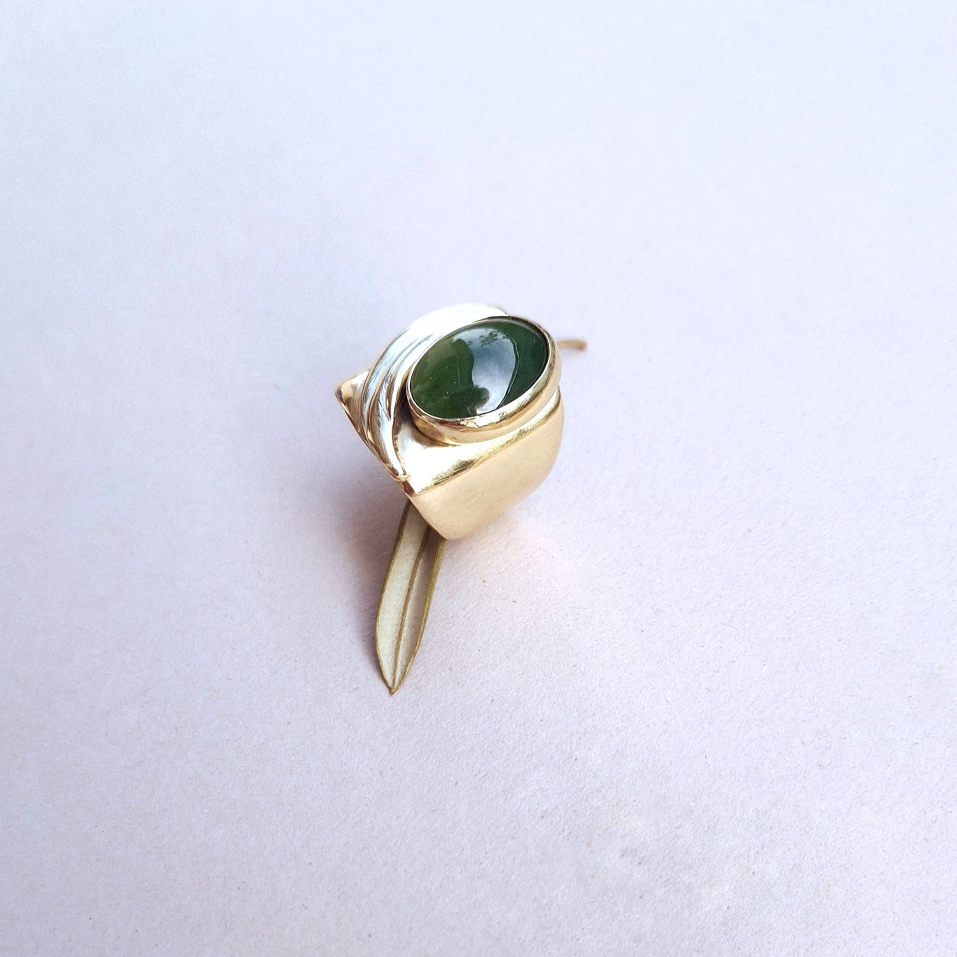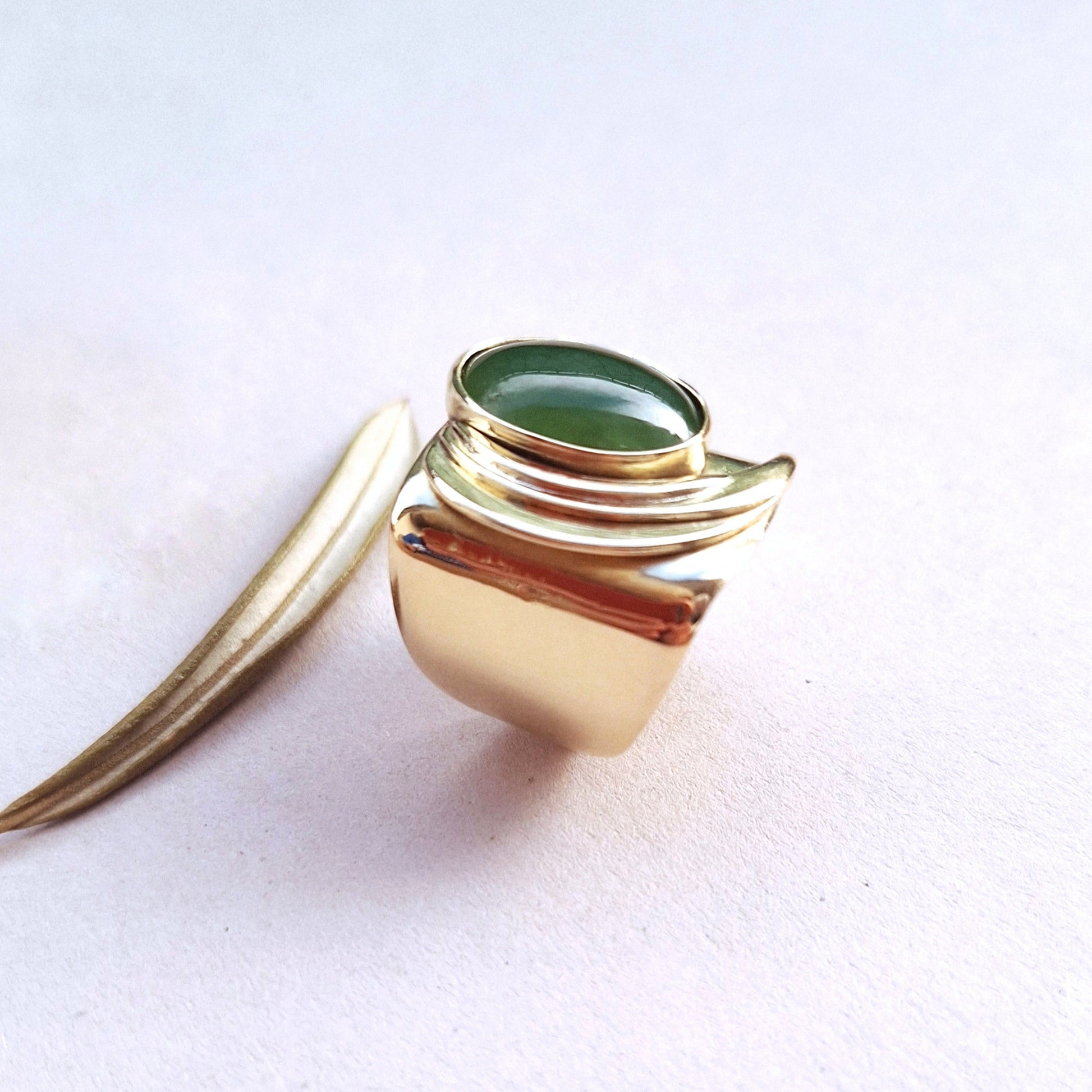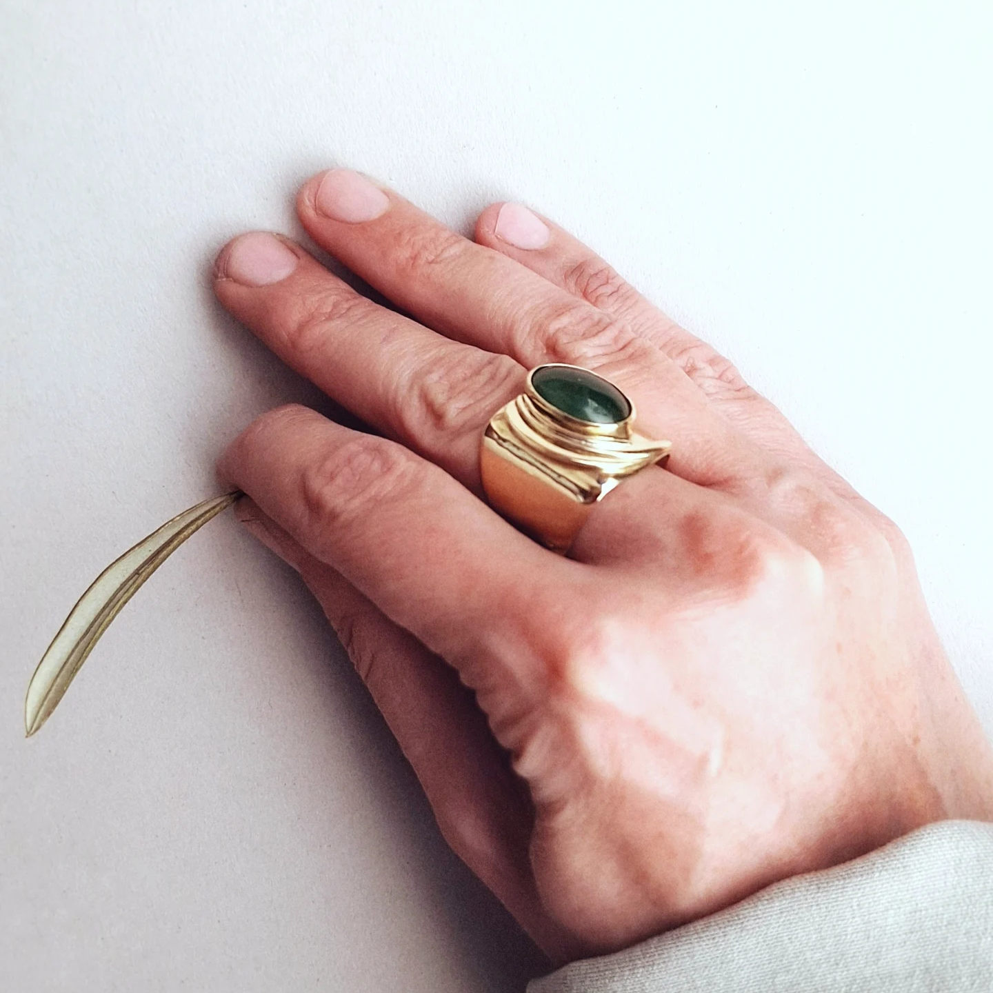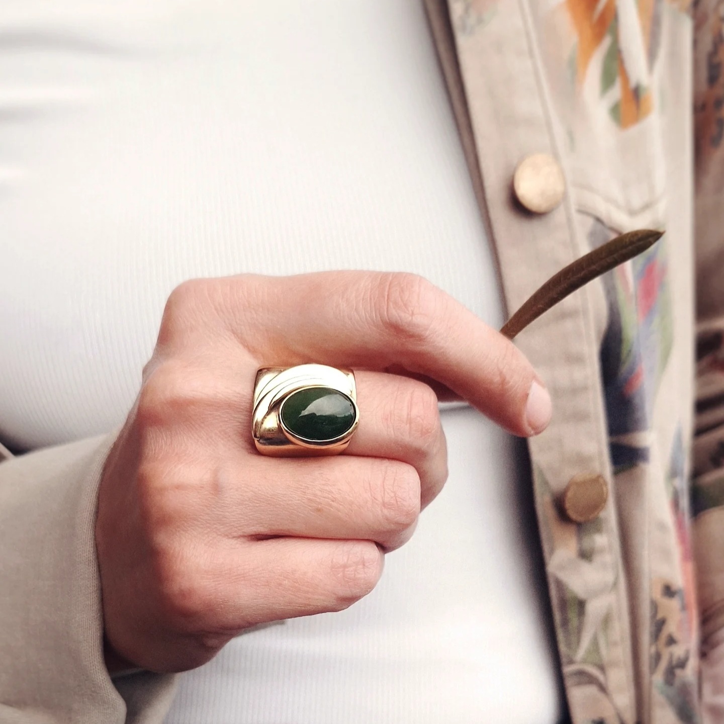 Prsten za sve one koji vole iskakati iz mase. Naglašeno upečatljiv i ženstven uz linijske detalje inspirirane maslininim listovima i ovalni zeleni žad koji prate.