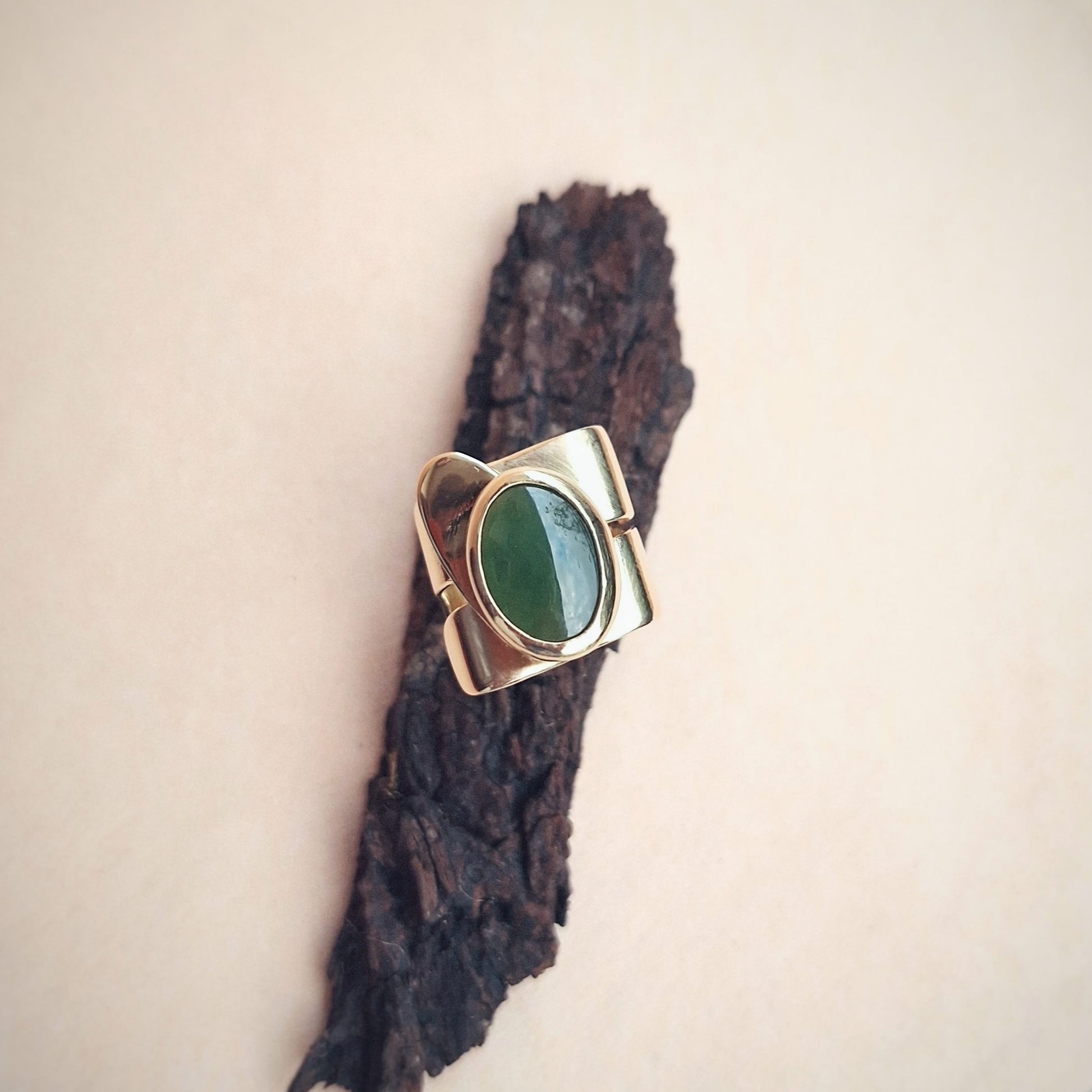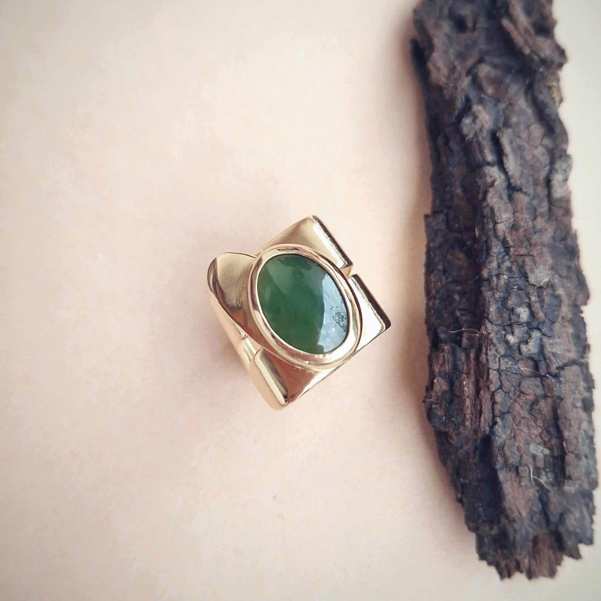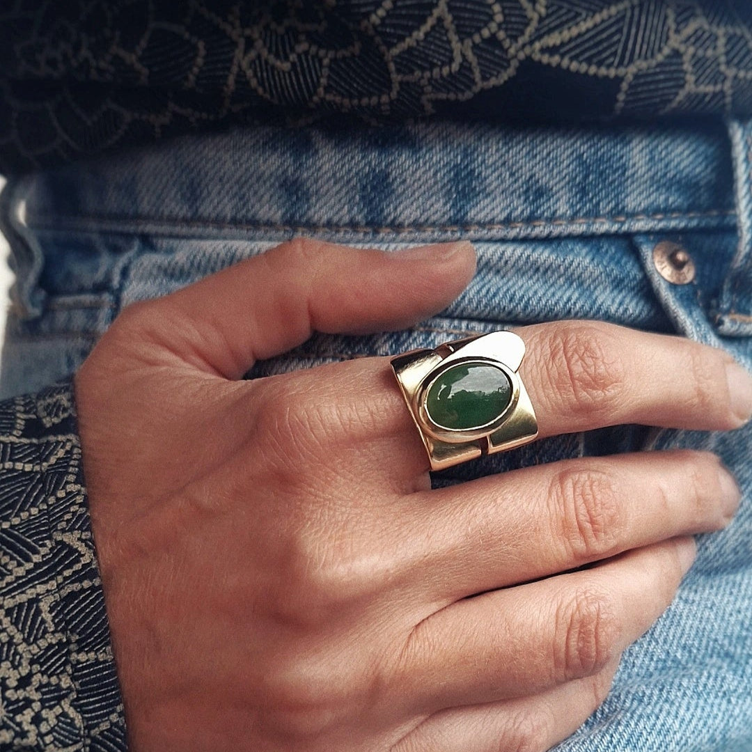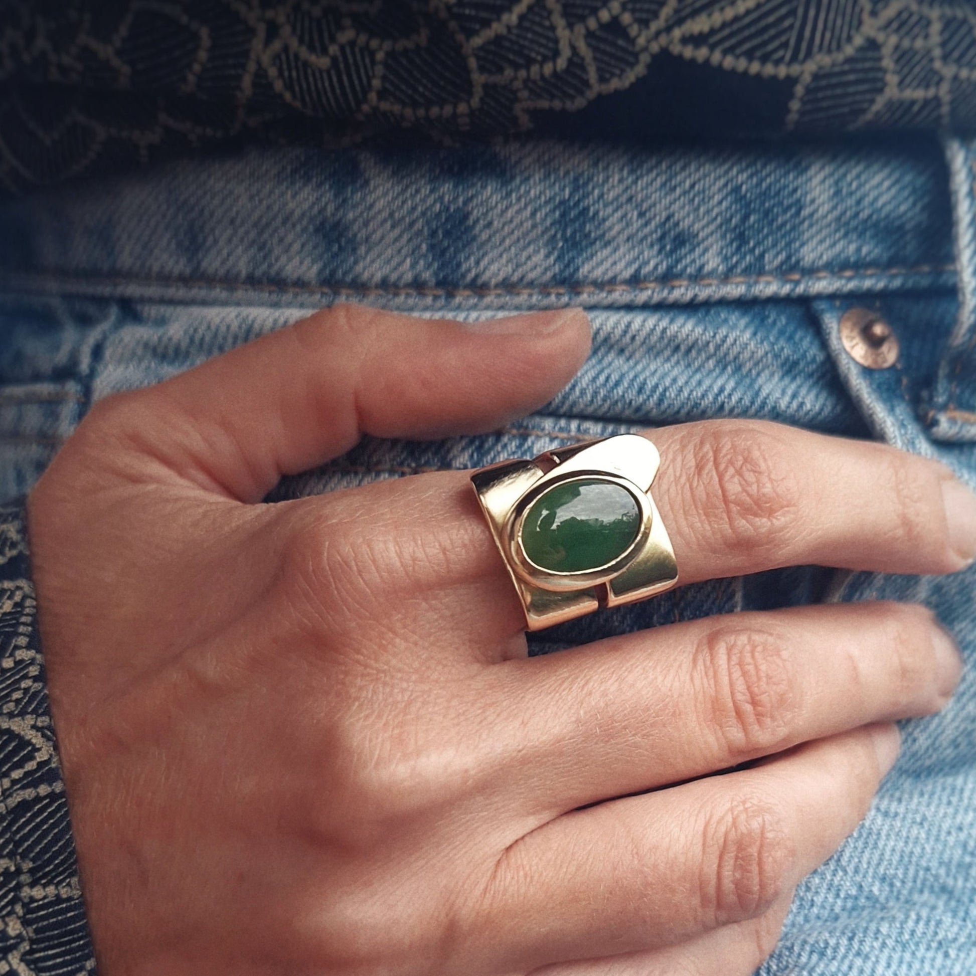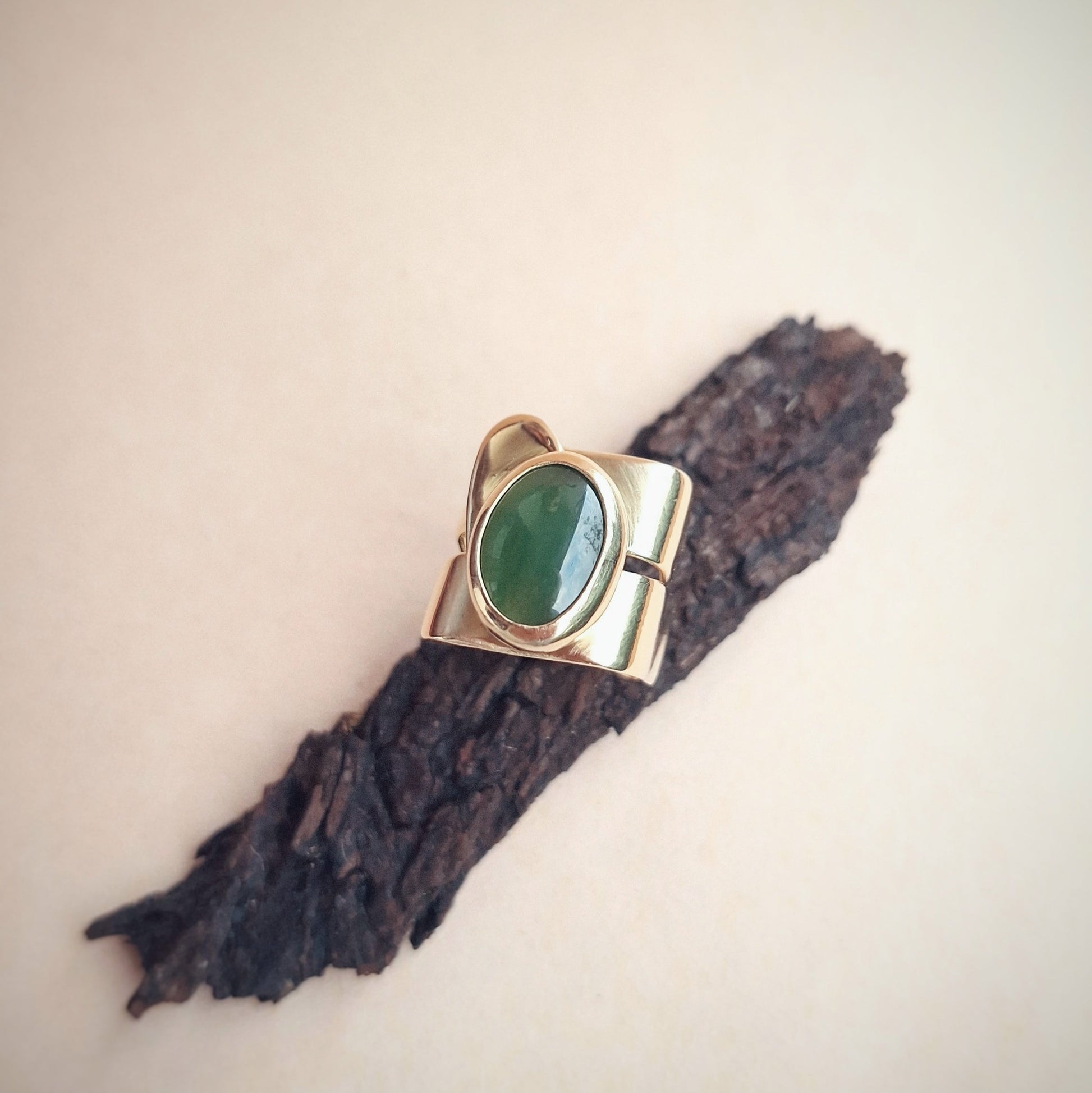 Jarko zelene nijanse žada u neobičnom kvadratnom prstenu koji je istovremeno spiralnog oblika te nosi detalj maslininog lista živahno će, i upečatljivo, krasiti (poželjno) jednobojne i minimalističke kombinacije - svojim dizajnom iskače, naglašava, pojačava.