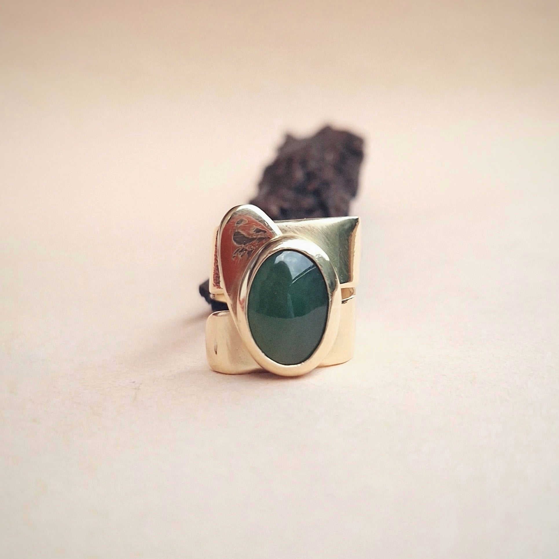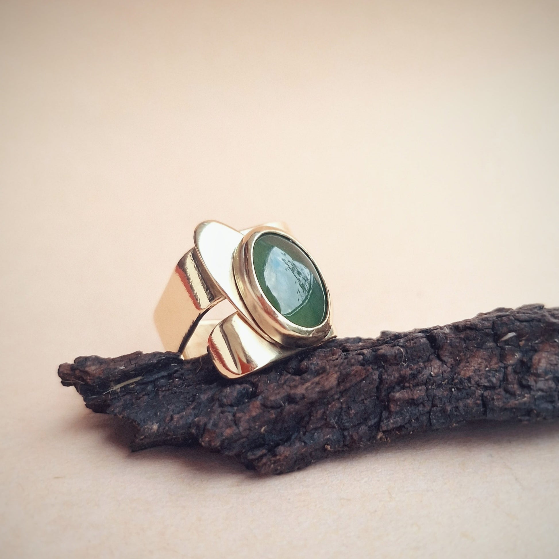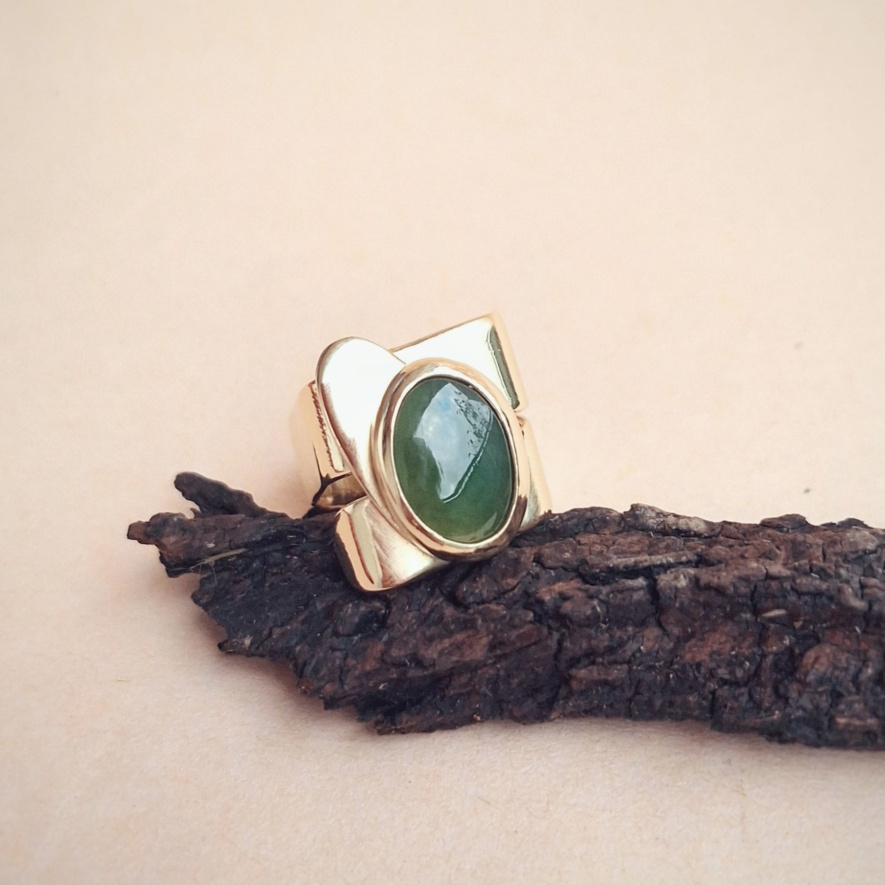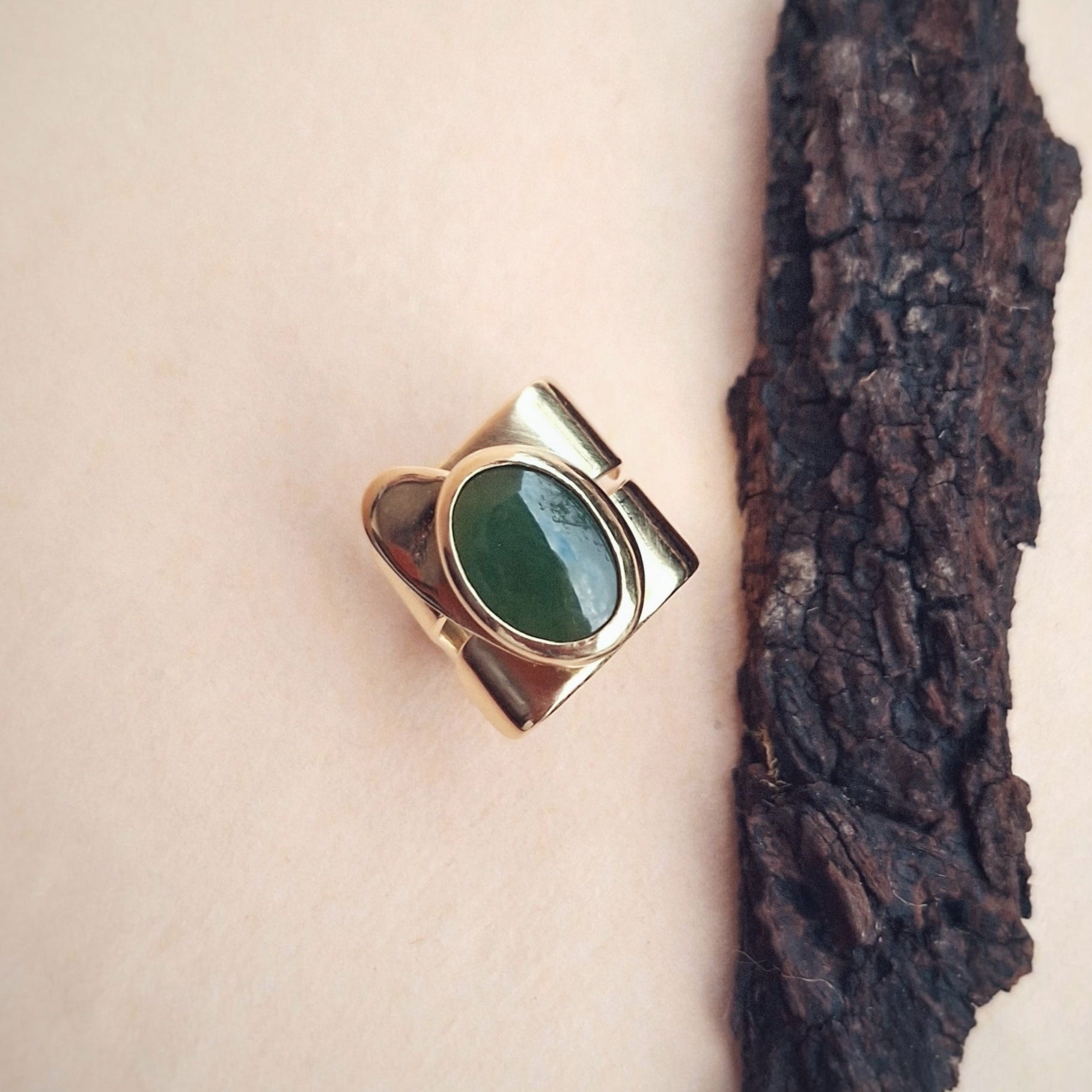 Jarko zelene nijanse žada u neobičnom kvadratnom prstenu koji je istovremeno spiralnog oblika te nosi detalj maslininog lista živahno će, i upečatljivo, krasiti (poželjno) jednobojne i minimalističke kombinacije - svojim dizajnom iskače, naglašava, pojačava.